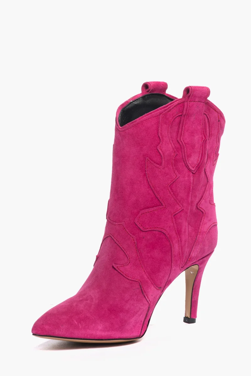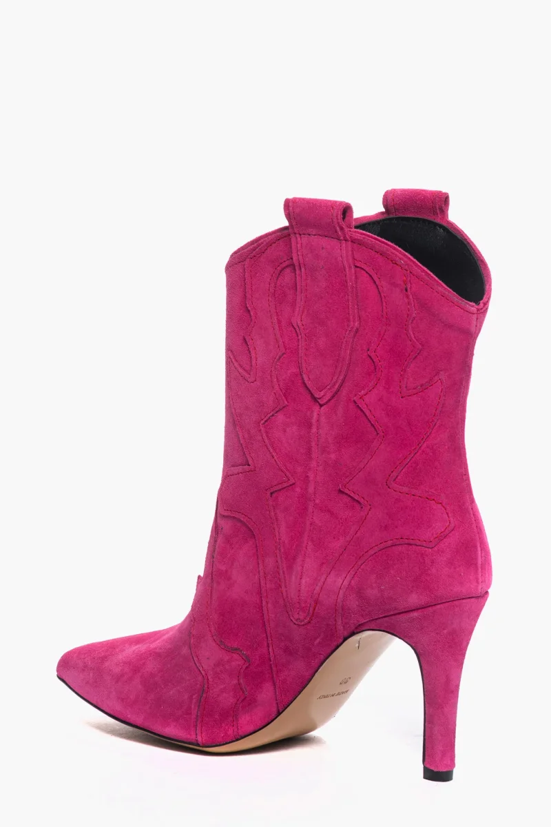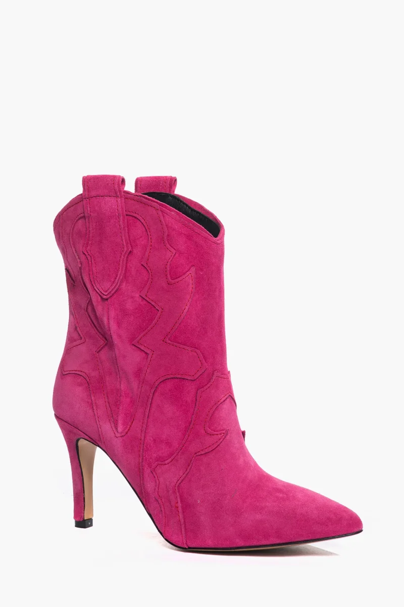 Tronchetti sopra alla caviglia in camoscio fucsia, privo di cerniera, tacco rivestito in camoscio fucsia, particolari dai disegni su entrambi i lati, altezza 8 cm. Calzata giusta, punta stretta. Calzature realizzate in modo artigianale, rigorosamente Made in Italy.