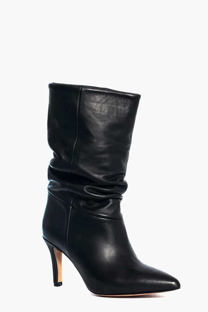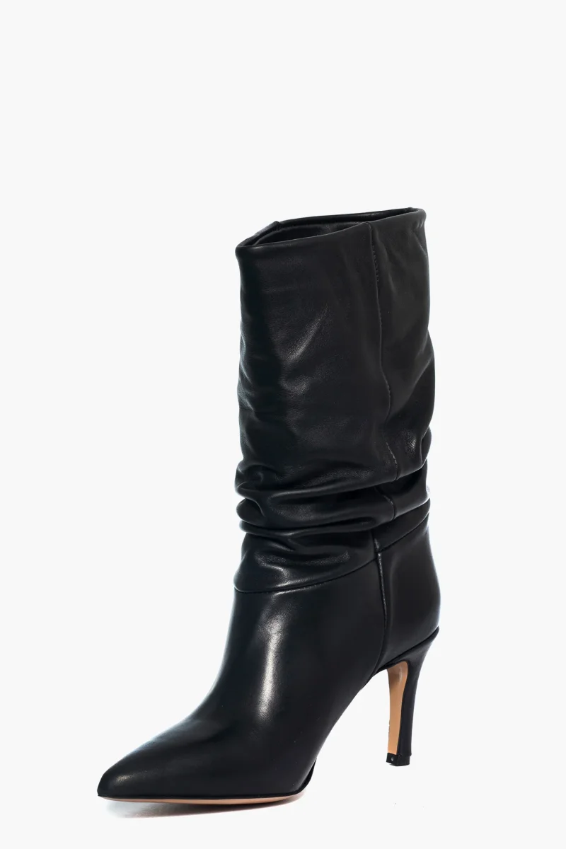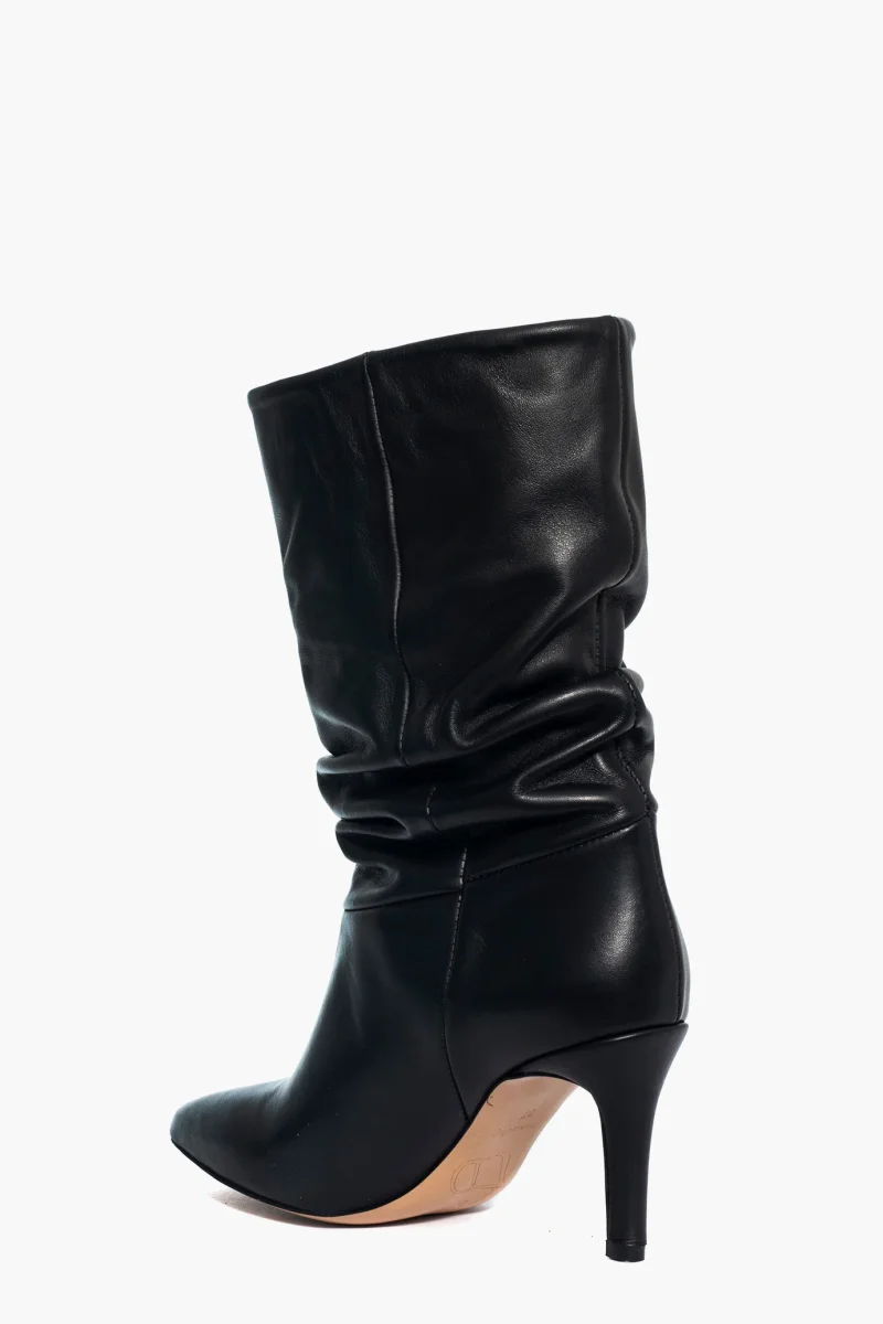 Stivaletti in pelle nero con effetto aggrappato al polpaccio e punta leggermente stretta. Interni e sottopiede in similpelle. Privo di cerniera, tubolare. Calzata regolare, taglia italiana, tacco rivestito in pelle nero, altezza 7 cm. Calzature realizzate modo artigianale, rigorosamente made in Italy.