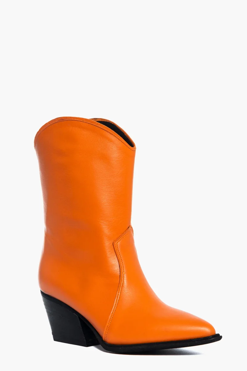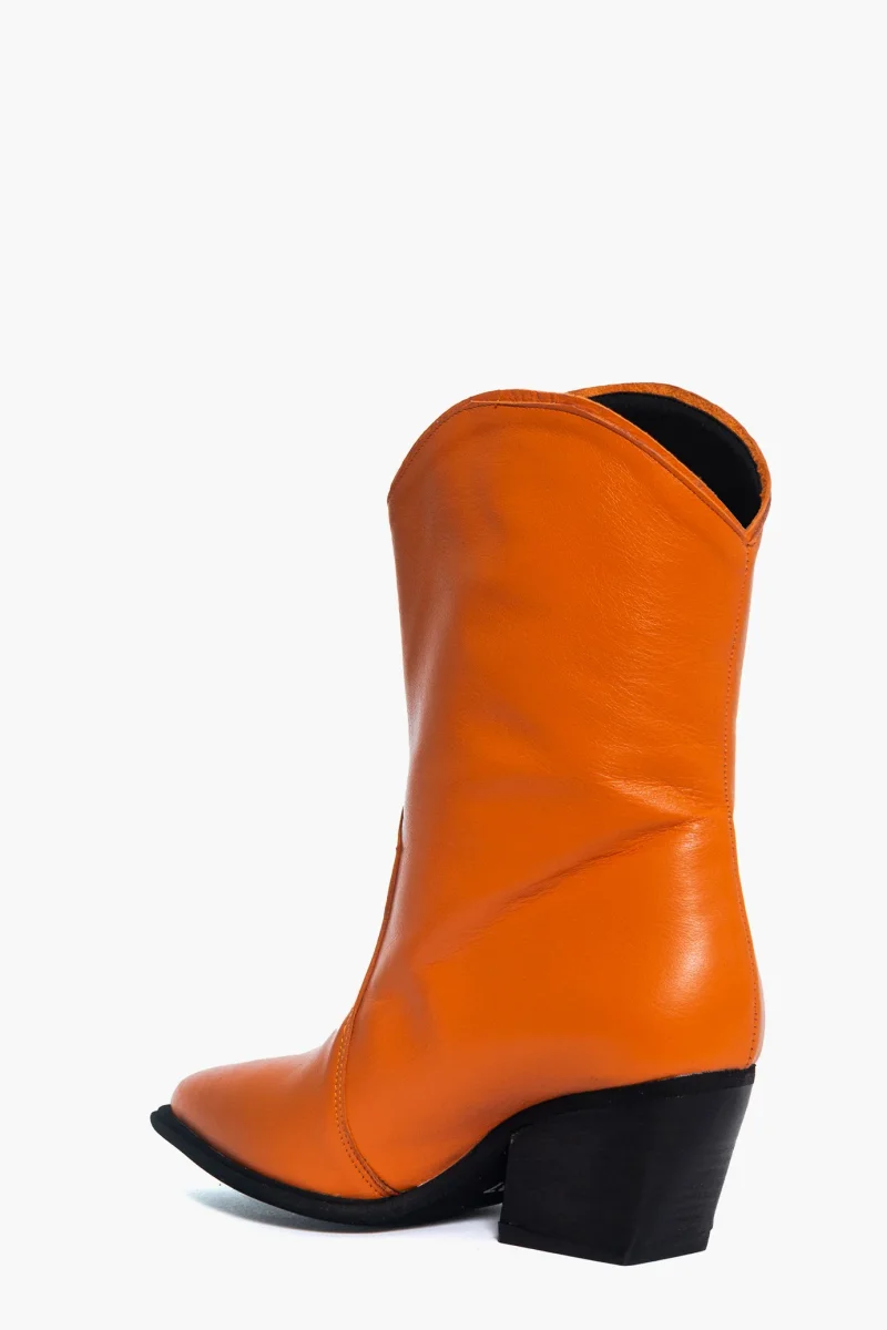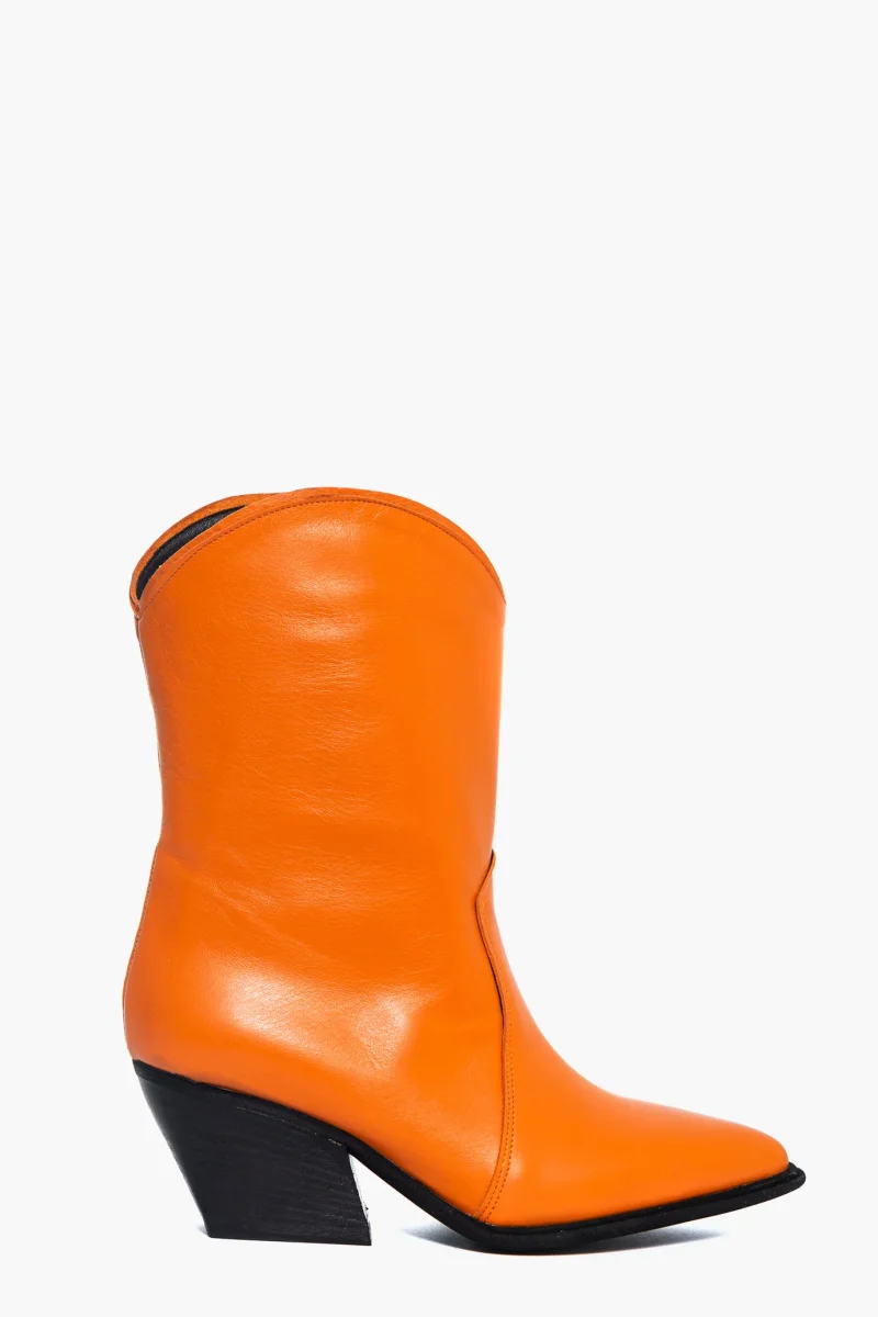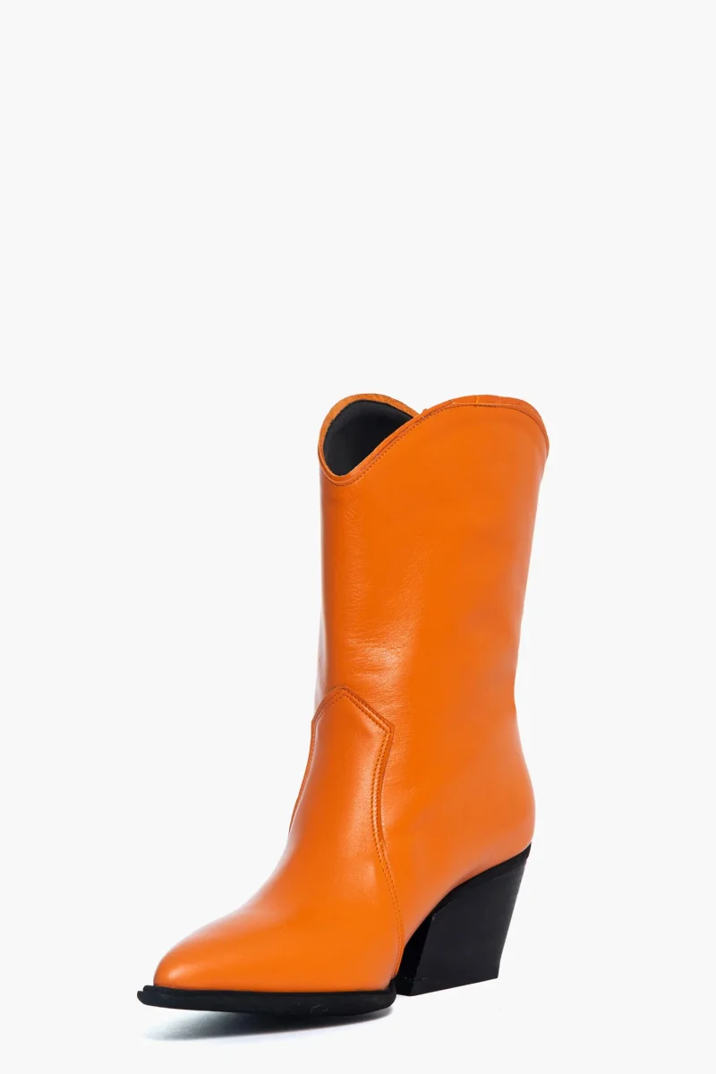 Stivale in pelle arancio al polpaccio, interni e sottopiede in similpelle, suola nera, altezza tacco 7, privo di cerniera, calzano giuste punta leggermente stretta, forma texana. Calzature realizzate in modo artigianale, rigorosamente made in Italy.