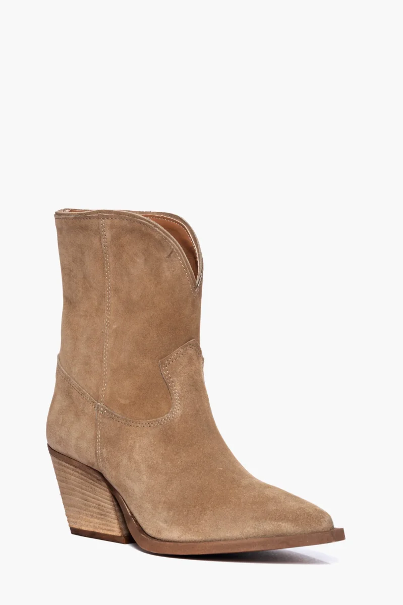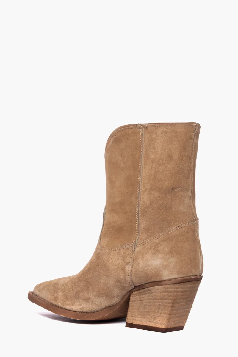 Stivaletti in camoscio taupe, ricamo in punta in tinta, con zip interno piede, interni e sottopiede in similpelle, tacco neutro spazzolato, altezza 7 cm. Calzano regolari. Calzature realizzate in modo artigianale, rigorosamente made in Italy.