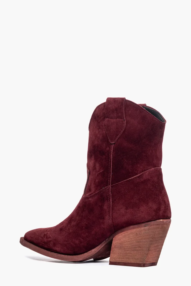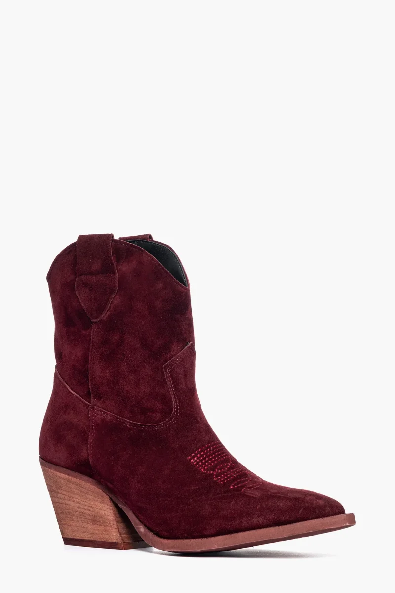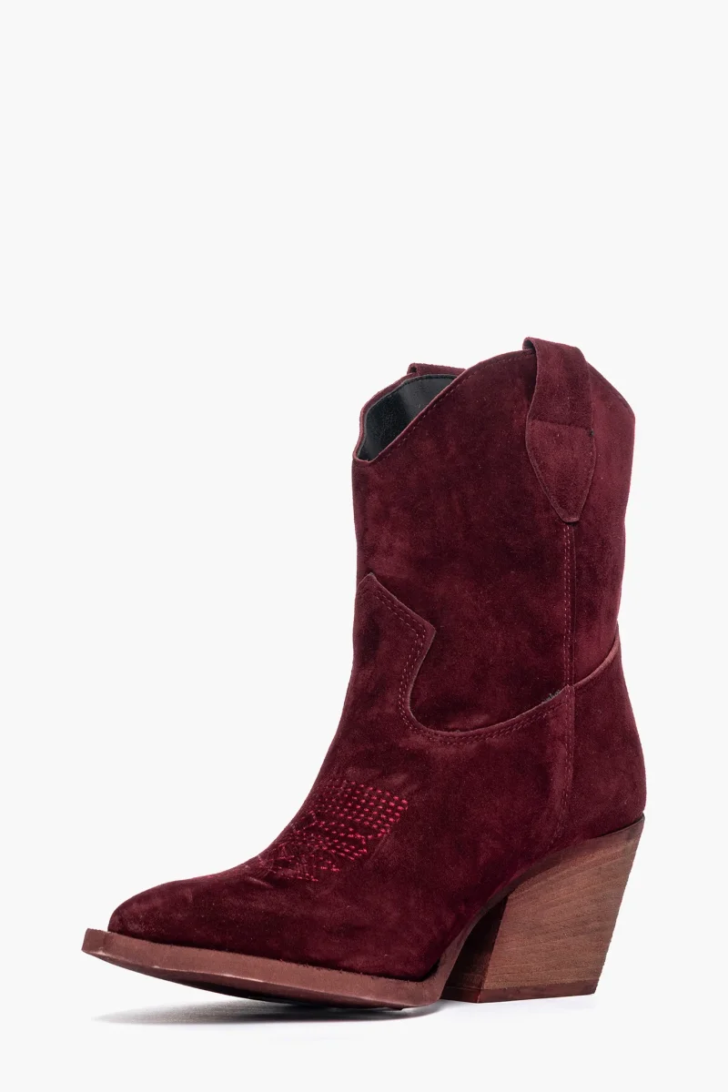 Stivaletti in camoscio bordeaux, ricamo in punta in tinta, interni e sottopiede in similpelle, tacco neutro spazzolato, altezza 7 cm. Calzano regolari. Calzature realizzate in modo artigianale, rigorosamente made in Italy.