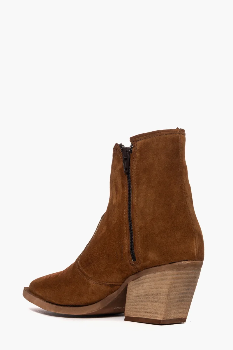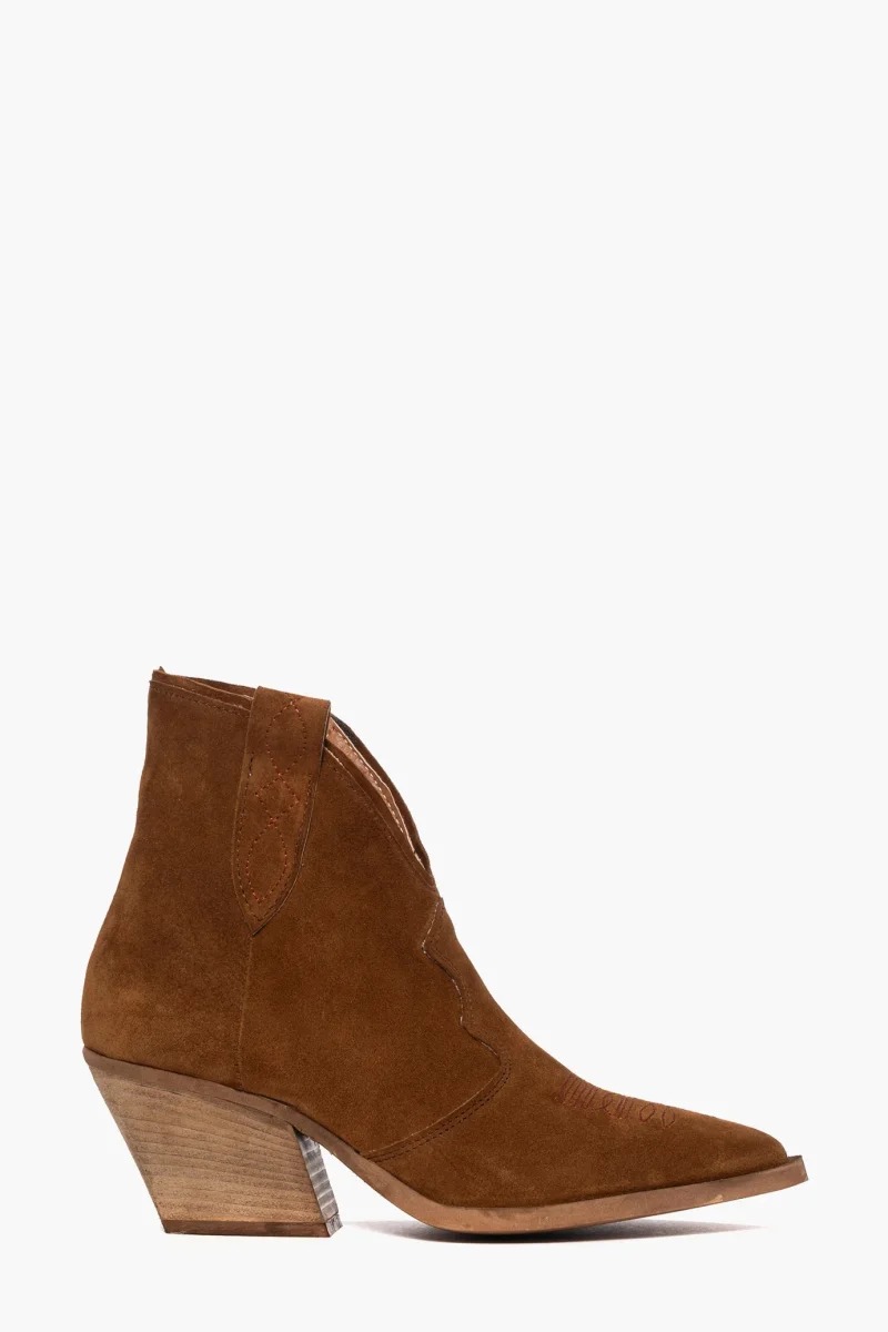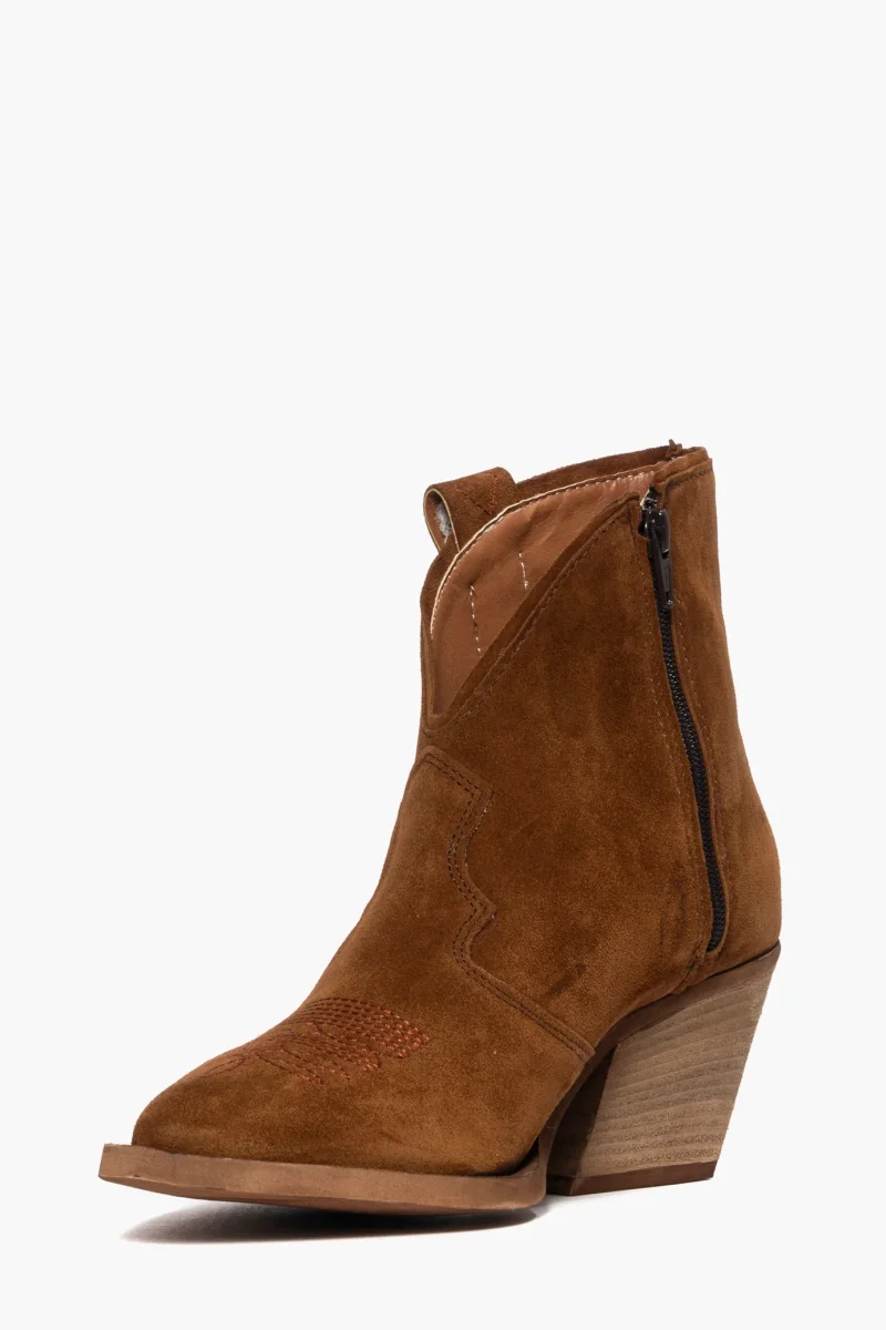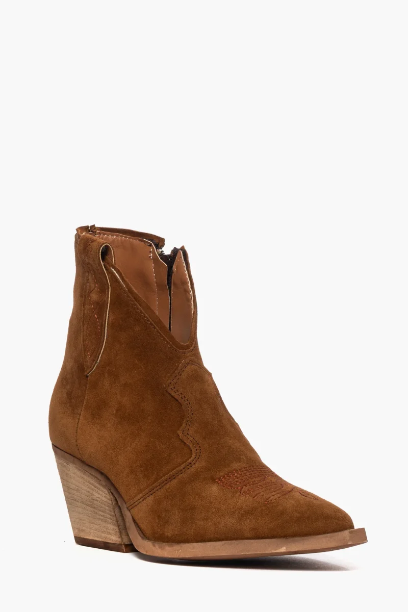 Stivaletti Irene Trend in camoscio cuoio con scollo in avanti, ricamo in punta in tinta, con zip interno piede, interni e sottopiede in similpelle, tacco neutro spazzolato, altezza 7 cm. Calzano regolari. Calzature realizzate in modo artigianale, rigorosamente made in Italy.