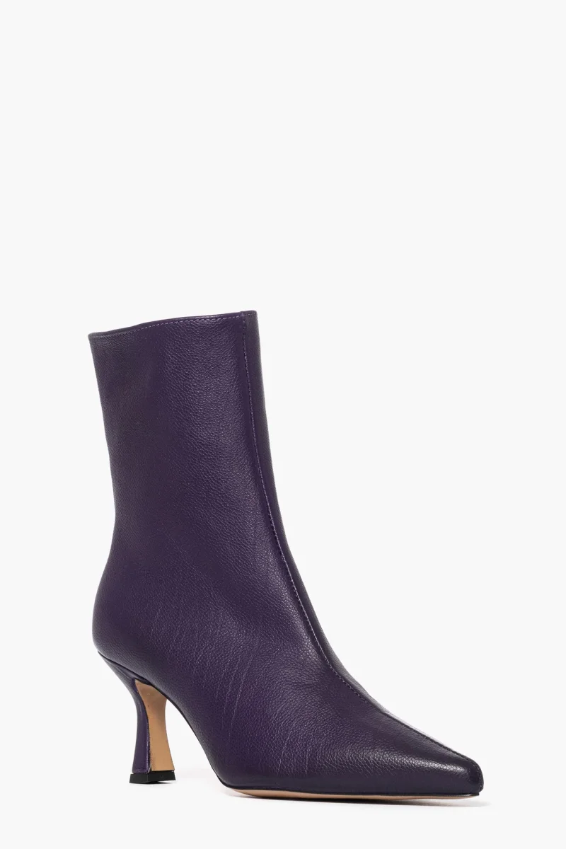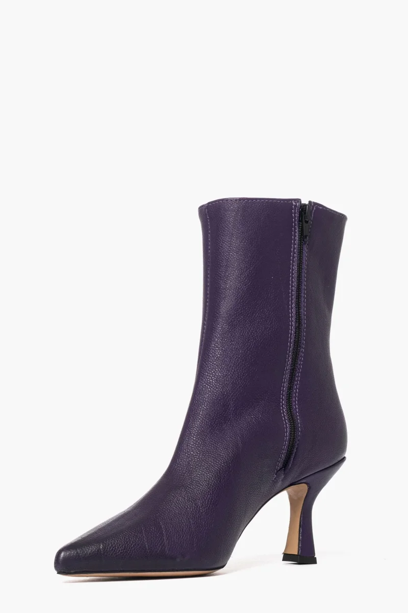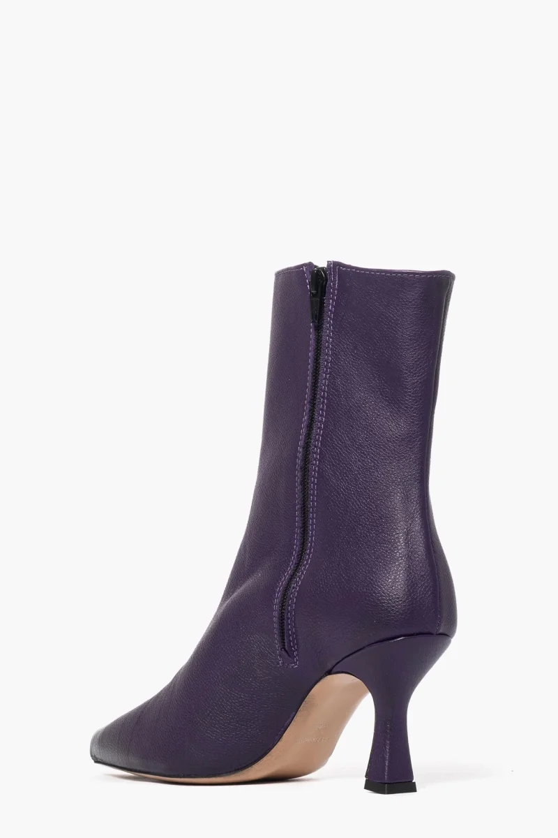 Stivaletti in pelle bottalata viola, con cerniera interno piede, lo rende più aderente alla caviglia, tacco rivestito, altezza 8.5, interni in similpelle. Calzano regolari, punta in avanti. Calzature artigianali, made in Italy.