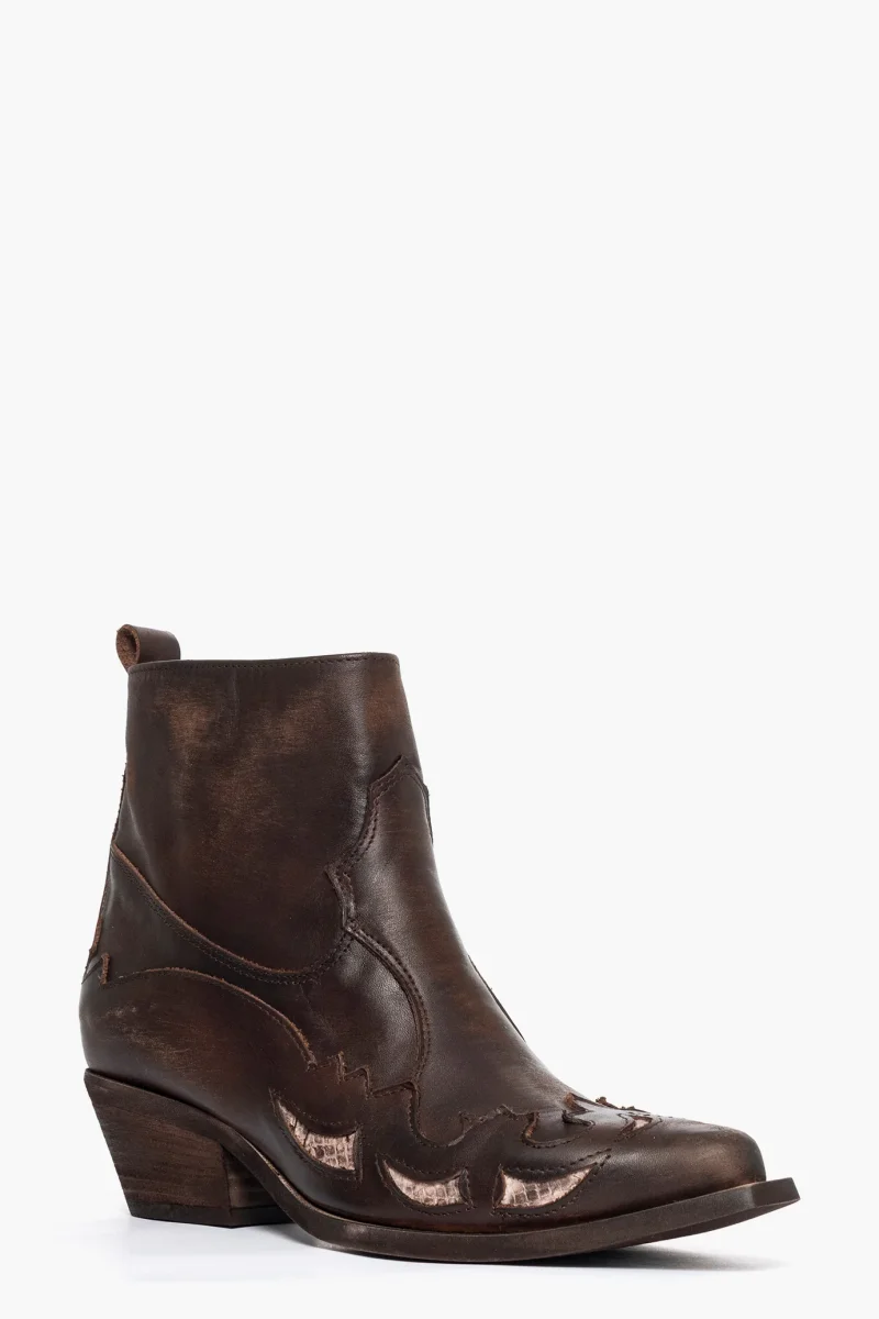 Stivaletti in nabuk marrone spazzolato e riporti in pitone, con cerniera, forma tecsana, interni in similpelle, suola neutra spazzolata in tinta, altezza 4. Calzano comodi. Calzature artigianali, made in Italy.