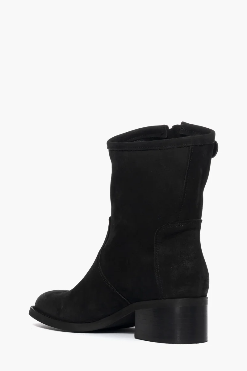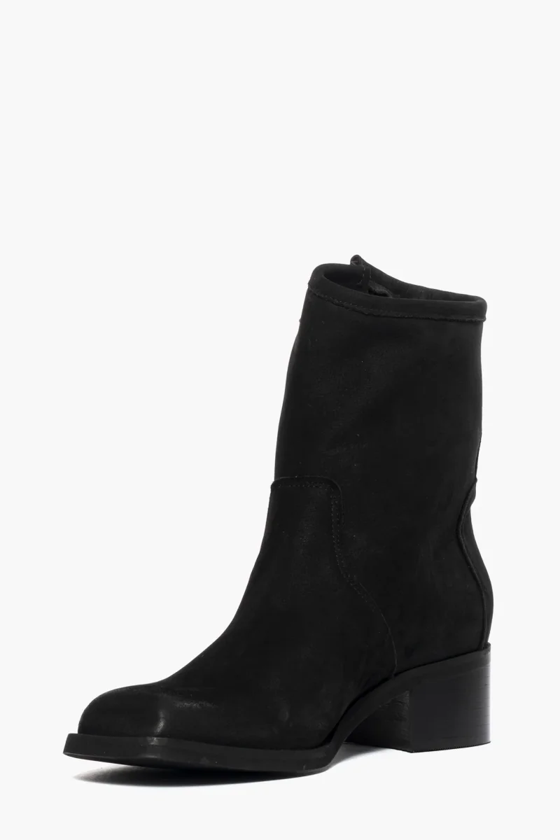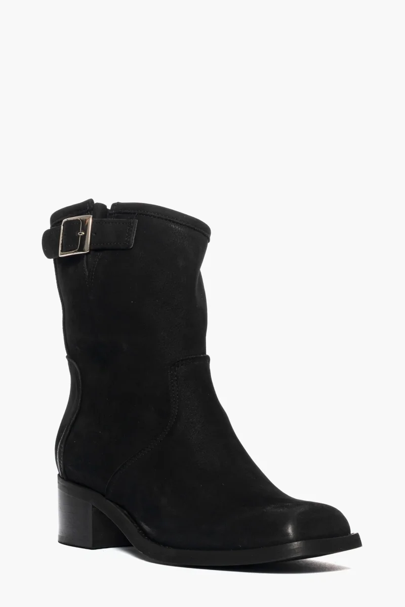 Stivaletti in nabuk nero con fibbia, sopra alla caviglia, tacco 3, punta in avanti tonda, calzano giusti, interni in similpelle.