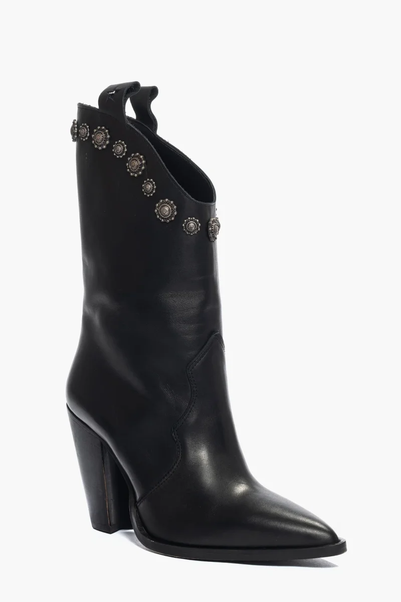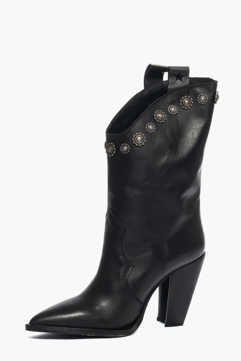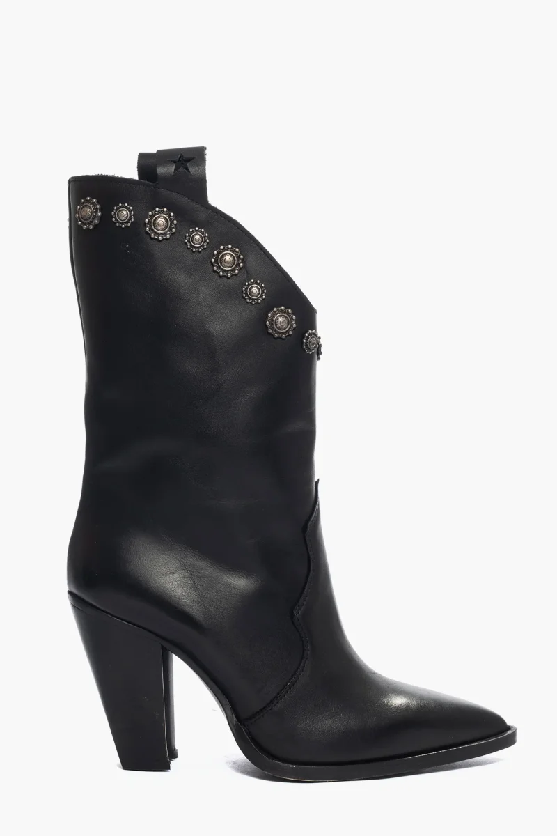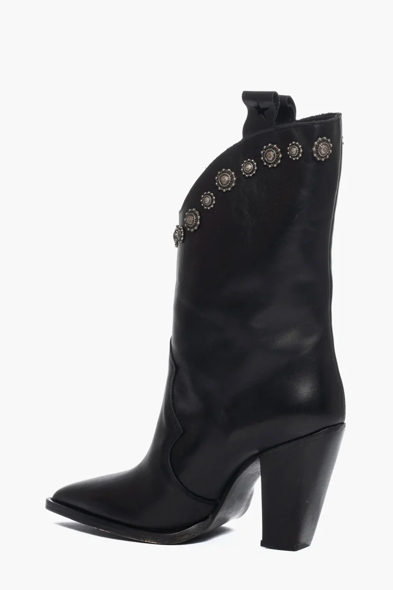 Stivali in pelle nero al polpaccio, con borchie dalla forma particolare colore antracite, privo di cerniera, forma texana, altezza 9 tacco nero. Calzano regolari, punta leggermente stretta in avanti, interni e sottopiede in similpelle. Calzature realizzate in modo artigianale, rigorosamente Made in Italy.