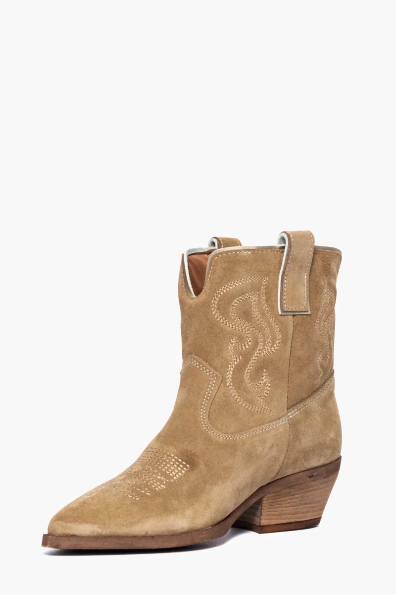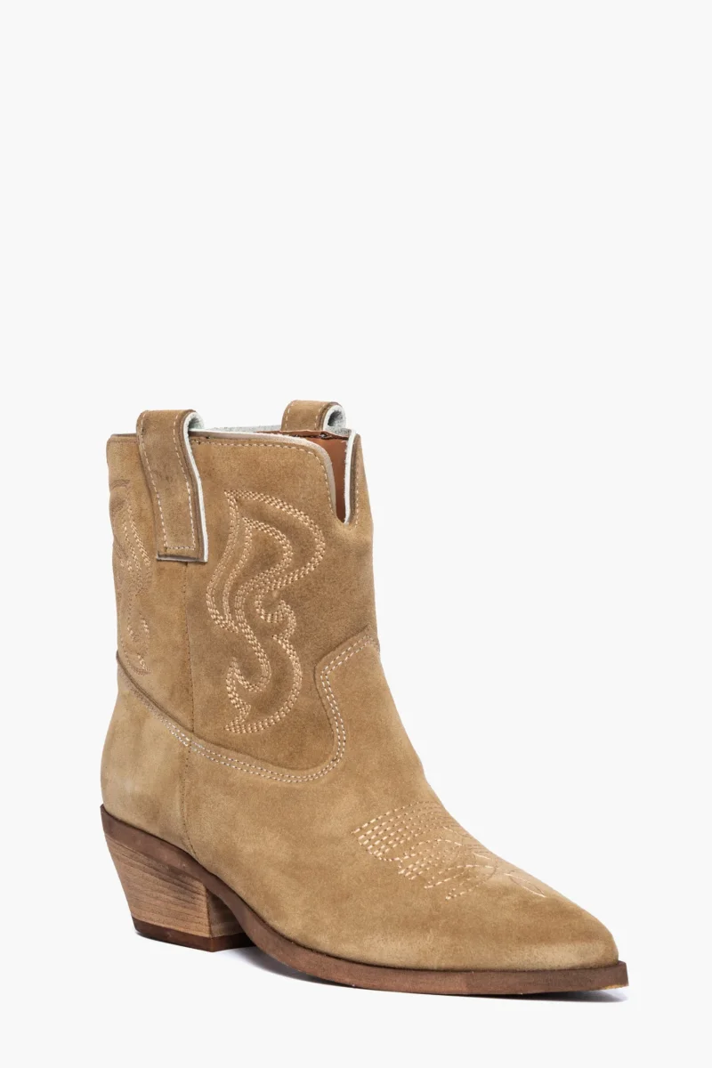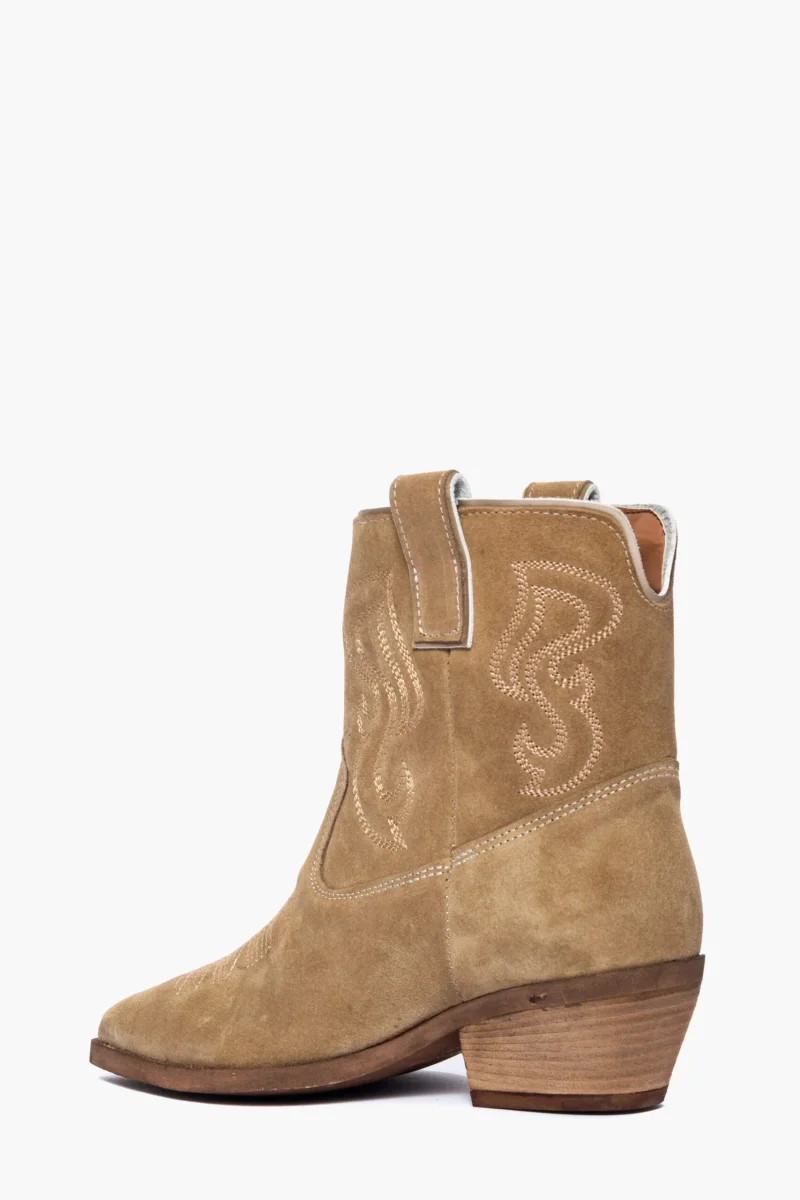 Stivaletti New Old 1220 in camoscio beige biscotto con riporti in oro, ricamo in grezzo. Calzano regolari, punta stretta in avanti. Suola spazzolata, altezza5.