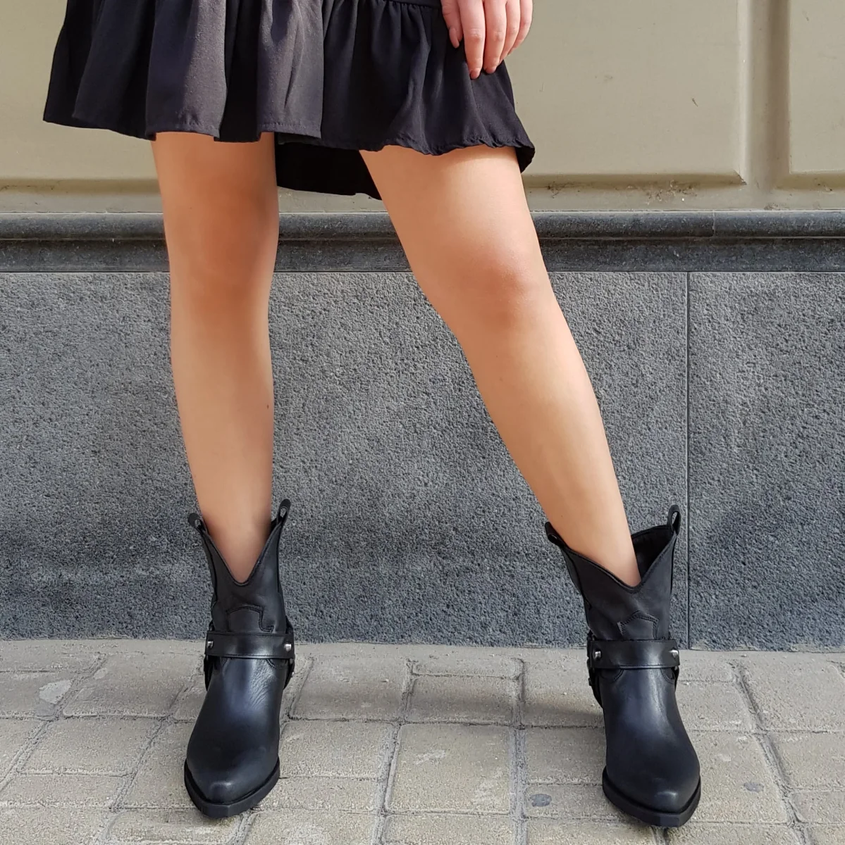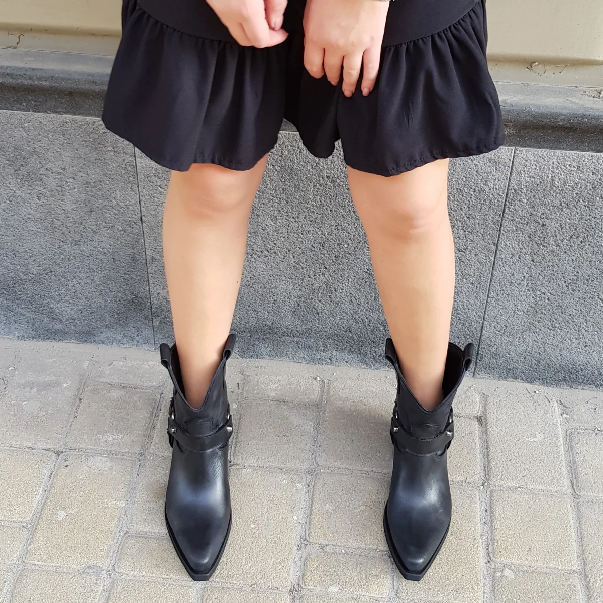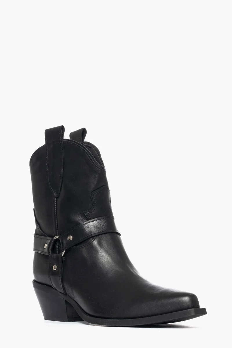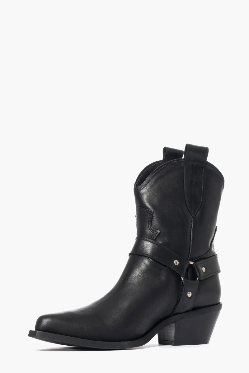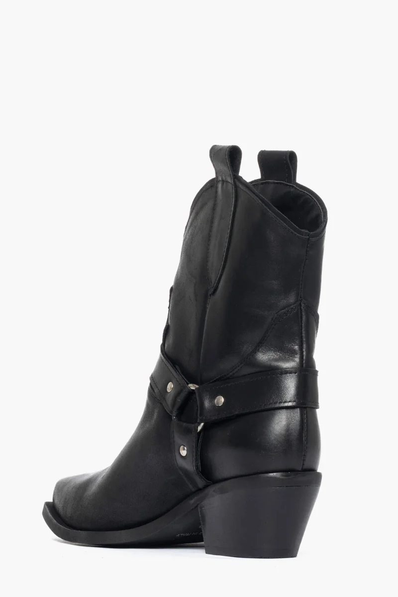 Stivaletti in pelle nero spazzolato con accessori in argento ai lati dello stivaletto, privo di cerniera, interni e sottopiede in similpelle, tacco altezza 3 cm, suola in micro duro. Calzano comodi, calzature artigianali, made in Italy.