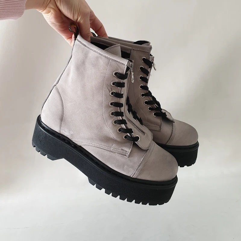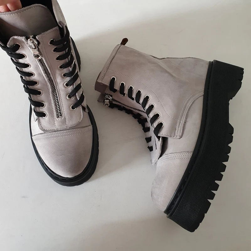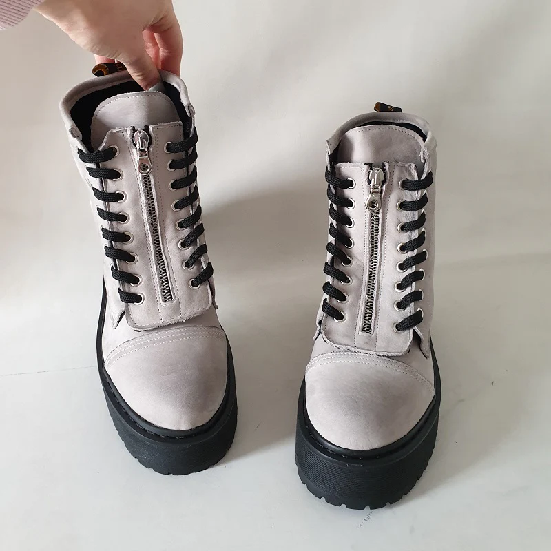 Stivaletti in pelle nabuk ghiaccio spazzolato a mano con il nero, con lacci neri e occhielli in colore argento, con accessorio in pelle nero con cerniera in colore argento al centro dello stivaletto removibile, molto particolari, suola in pvc colore nero con bordo cucitura in colore nero, sottopiede in similpelle. Calzature realizzate artigianalmente, rigorosamente made in Italy.