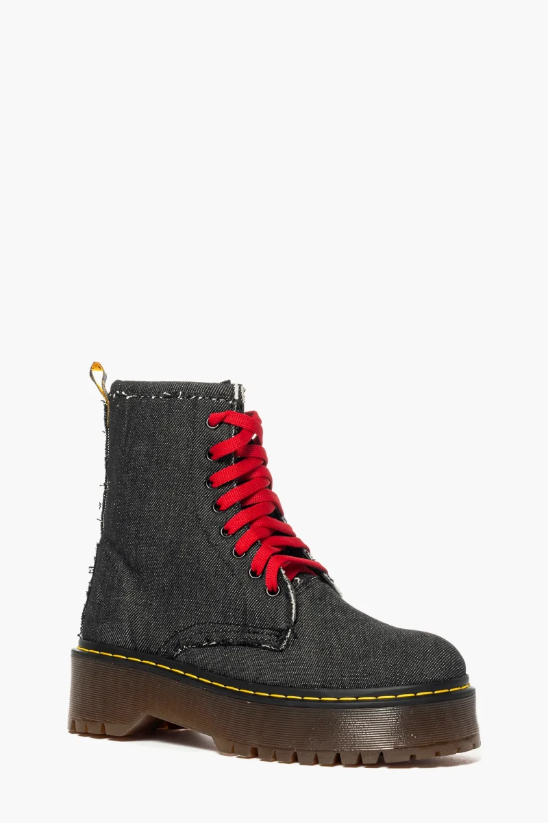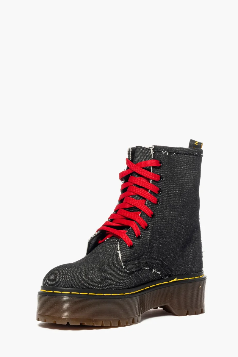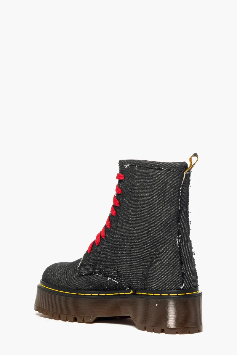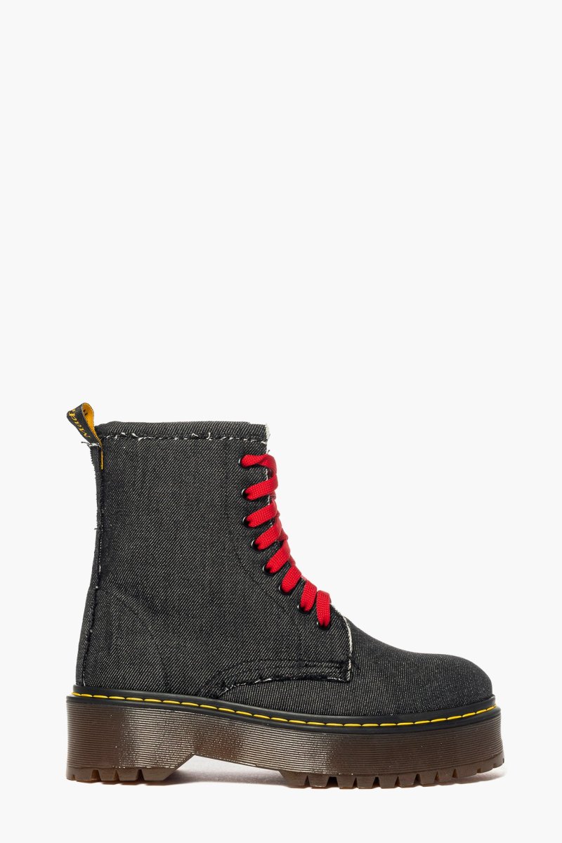 Stivaletti in jeans nero, occhielli in colore nero, interni e sottopiede in similpelle, lacci rossi e suola in pvc colore petrolio, altezza 5, marchio Lia Diva. Calzature realizzate artigianalmente, rigorosamente made in Italy.