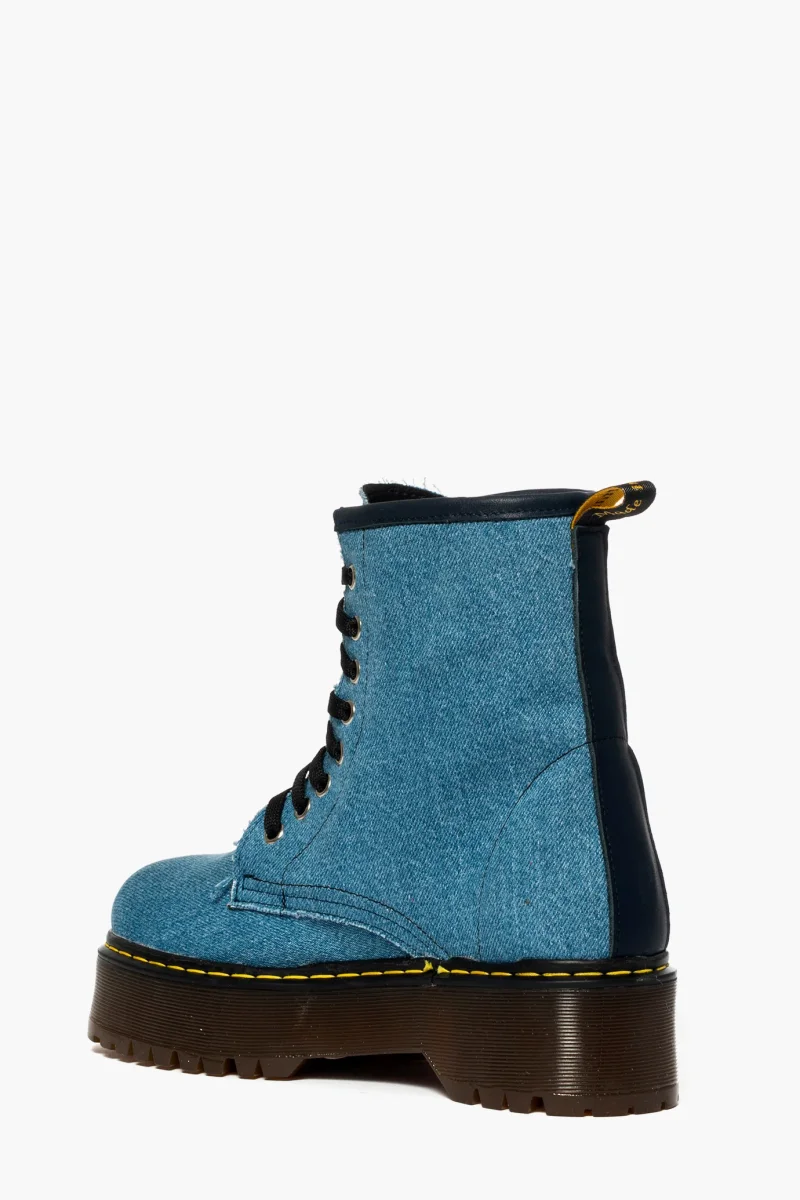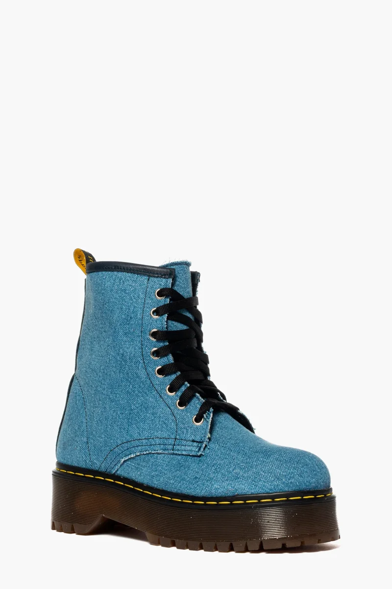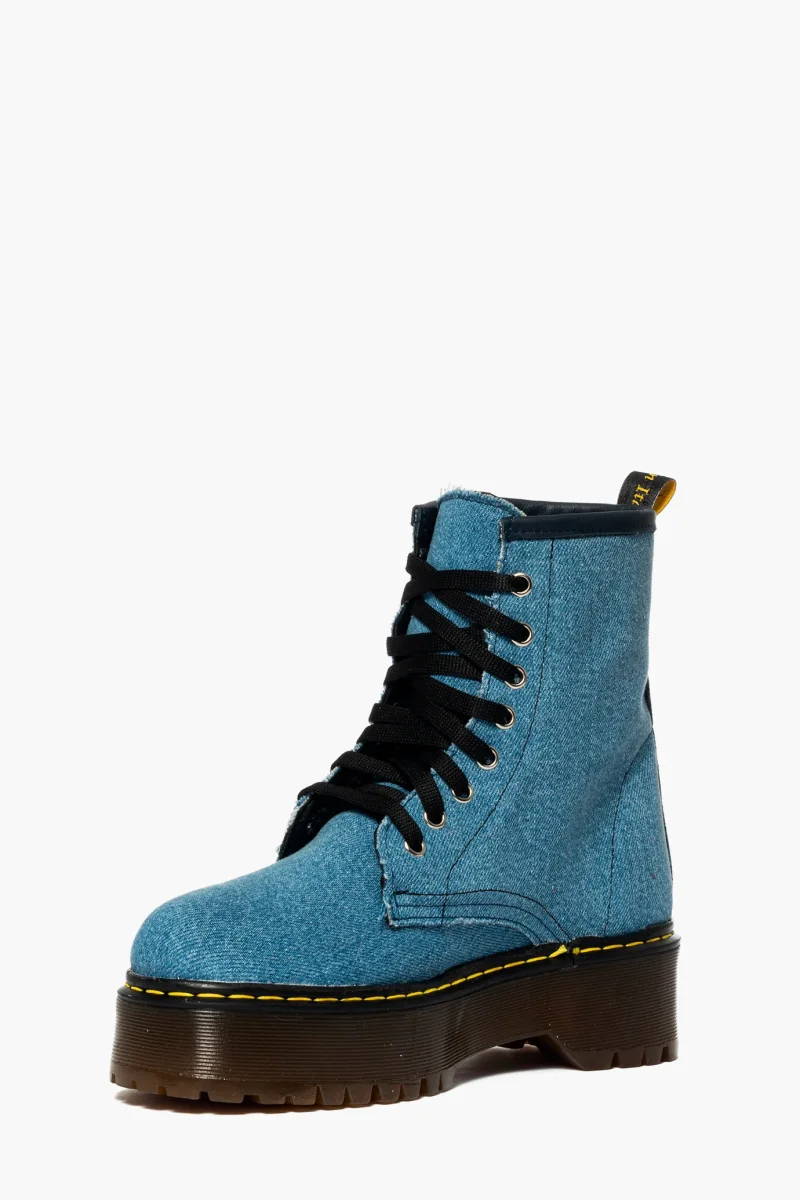 Stivaletti in jeans, occhielli in colore argento, interni e sottopiede in similpelle, lacci neri e suola in pvc colore petrolio, altezza 5, marchio Lia Diva. Calzature realizzate artigianalmente, rigorosamente made in Italy.