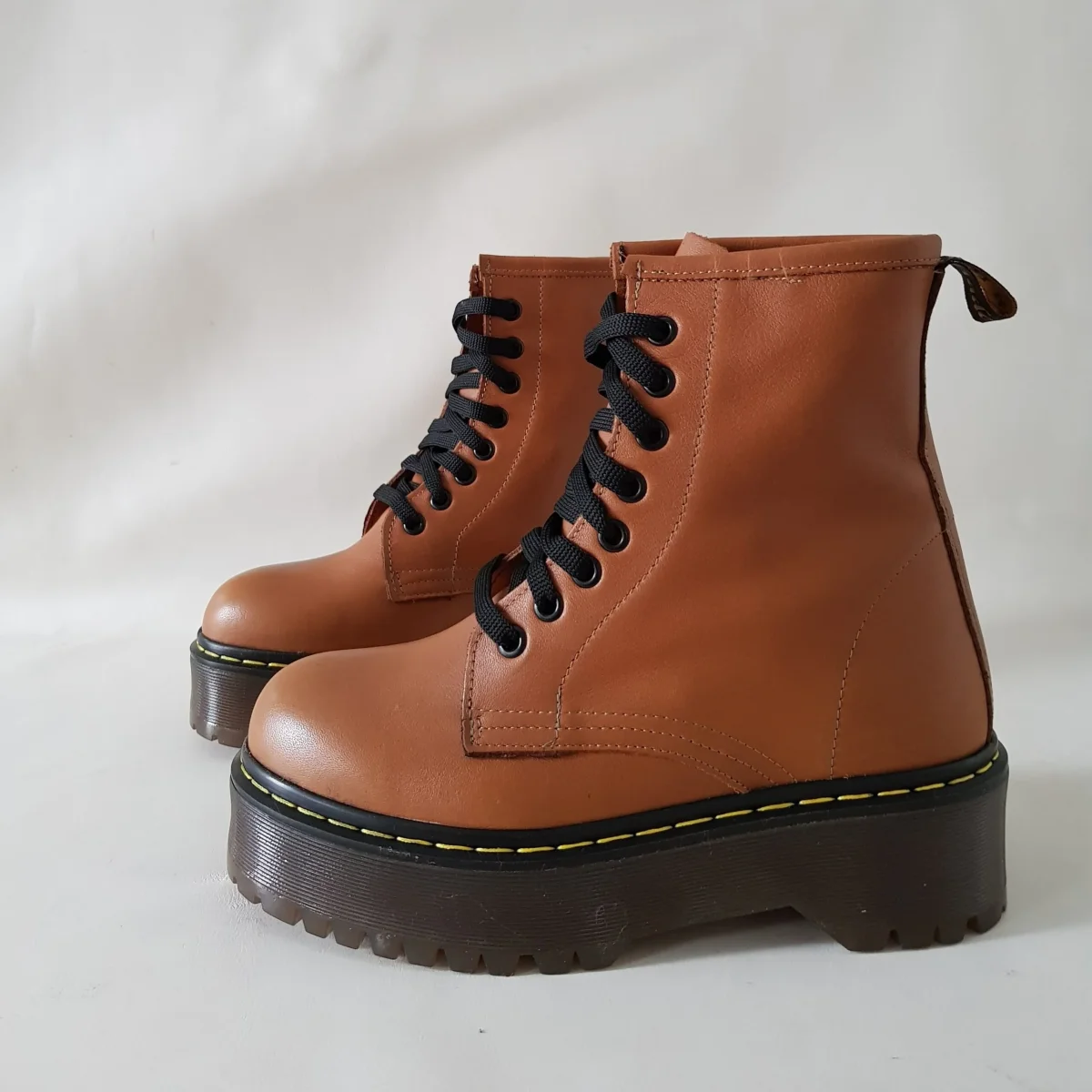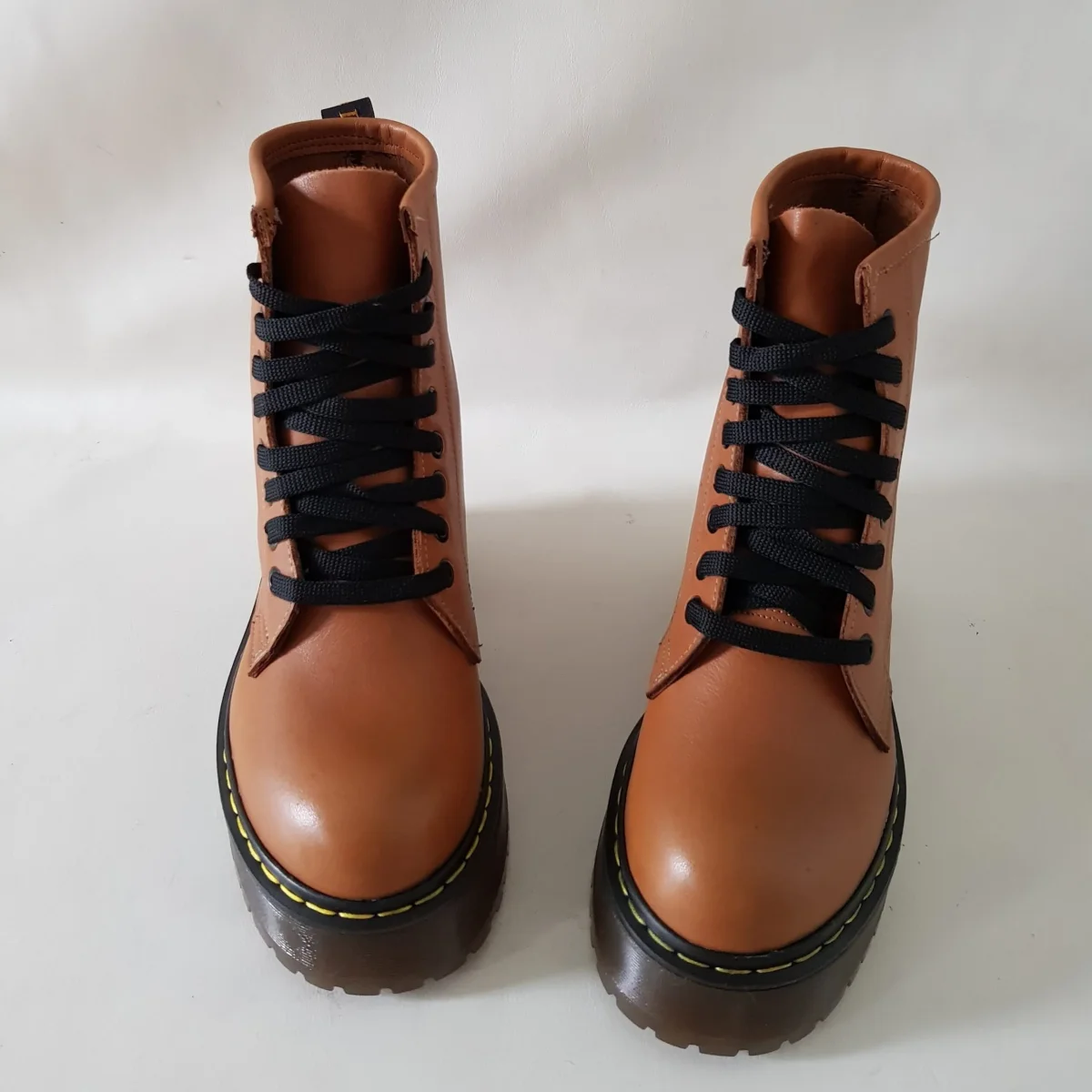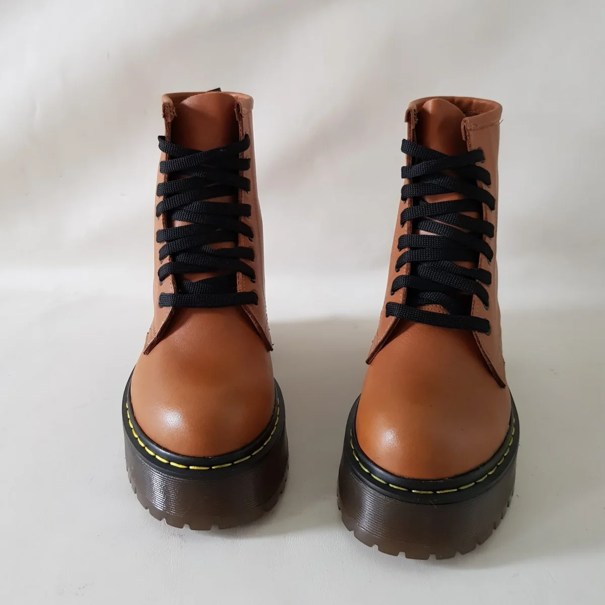Stivaletti in pelle cuoio con occhielli e lacci neri, interni e sottopiede in similpelle, morbidi al tatto e comodi per qualsiasi occasione, suola in pvc colore petrolio, con cucitura in giallo altezza 4 cm. Calzature realizzate artigianalmente, rigorosamente made in Italy. Calzano leggermente grandi, si consiglia di consultare la guida alle taglie.