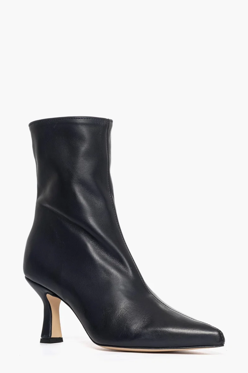 Stivaletti in pelle blu, con cerniera interno piede, lo rende più aderente alla caviglia, tacco rivestito, altezza 8.5, interni in similpelle. Calzano regolari, punta in avanti. Calzature artigianali, made in Italy.
