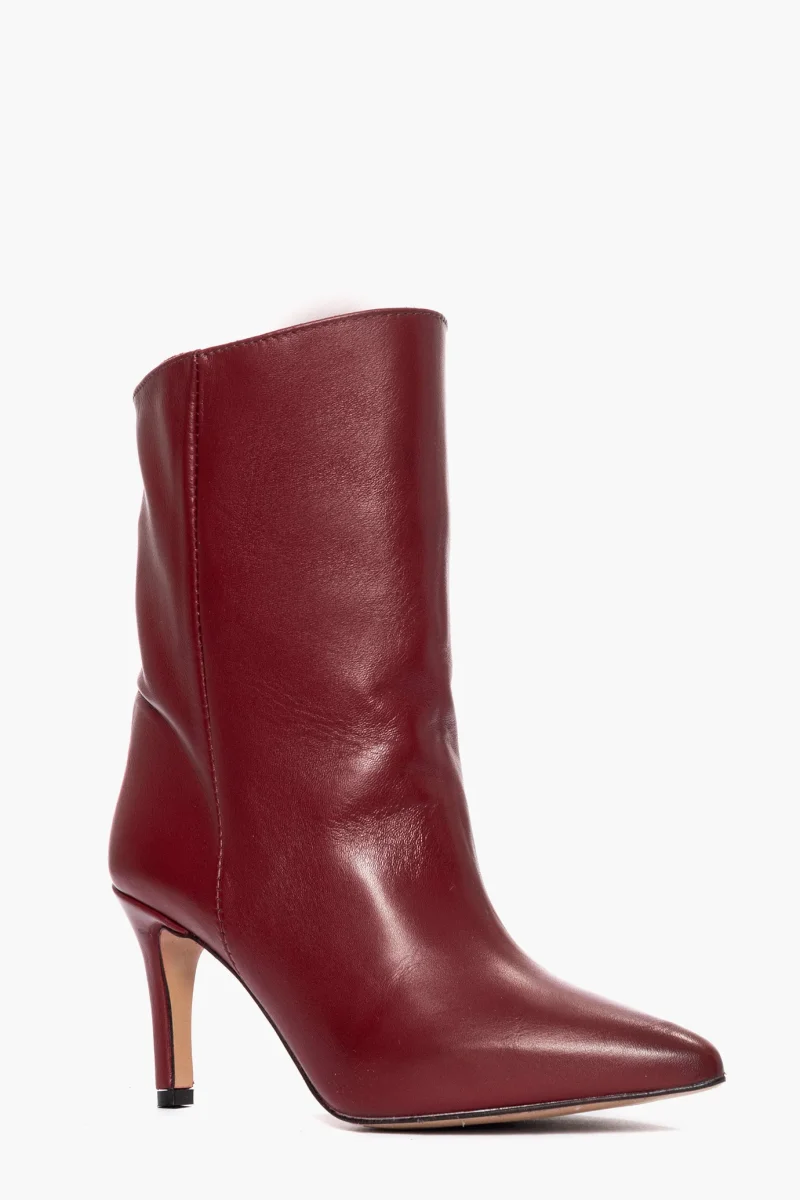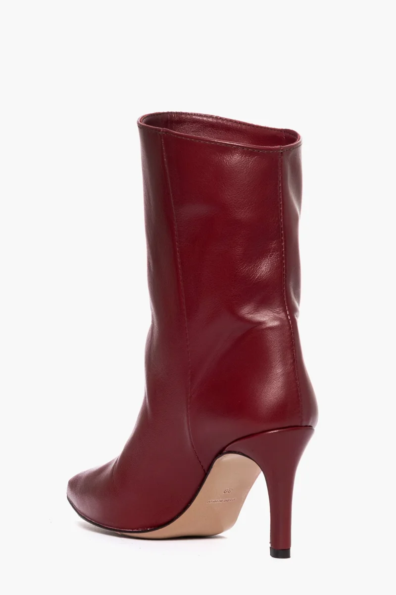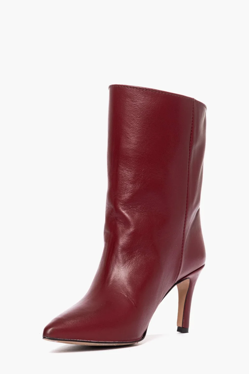 Stivaletto in pelle bordeaux sotto al polpaccio, taglio trasversale, tacco rivestito, altezza 8, interni in similpelle. Calzano giuste. Calzature artigianali, made in Italy.