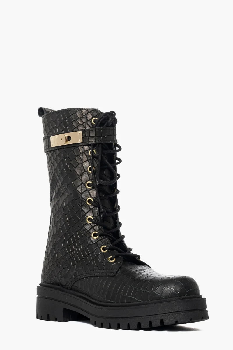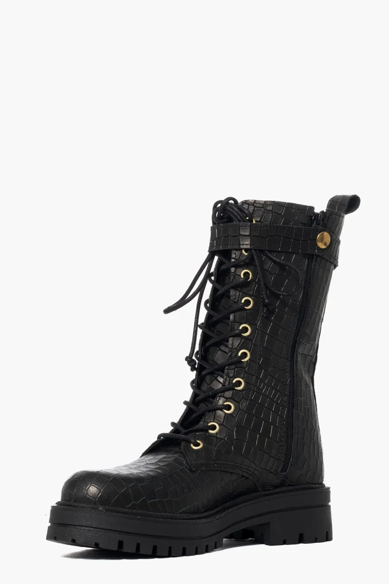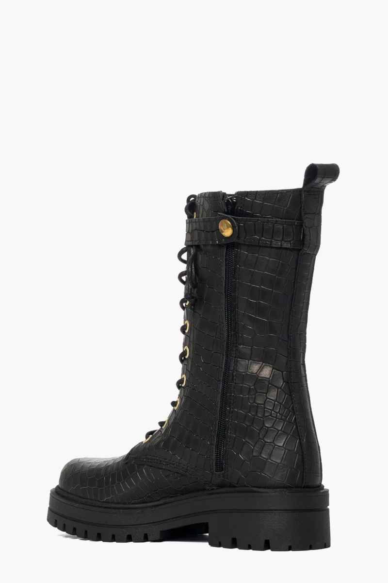 Stivaletto sotto al polpaccio in pelle cocco nero, con zip interno piede e regolabile con i lacci in tinta, suola in tinta, altezza 5, interni in similpelle, calzano regolari, cintura con accessorio nel colore oro. Calzature artigianali, made in Italy.