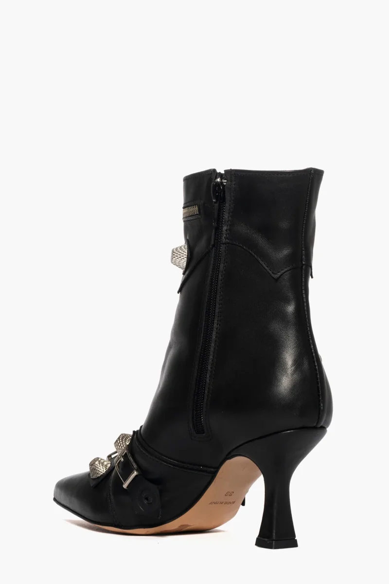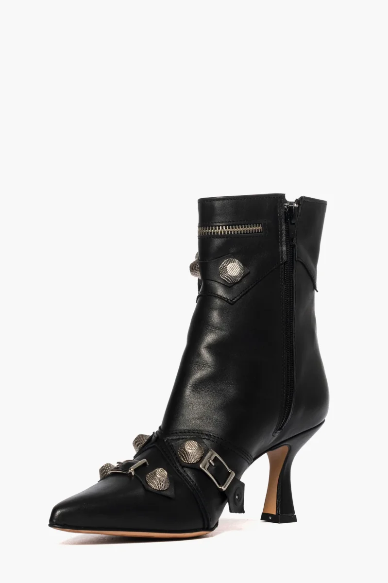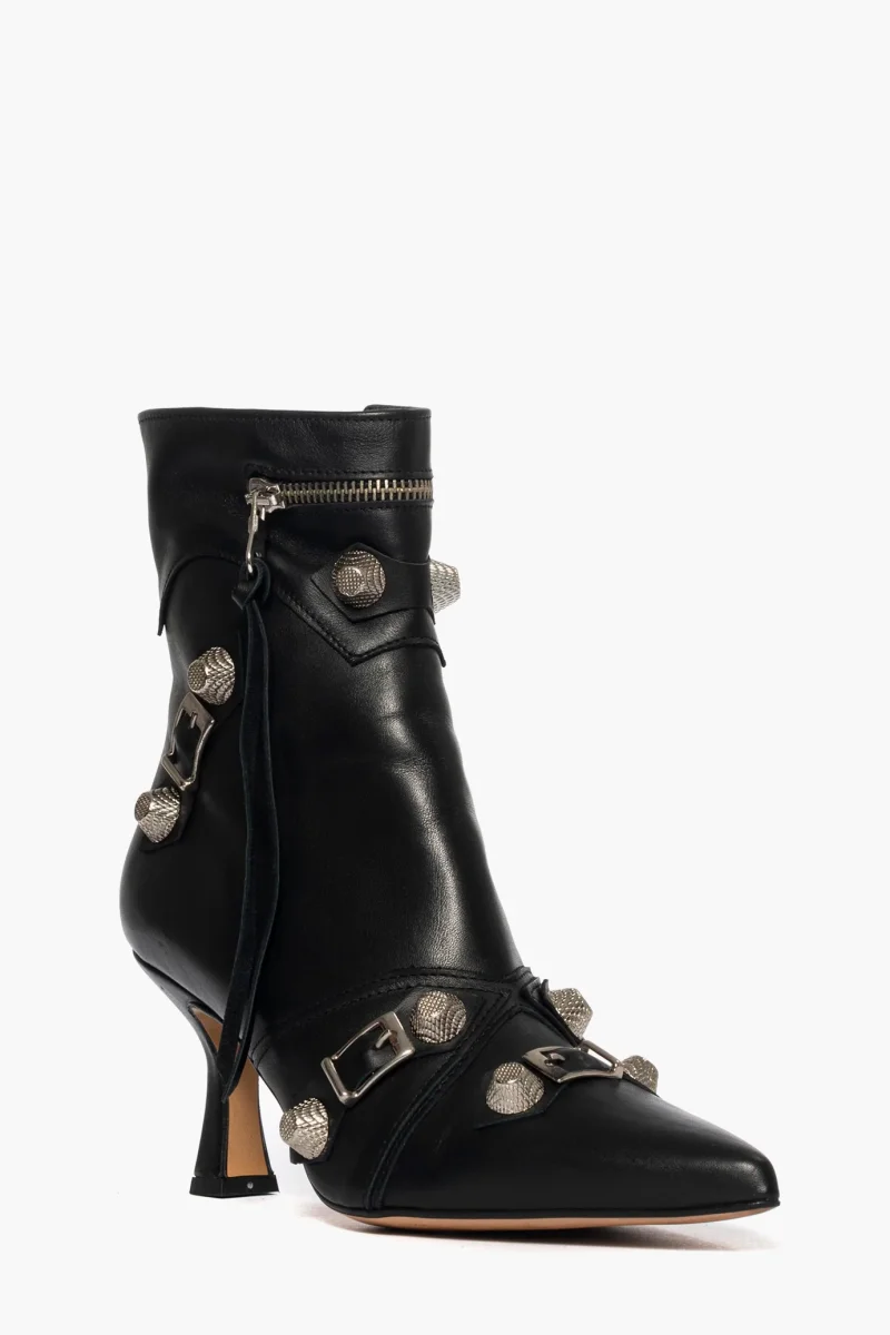 Stivali alla caviglia in pelle nero, con borchie in argento, con zip e laccio pendente in pelle, tacco rivestito, altezza 8, interni in similpelle. Calzano giusti, punta leggermente stretta in avanti.