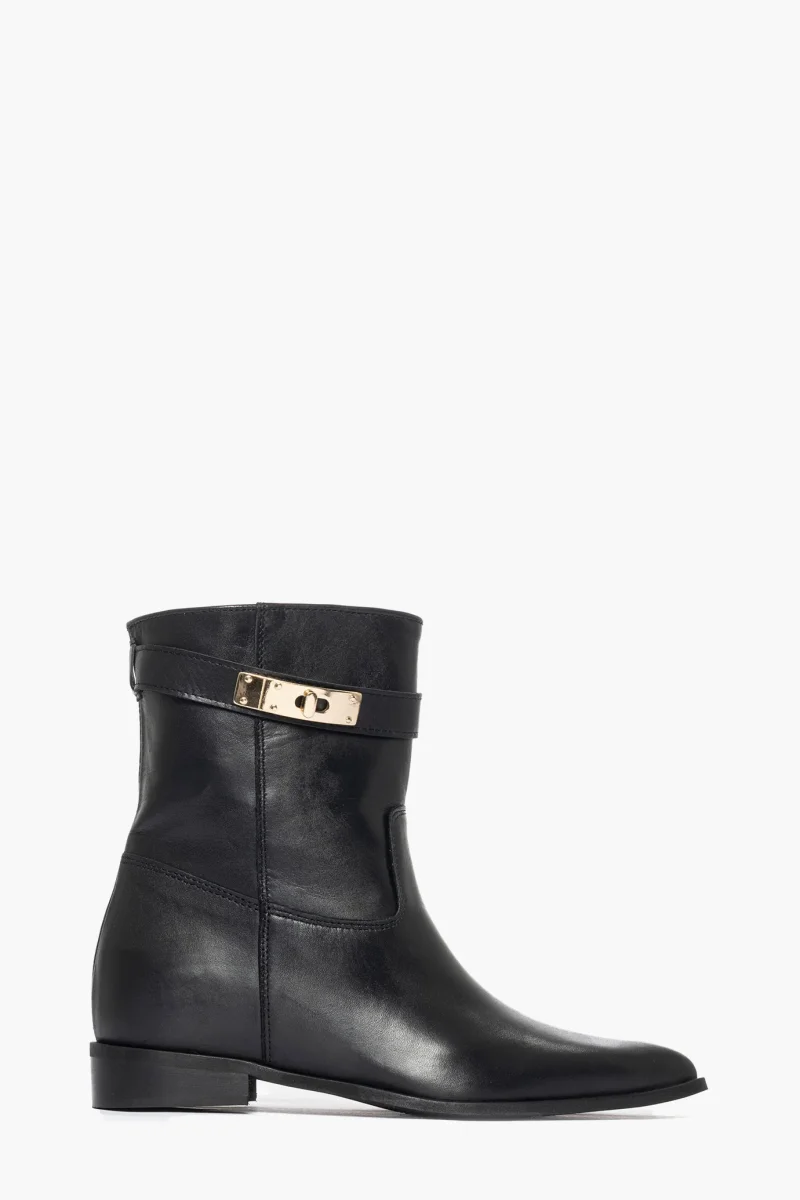 Stivaletti pelle nero e cintura con accessorio nel colore oro, rialzo interno, altezza totale 6, punta in avanti, alla caviglia. Calzano regolari. Calzature artigianali, made i Italy.