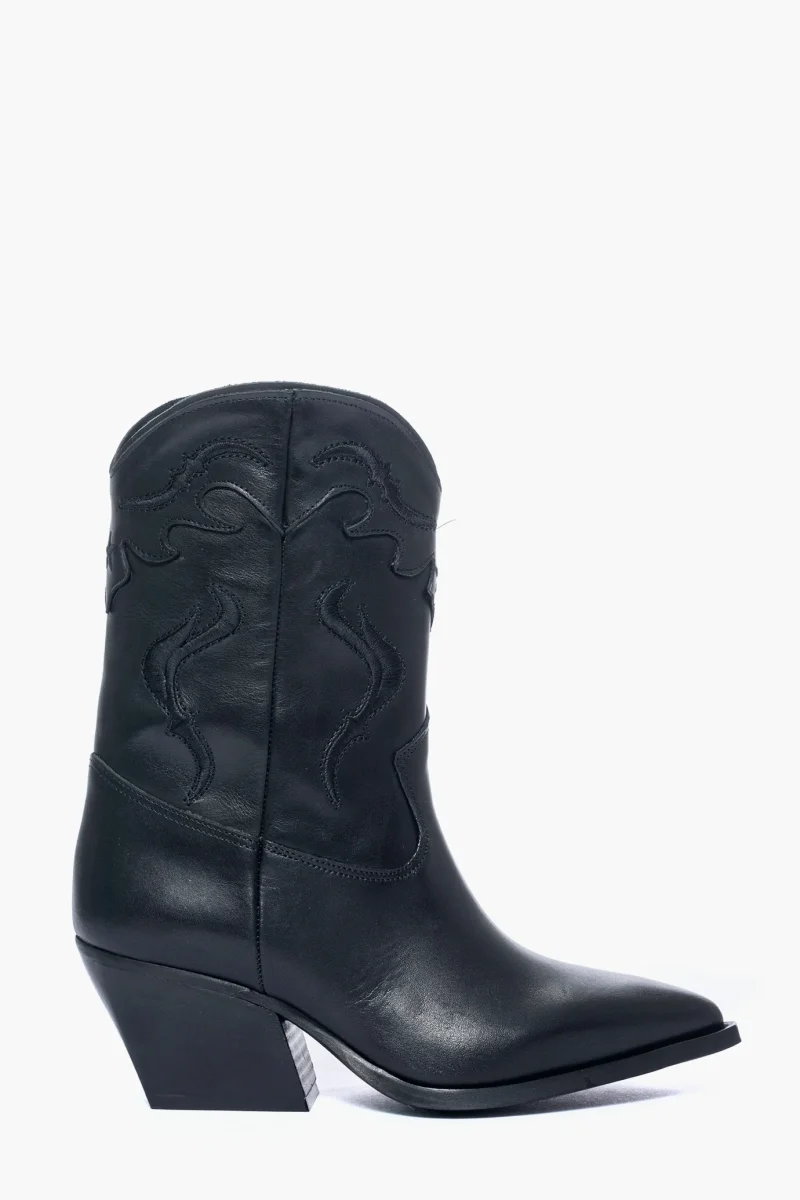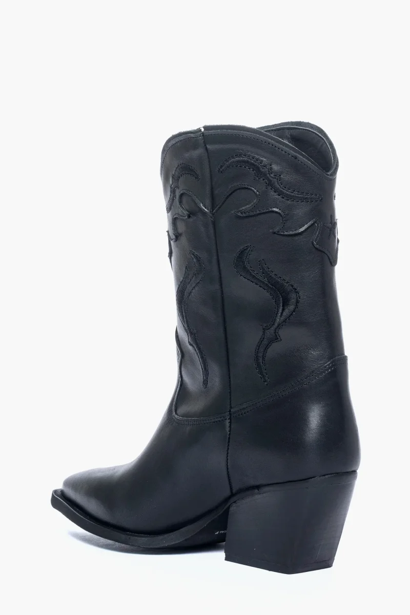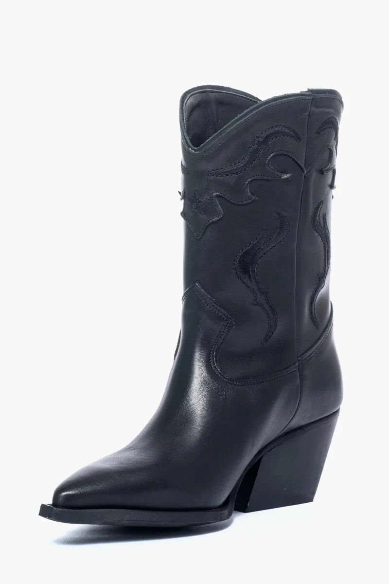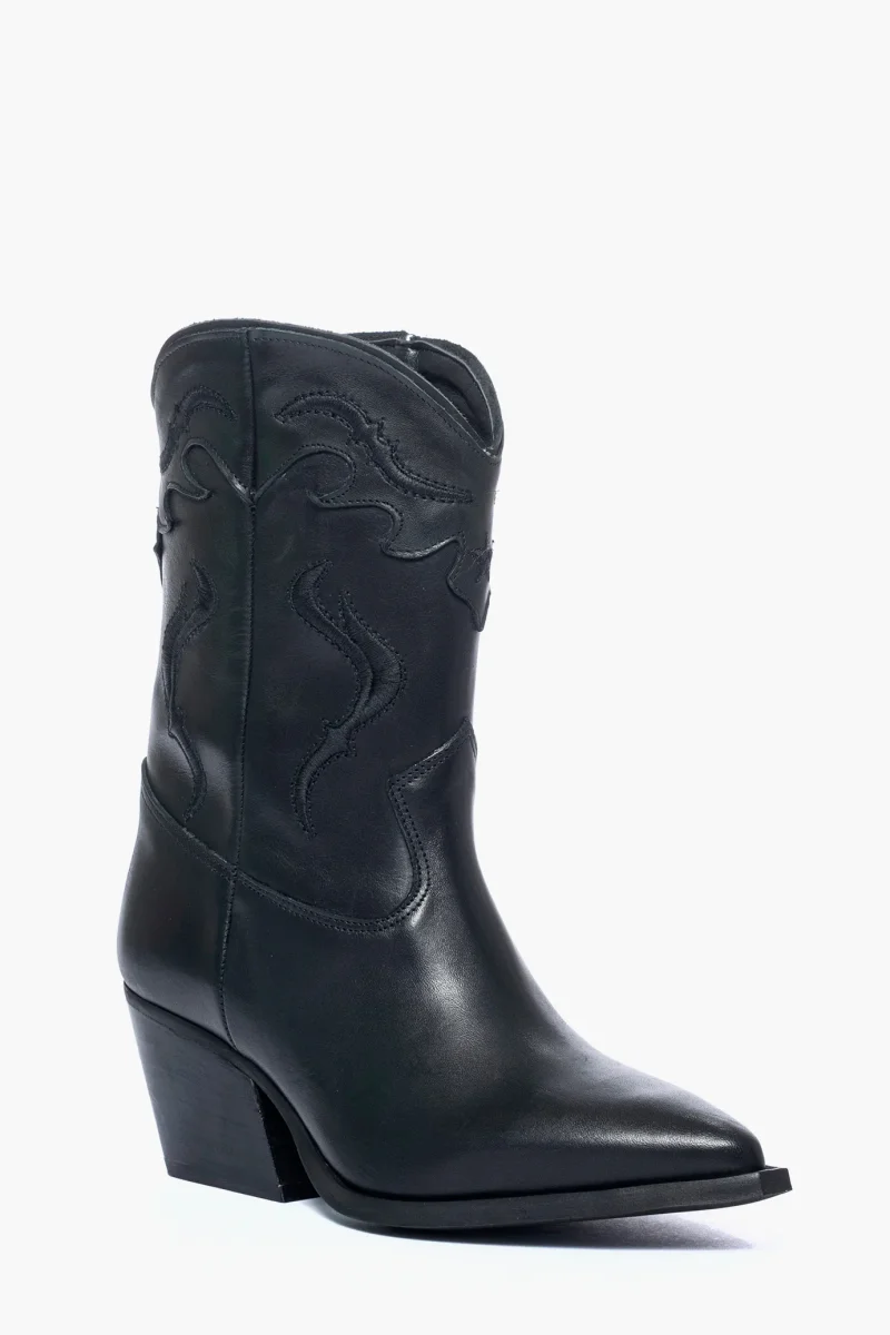 Stivaletti sopra alla caviglia in pelle nero e ricami sul gambale nel colore in tinta, suola spazzolata, tacco altezza 7, interni in similpelle. Calzano giuste, punta stretta in avanti.
