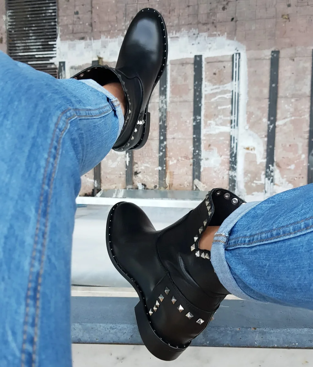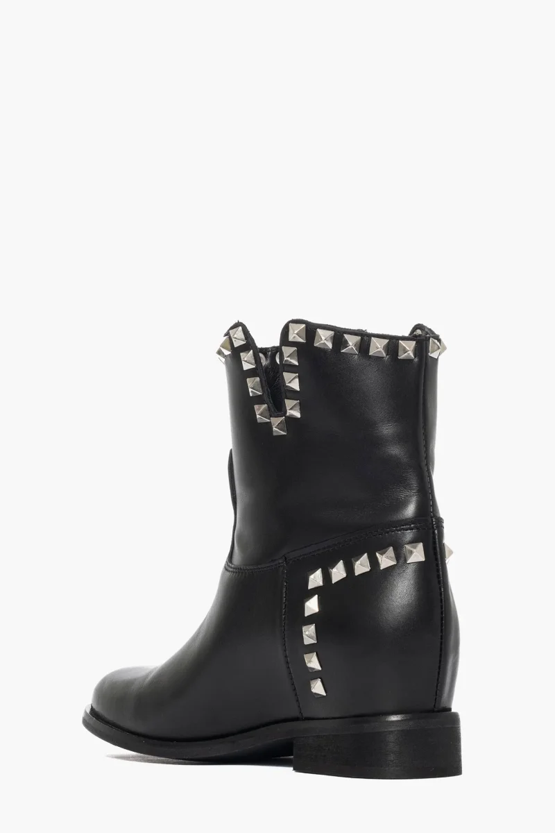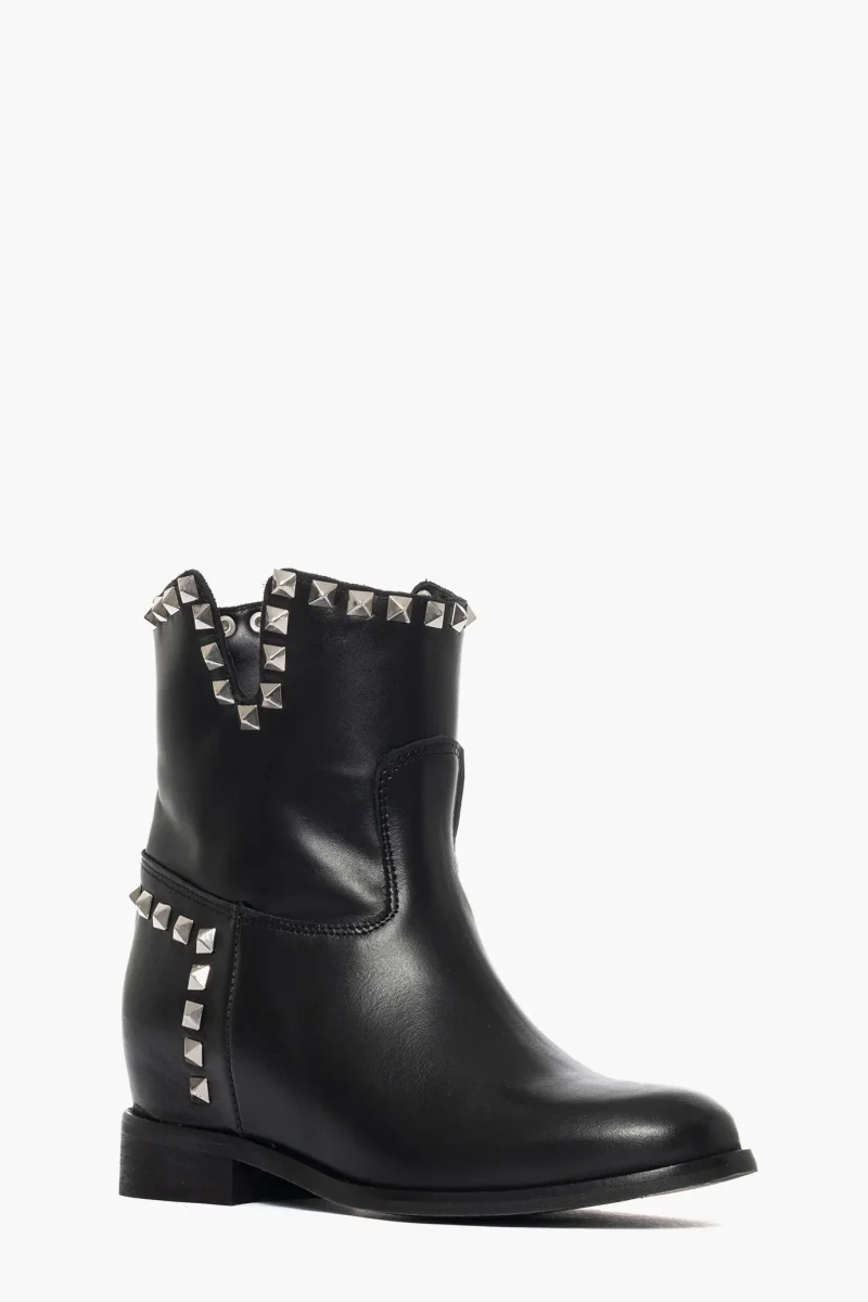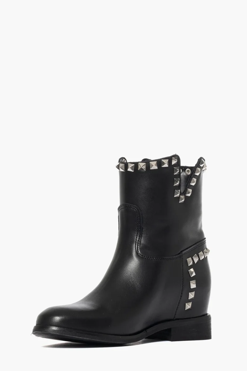 Stivaletti in pelle nero e borchie argento, privo di cerniera, con rialzo interno altezza 3 cm, altezza compresa suola 5/6 cm, interni e sottopiede in similpelle, calzature realizzate artigianalmente, rigorosamente made in Italy. Calzano regolari, taglia italiana. Molto comode, pianta larga.