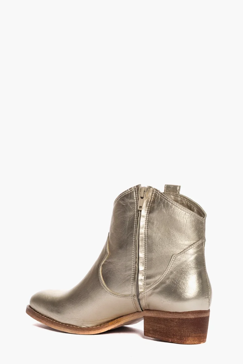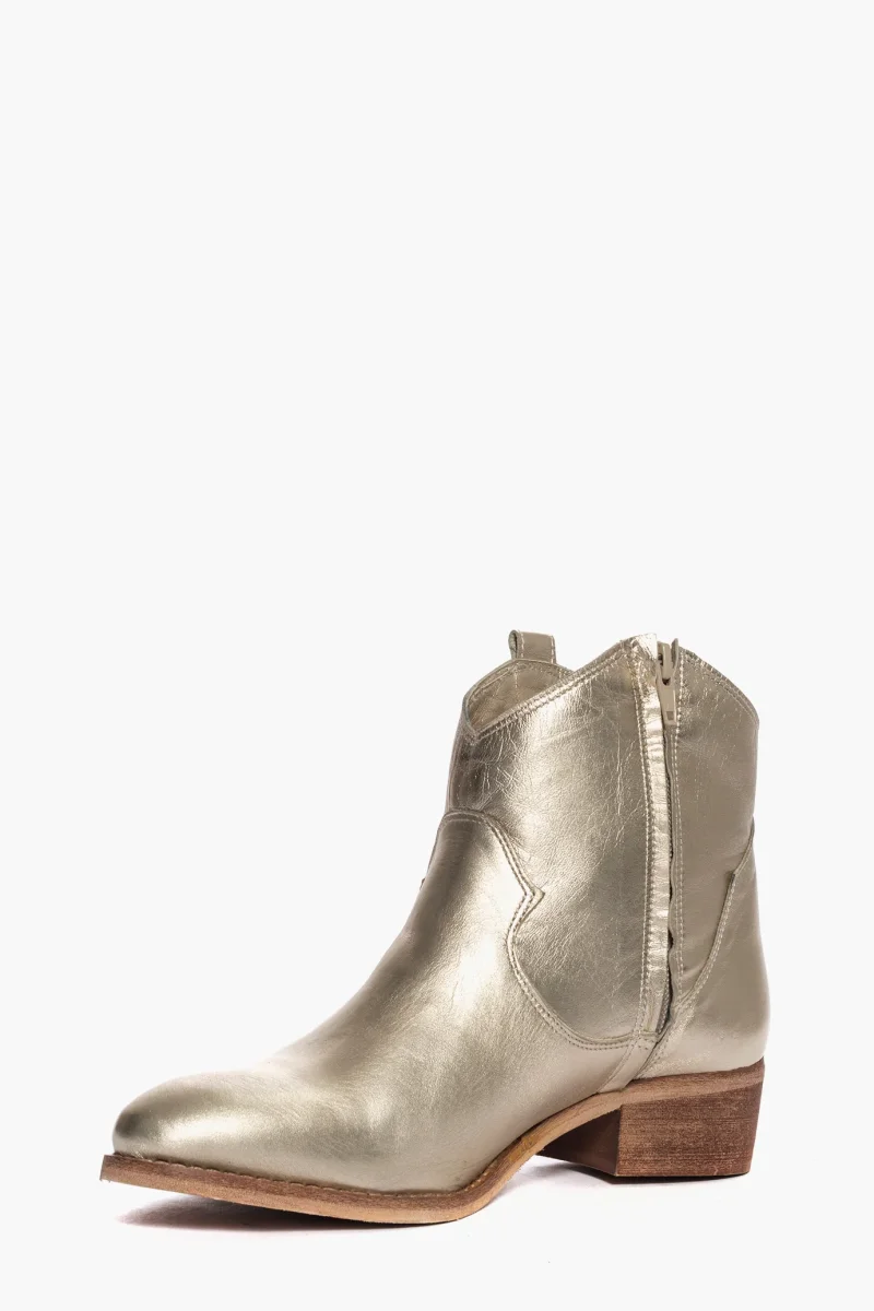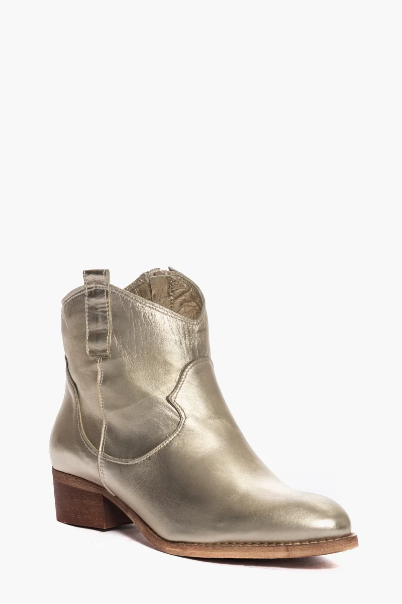 Stivaletti in pelle polvere oro con cerniera interno piede, interni e sottopiede in similpelle, suola in micro marrone, altezza tacco 4 cm. Calzata comoda, pianta non stretta, abbastanza larga per un texano classico, taglia italiana. Calzature realizzate artigianalmente, rigorosamente made in Italy.