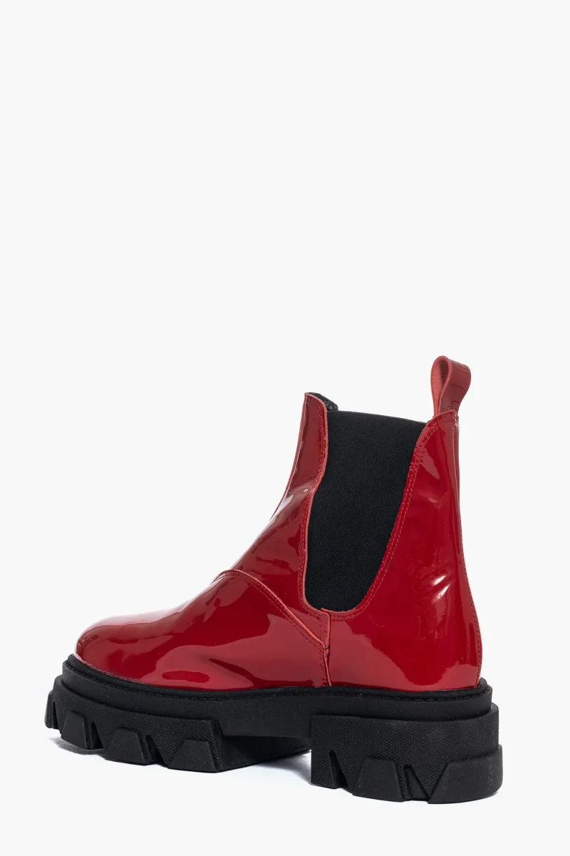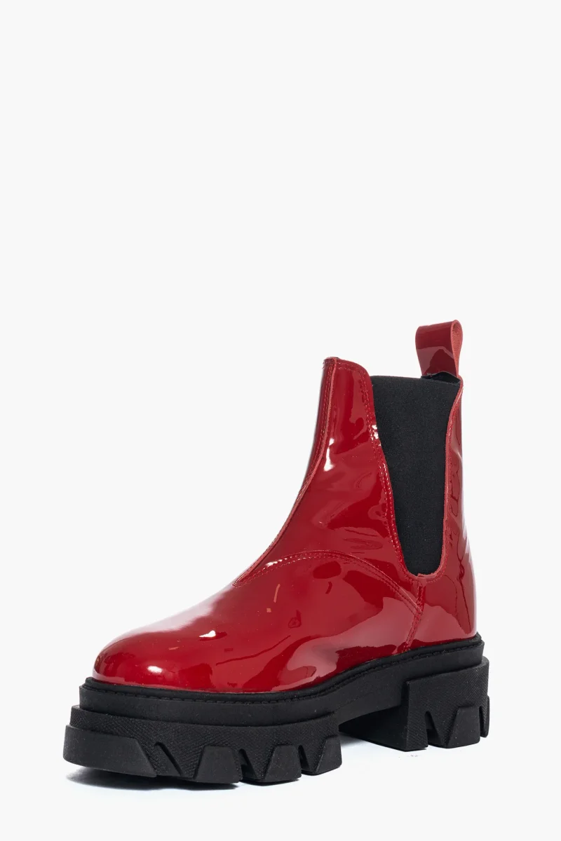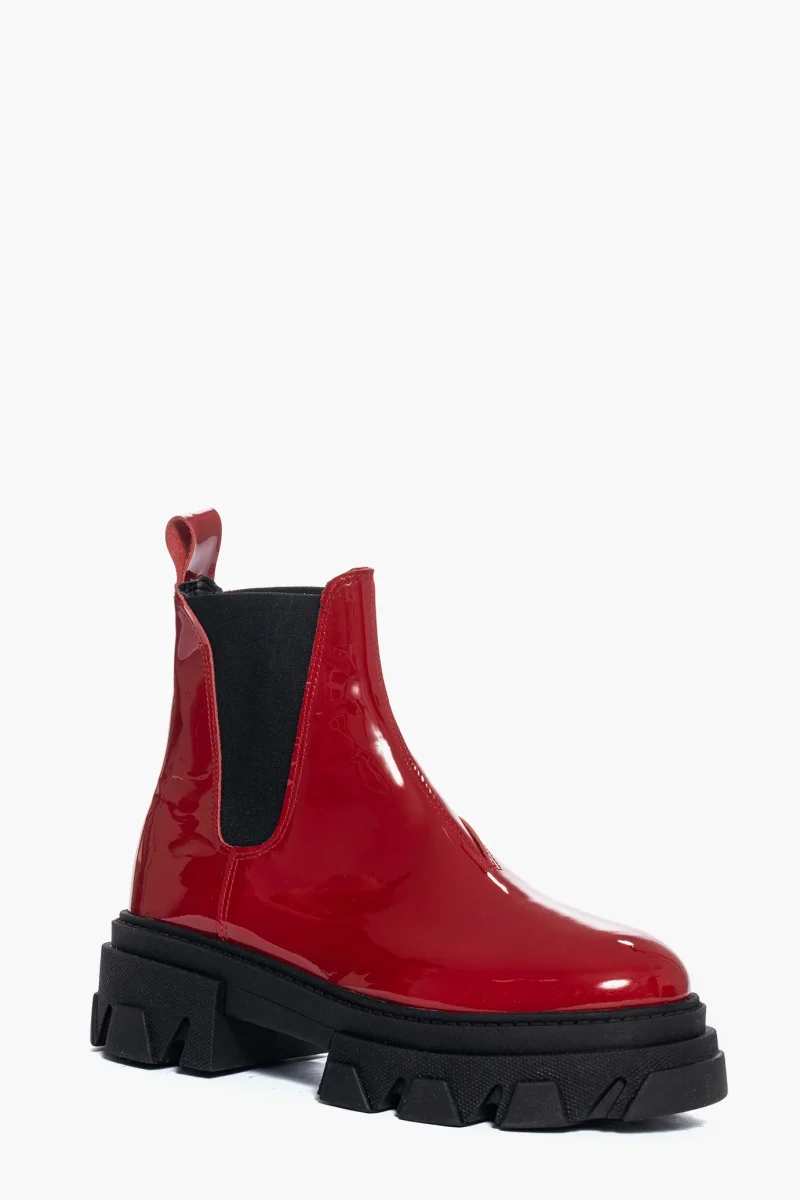 Stivaletti in pelle vernice rossa, ai lati elastici, privo di cerniera, comodi ed eleganti, interni e sottopiede in similpelle nero, suola in gomma nera, altezza 5 cm. Calzata regolare, taglia italiana. Calzature realizzate artigianalmente, rigorosamente made in Italy.