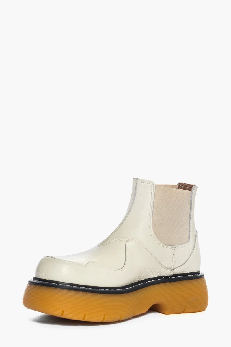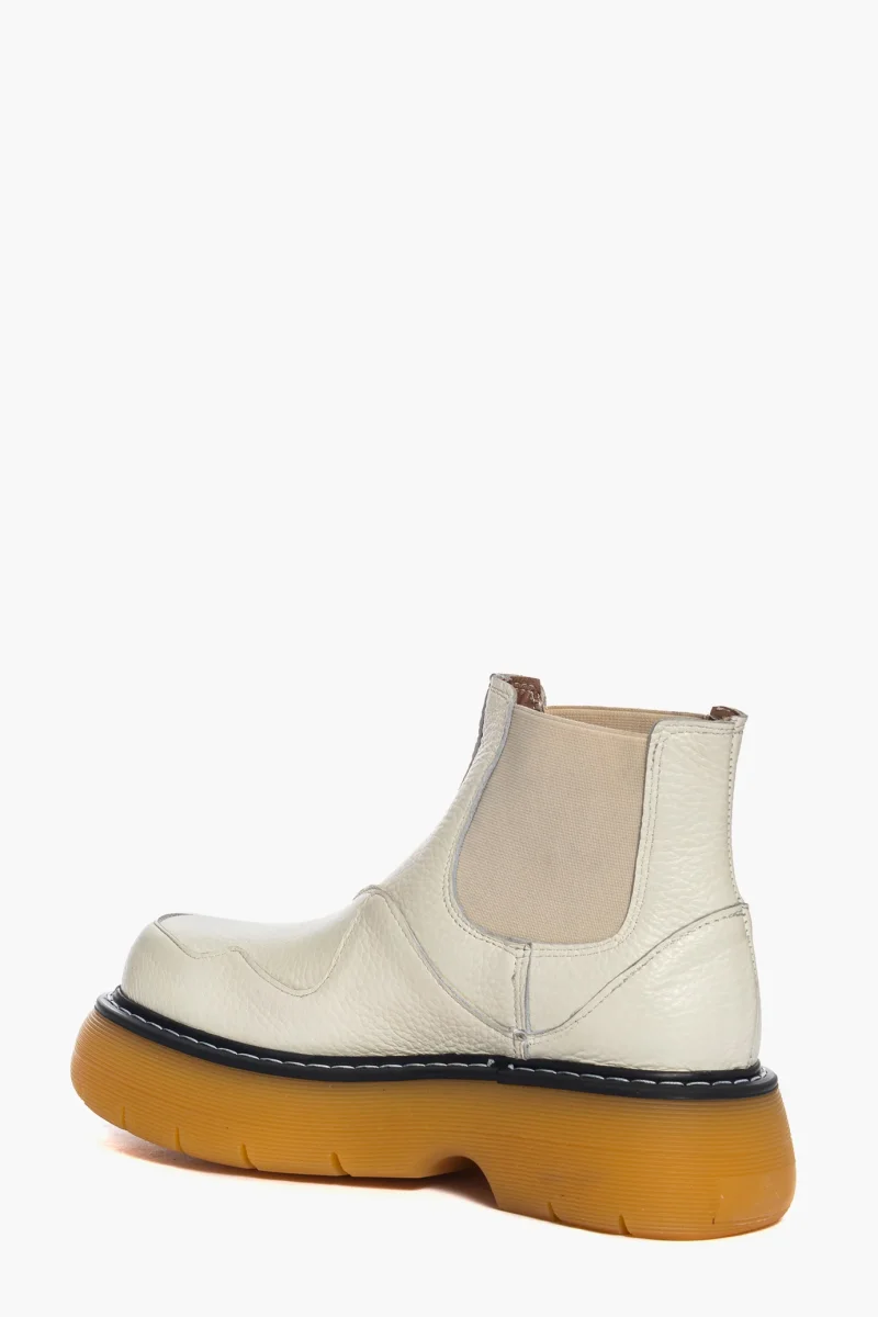 Stivaletti in pelle bottalato panna, con elastici ai lati in tinta, suola in camello e nero, interni e sottopiede in similpelle. Calzata regolare, taglia italiana. Calzature realizzate artigianalmente, rigorosamente made in Italy.