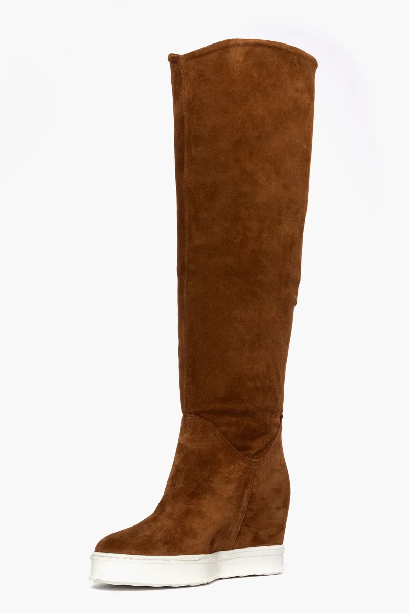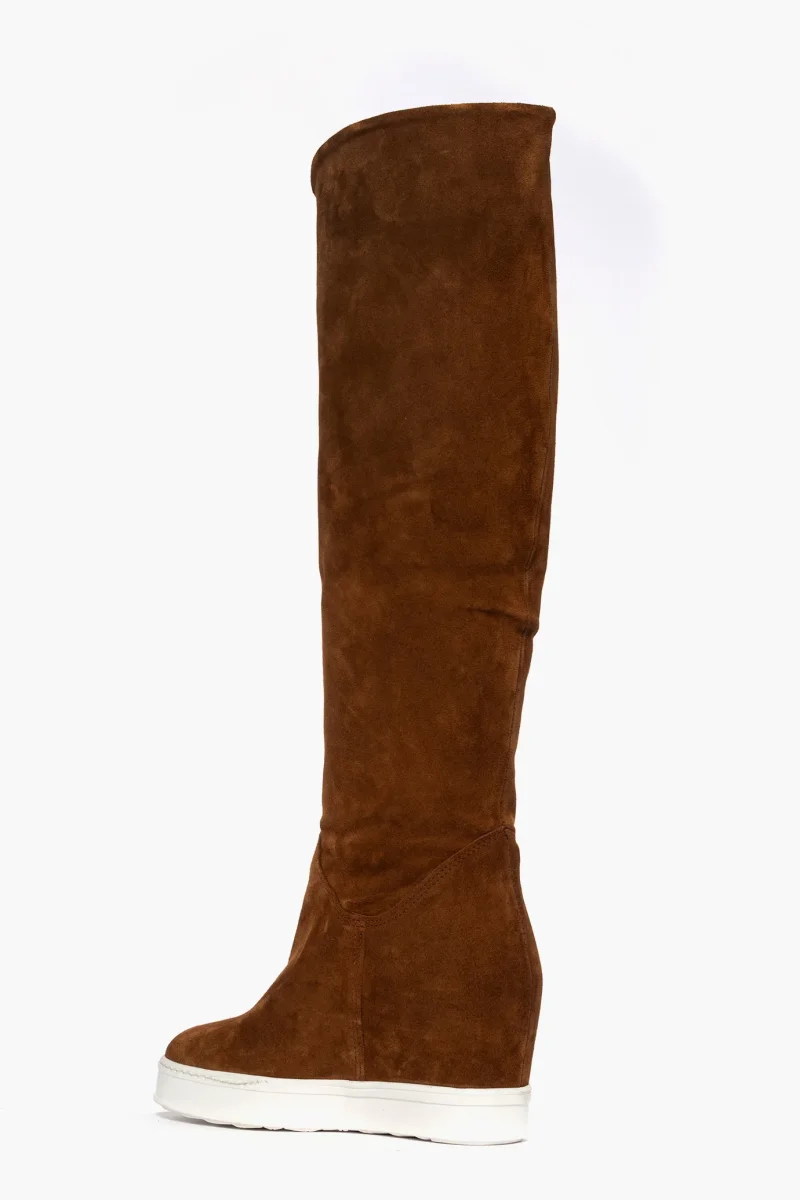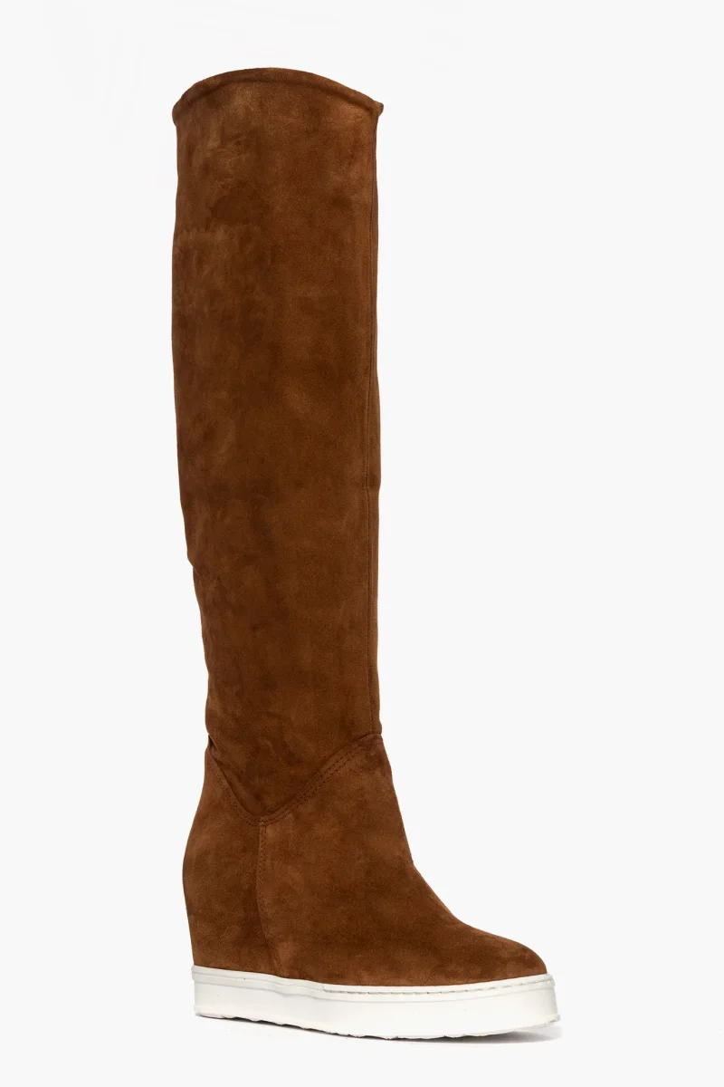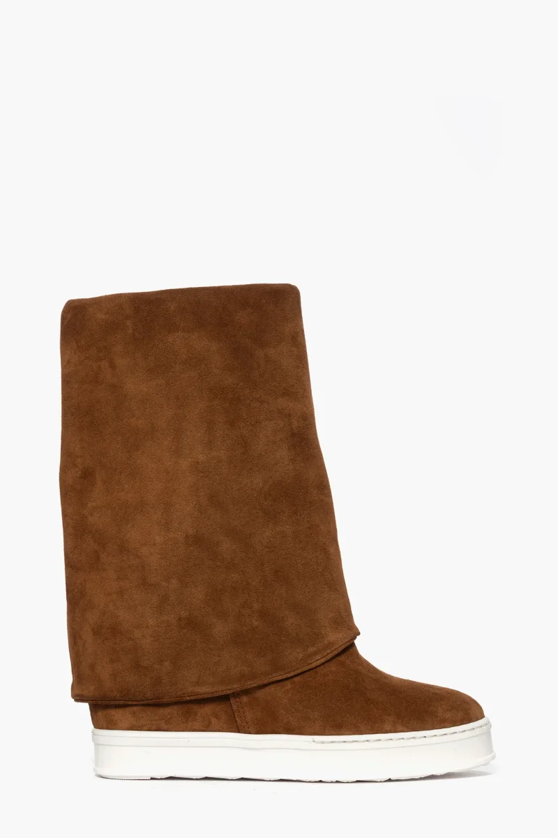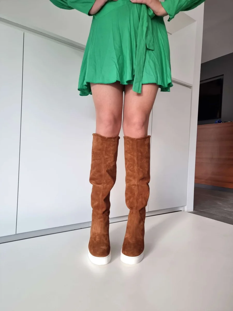 Stivale in camoscio cuoio, possibile risvoltare lo stivale, diventa uno stivaletto altezza polpaccio, comodo rialzo interno, suola in gomma bianca, altezza 9/10. Calzano regolari.