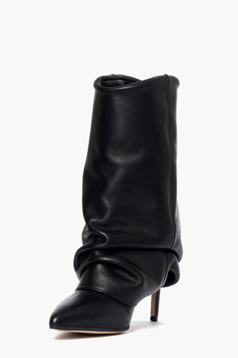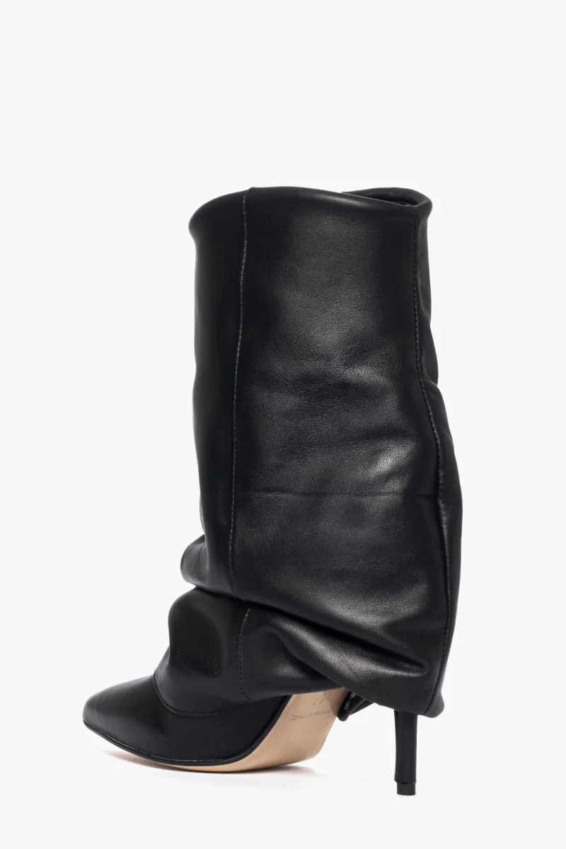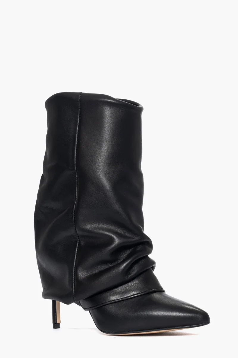 Stivaletto con risvolto e aggrappato in pelle nero, tacco rivestito, altezza 9. Calzano regolari, interni in similpelle. Calzature artigianali, made in Italy.