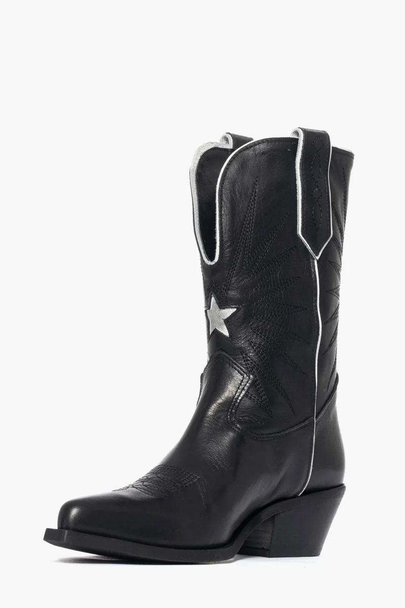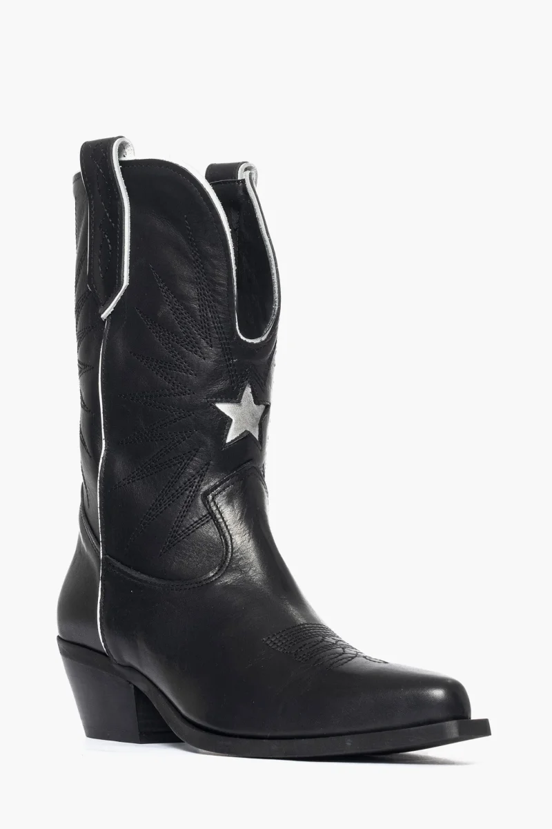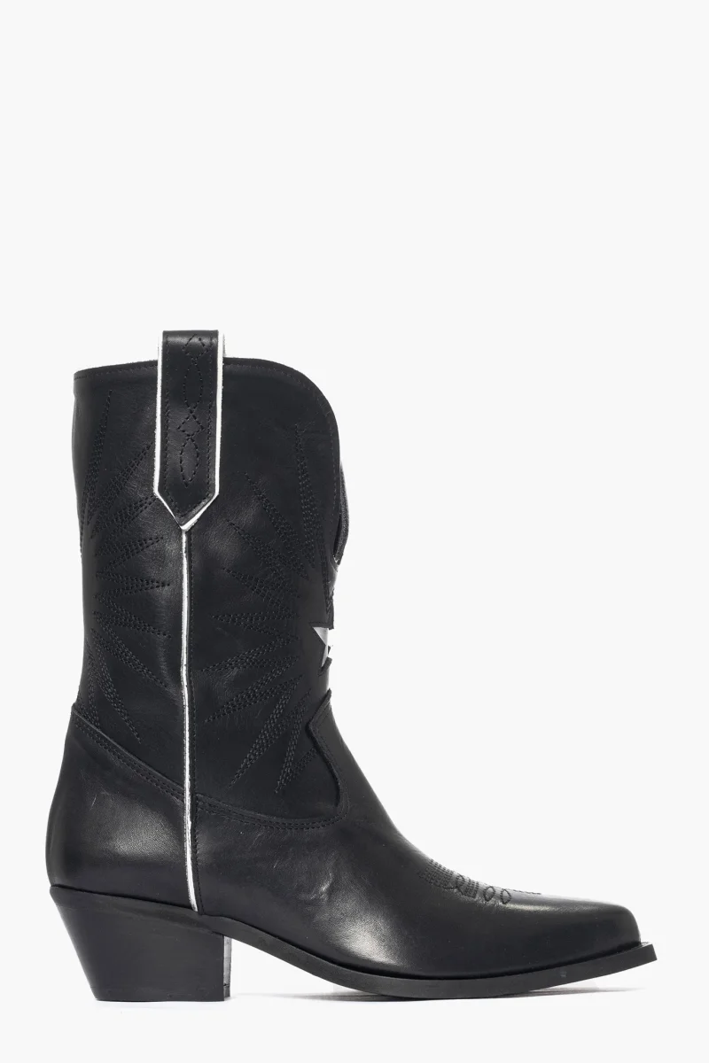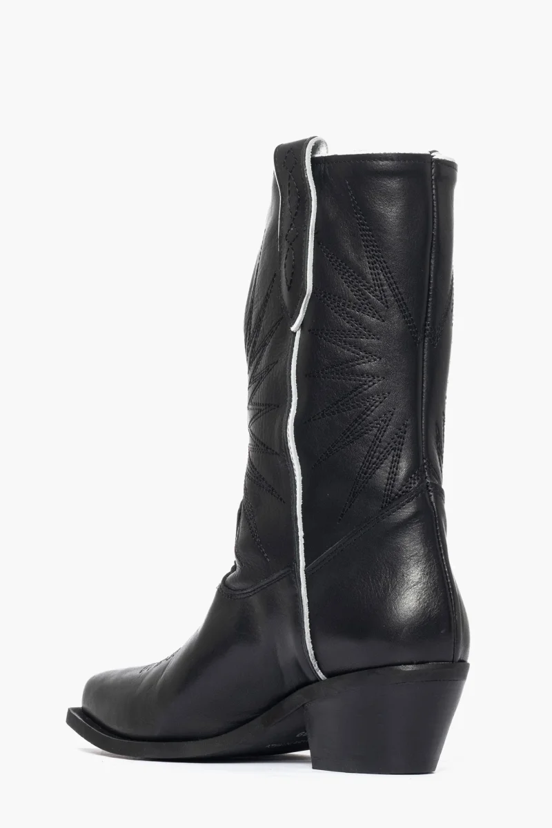 Stivaletti in pelle nero e riporto in pelle bianco, con ricamo in colore nel colore nero, interni e sottopiede in similpelle, ricamo sulla punta e ai lati dello stivaletti e la parte anteriore, suola in micro duro in colore nero, altezza 4, spazzolato a mano, effetto vintage. Calzano comode. Calzature artigianali, made in Italy.