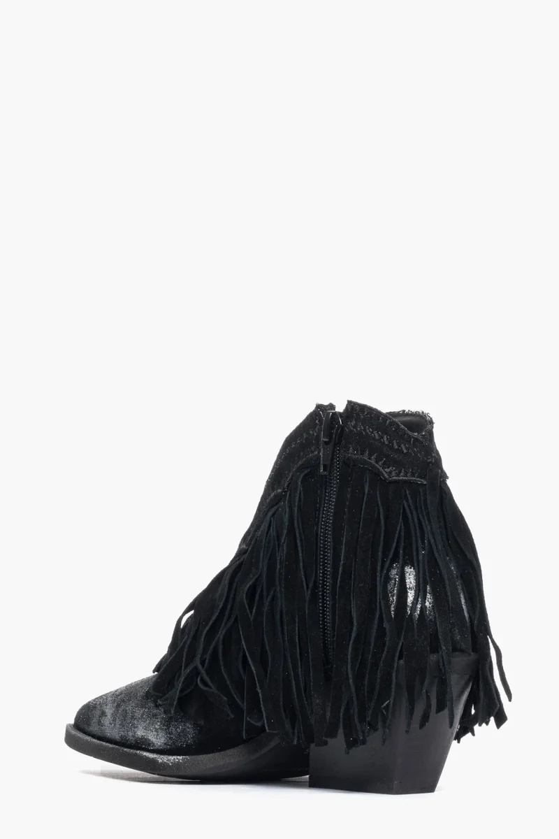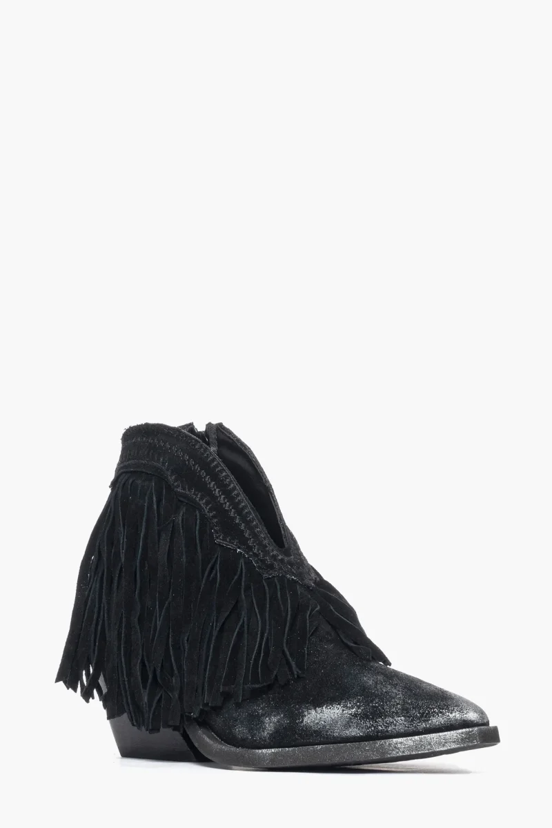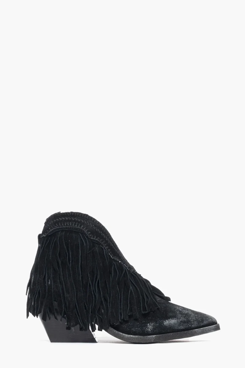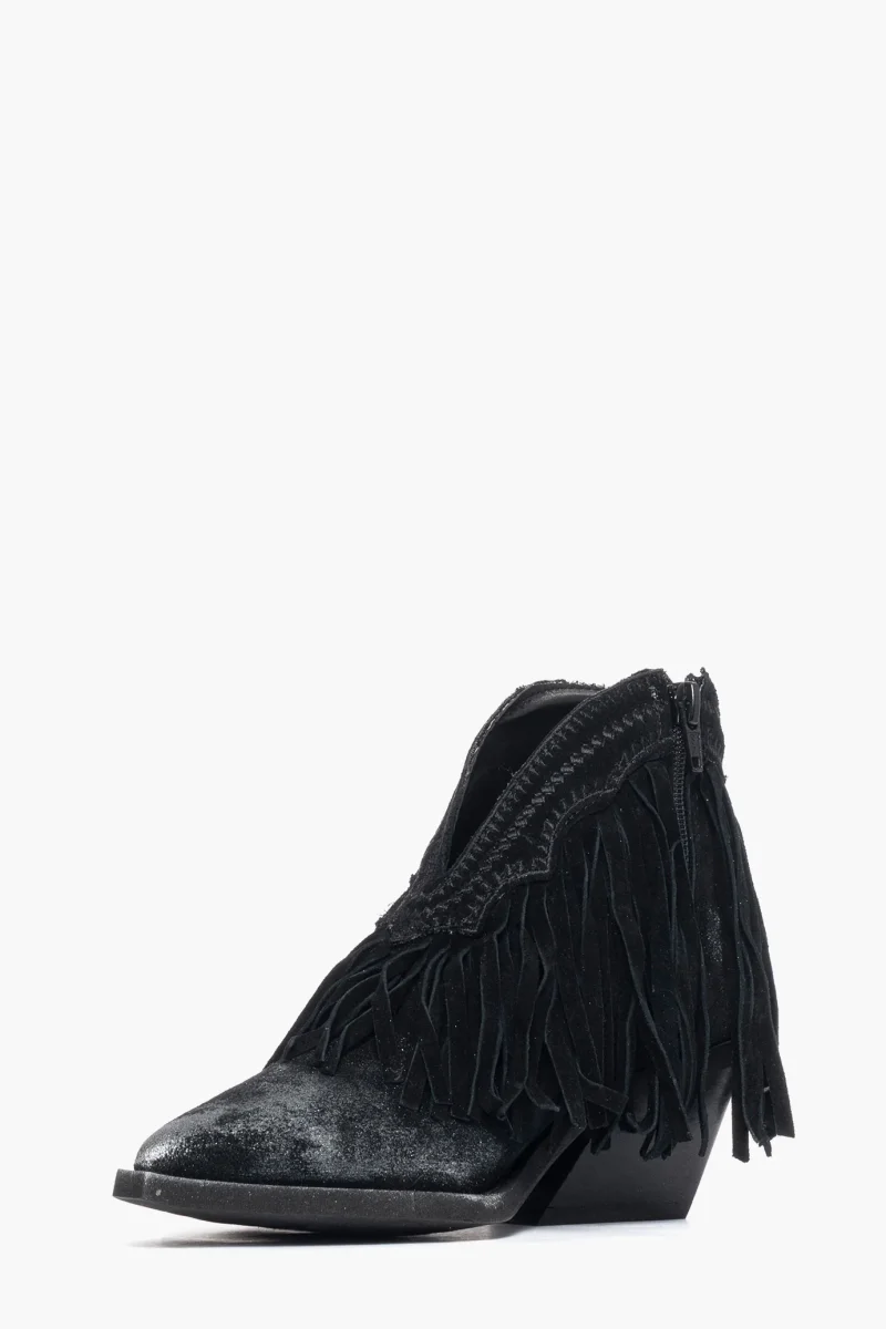 Stivaletti Stephan 180 in camoscio nero con frange intorno alla caviglia e ricamo in tinta, morbide, spazzolato a mano con cera nel colore argento effetto vintage, cerniera interno piede, interni e sottopiede in similpelle, suola nera in micro altezza tacco 5 cm. Calzata regolare, taglia italiana, in caso di mezzo numero è consigliabile prendere un numero in più (es. per un 37 1/2, prendere il 38). Calzature realizzate artigianalmente, rigorosamente made in Italy.