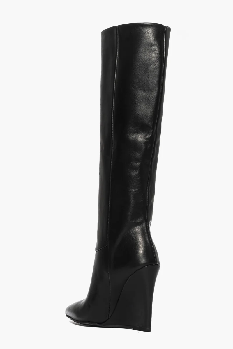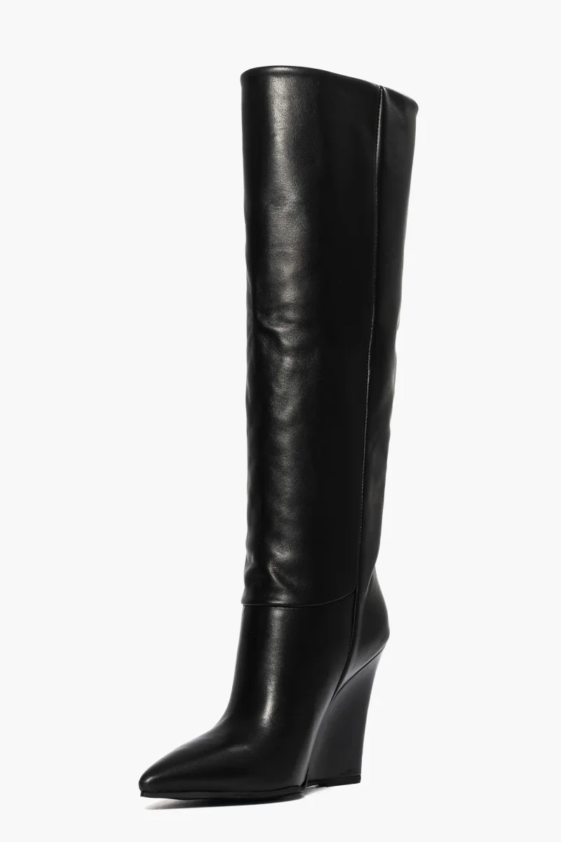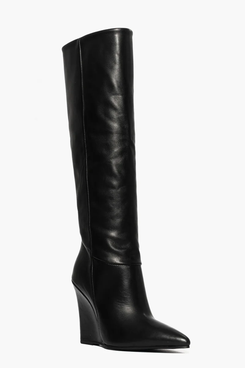 Stivali in pelle nera, lunghezza al ginocchio con zeppa rivestita, altezza 11, interni in similpelle, punta in avanti. Calzata giusta, italiana. Calzature realizzate artigianalmente, rigorosamente Made in Italy.