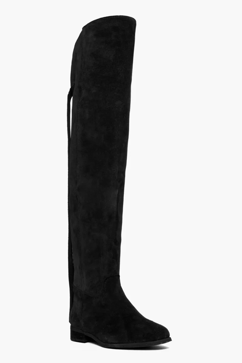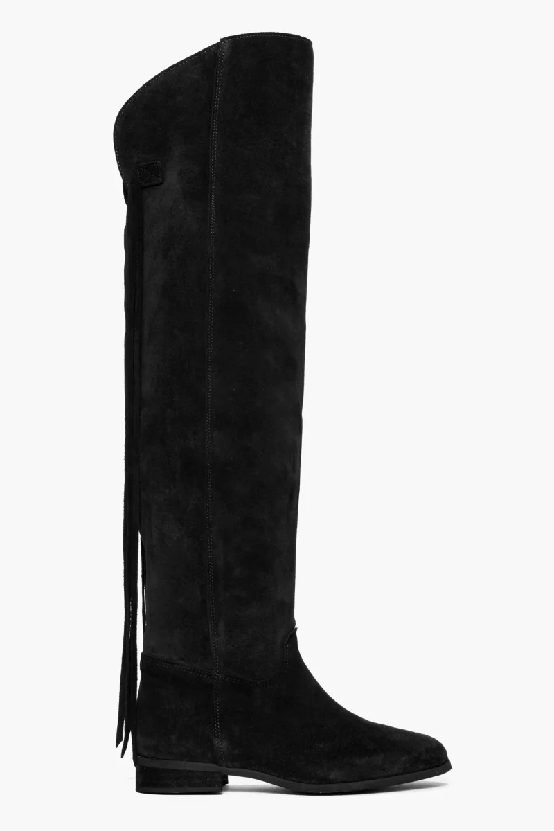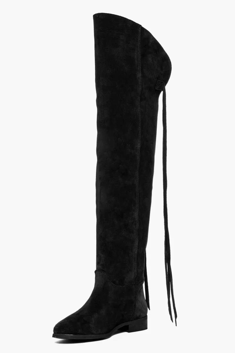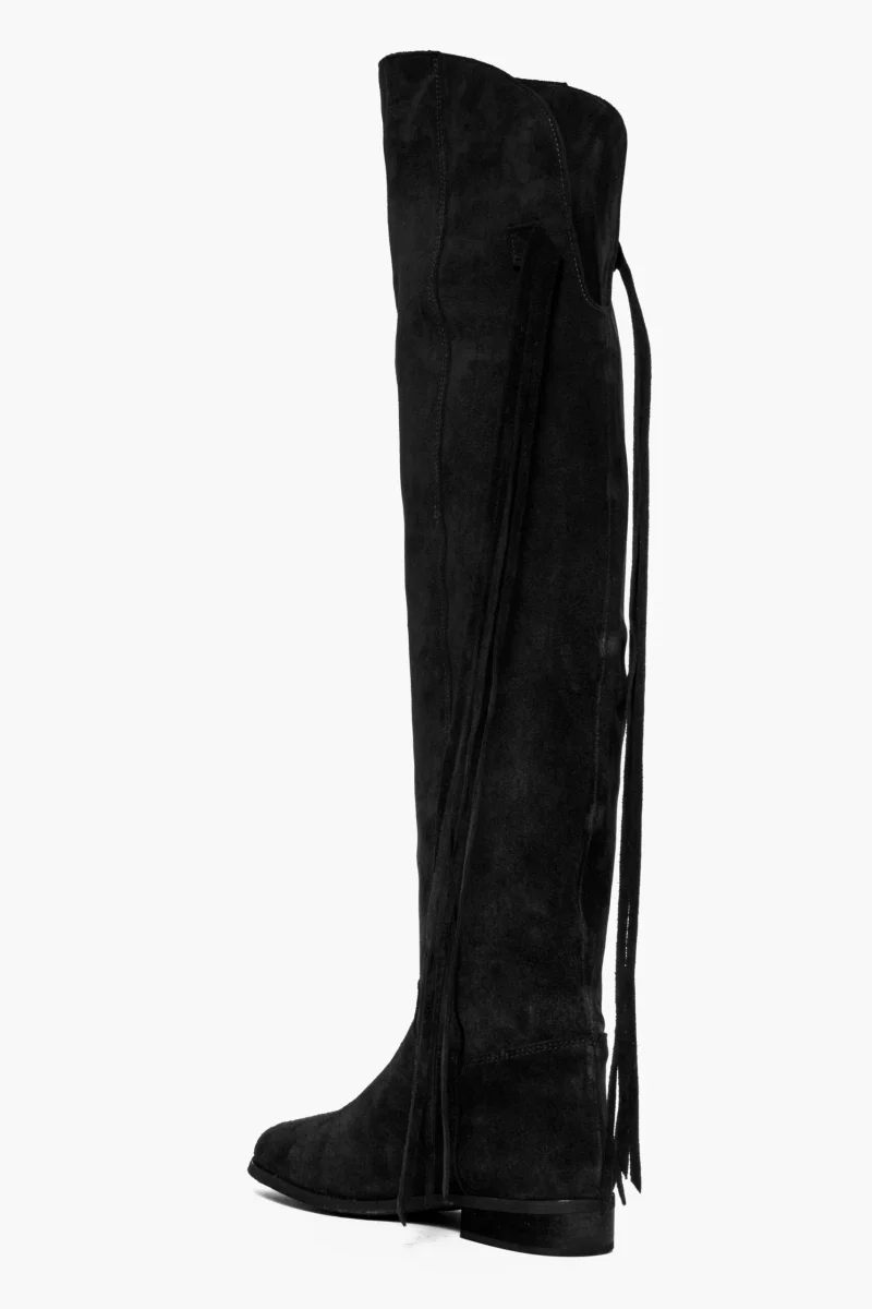 Stivali alti, modello 273, in camoscio nero con lacci pendenti sul retro, interni e sottopiede in similpelle, tacco 3 cm. Calzata regolare. Calzature realizzate artigianalmente, rigorosamente made in Italy.