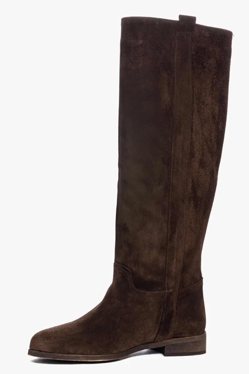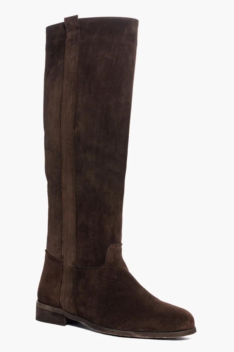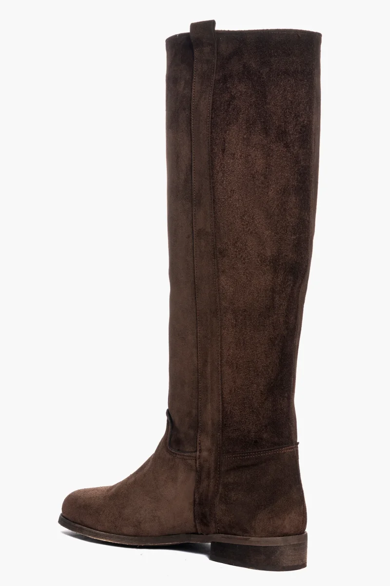 Stivali sotto al ginocchio in camoscio cioccolato, privo di cerniera, tubolare alla gamba, interni e sottopiede in similpelle. Calzata regolare, suola nel colore neutra spazzolata marrone, tacco 3-4 cm, per chi ha la mezza misura è consigliato non prendere il numero in più. Calzature realizzate artigianalmente, rigorosamente made in Italy.