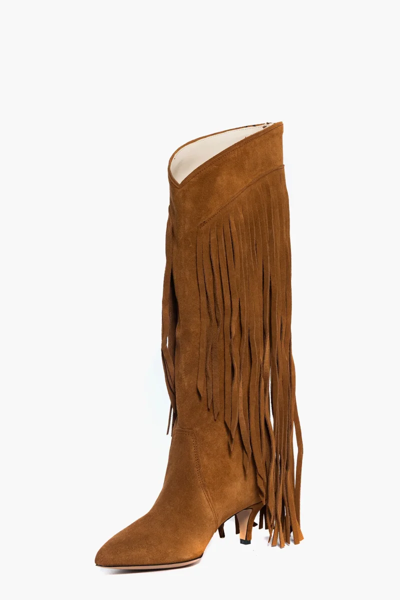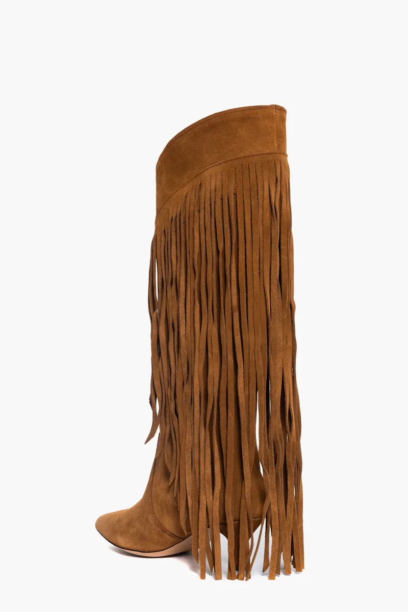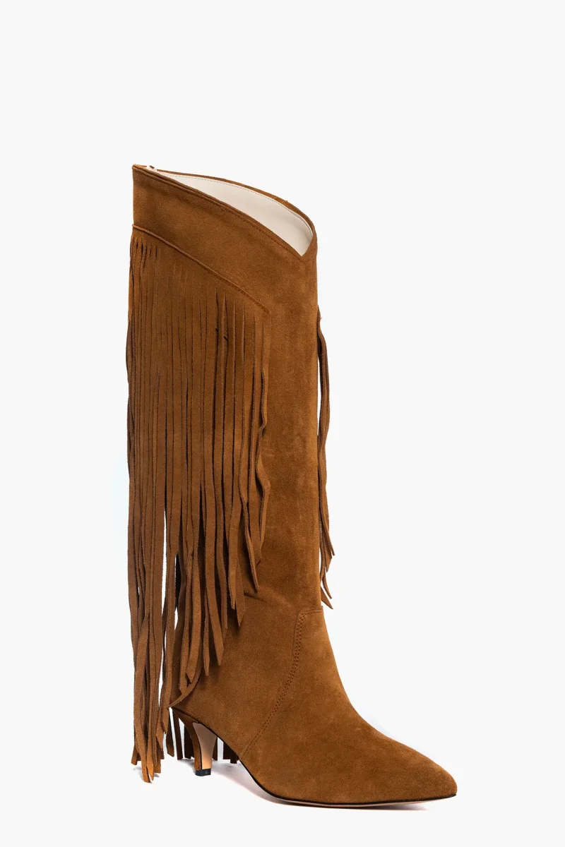 Stivali con frange lungo il gambale, in camoscio cuoio. Tacco rivestito, punta stretta, tacco altezza 6 cm, interni e sottopiede in similpelle. Calzata giusta, punta stretta, privo di cerniera. Calzature realizzate in modo artigianale, rigorosamente Made in Italy.