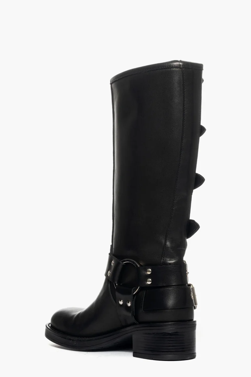 Stivali Megan 1348 in pelle nera con fibbie lungo il gambale e accessorio alla caviglia in argento, con punta quadrata, interni e sottopiede in similpelle, tacco 6 cm. Calata regolare. Calzature realizzate artigianalmente, rigorosamente Made in Italy.