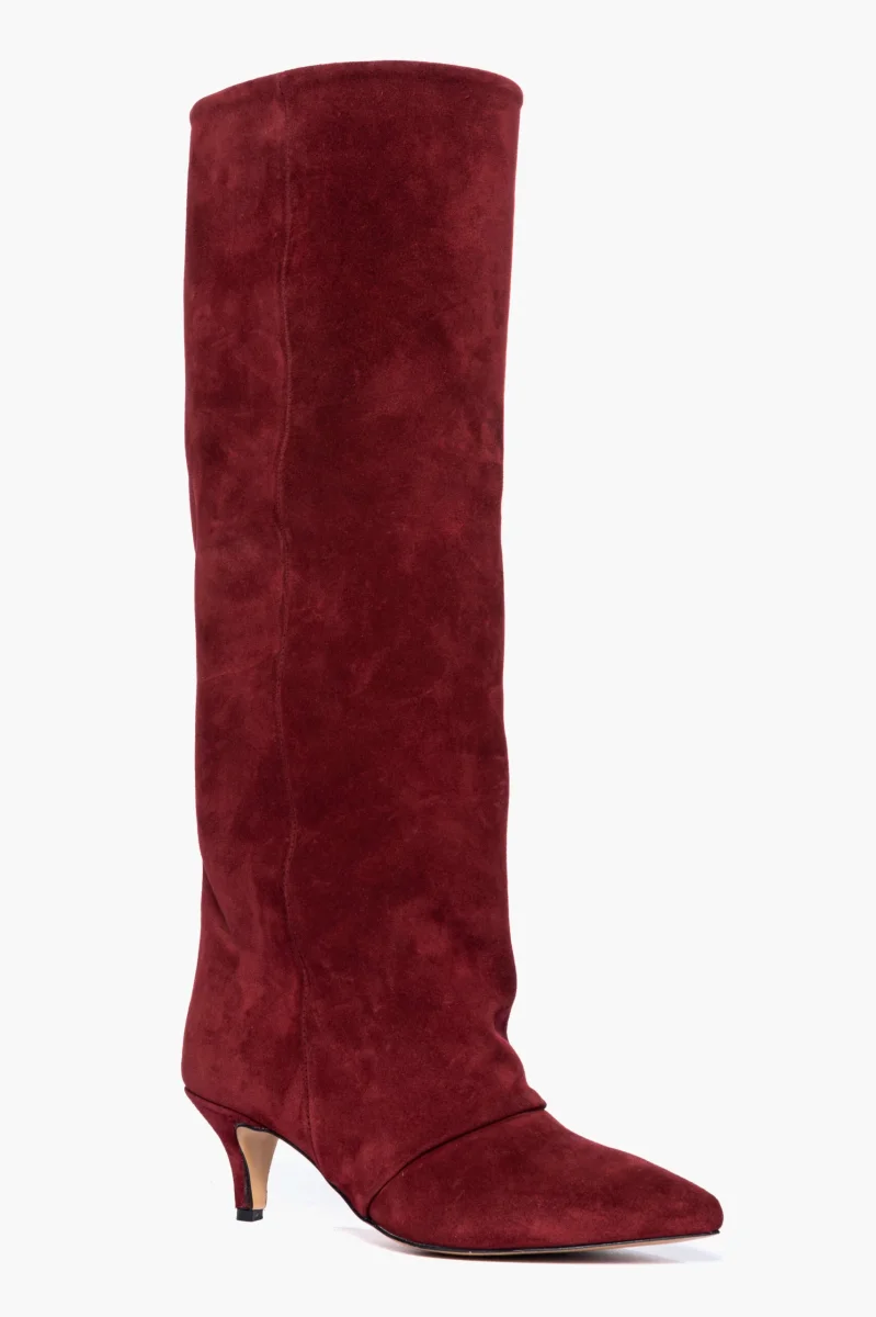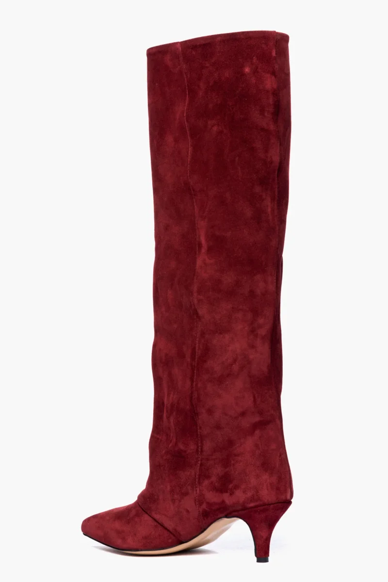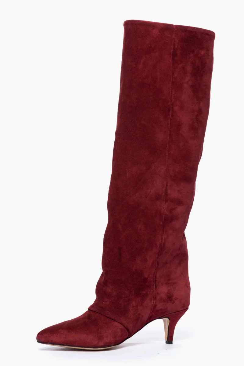 Stivale in camoscio bordeaux, leggermente aggrappato in avanti, interni e sottopiede in similpelle, privo di cerniera, tacco rivestito, altezza 6 cm. Calzano giuste, punta stretta. Calzature realizzate in modo artigianale, rigorosamente Made in Italy.
