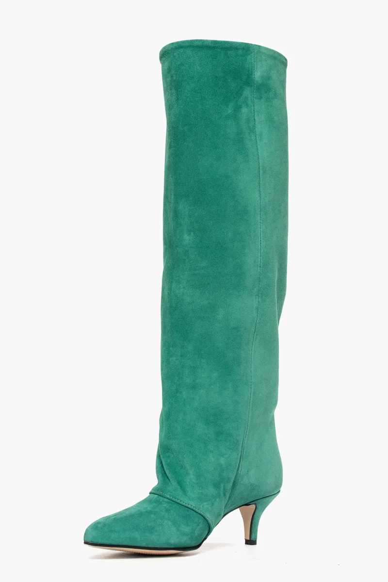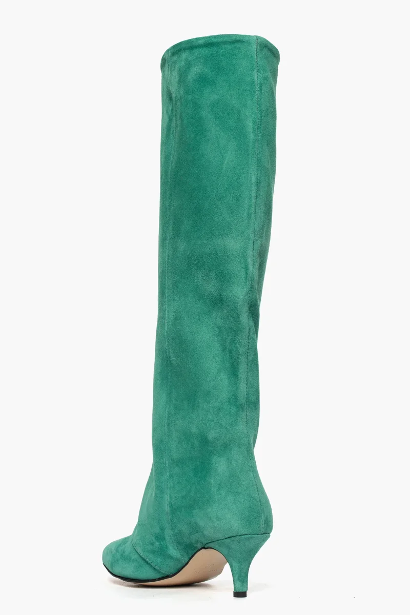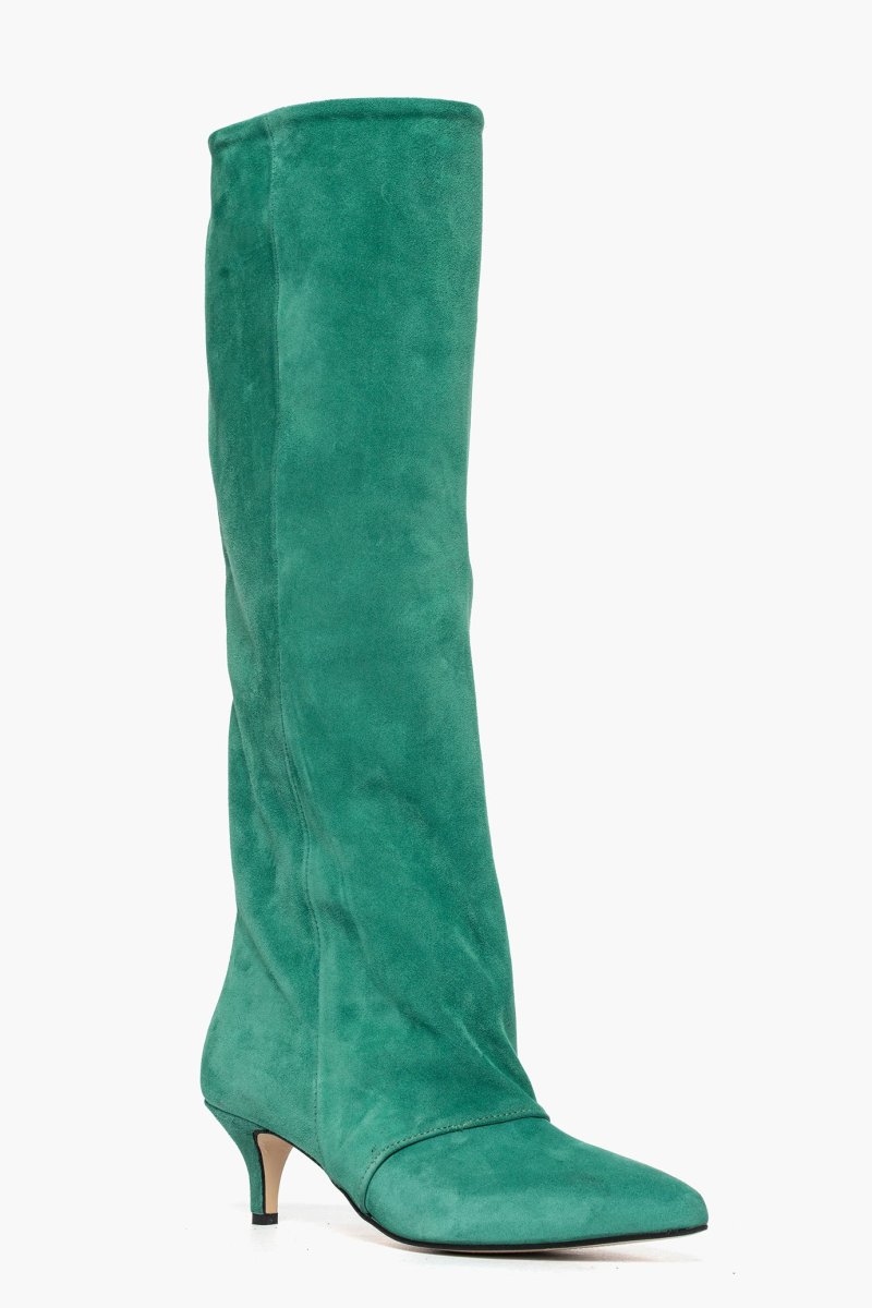 Stivale in camoscio verde prato, leggermente aggrappato in avanti, interni e sottopiede in similpelle, privo di cerniera, tacco rivestito, altezza 6 cm. Calzano giuste, punta stretta. Calzature realizzate in modo artigianale, rigorosamente Made in Italy.