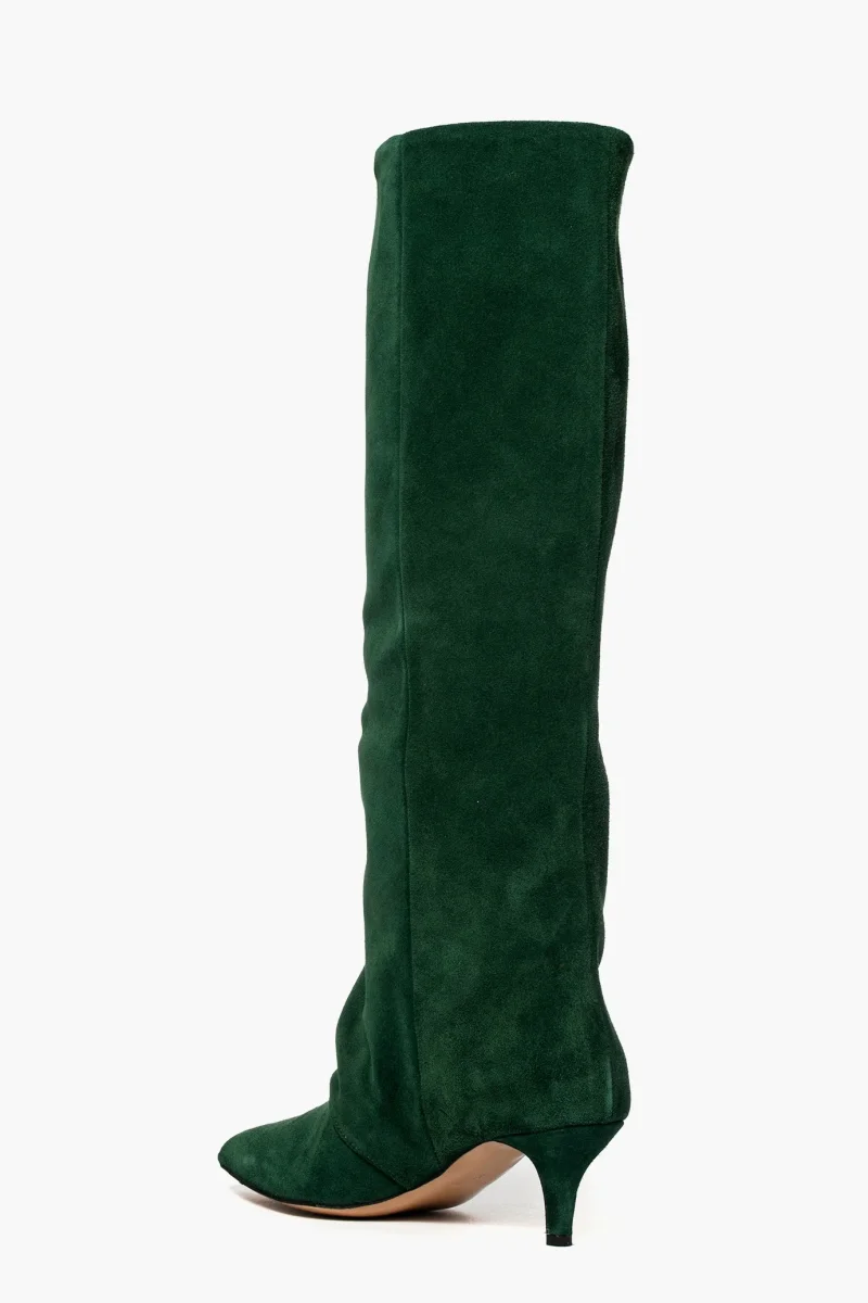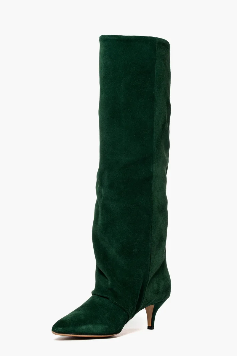Stivale in camoscio verde, leggermente aggrappato in avanti, interni e sottopiede in similpelle, privo di cerniera, tacco rivestito, altezza 6 cm. Calzano giuste, punta stretta. Calzature realizzate in modo artigianale, rigorosamente Made in Italy.