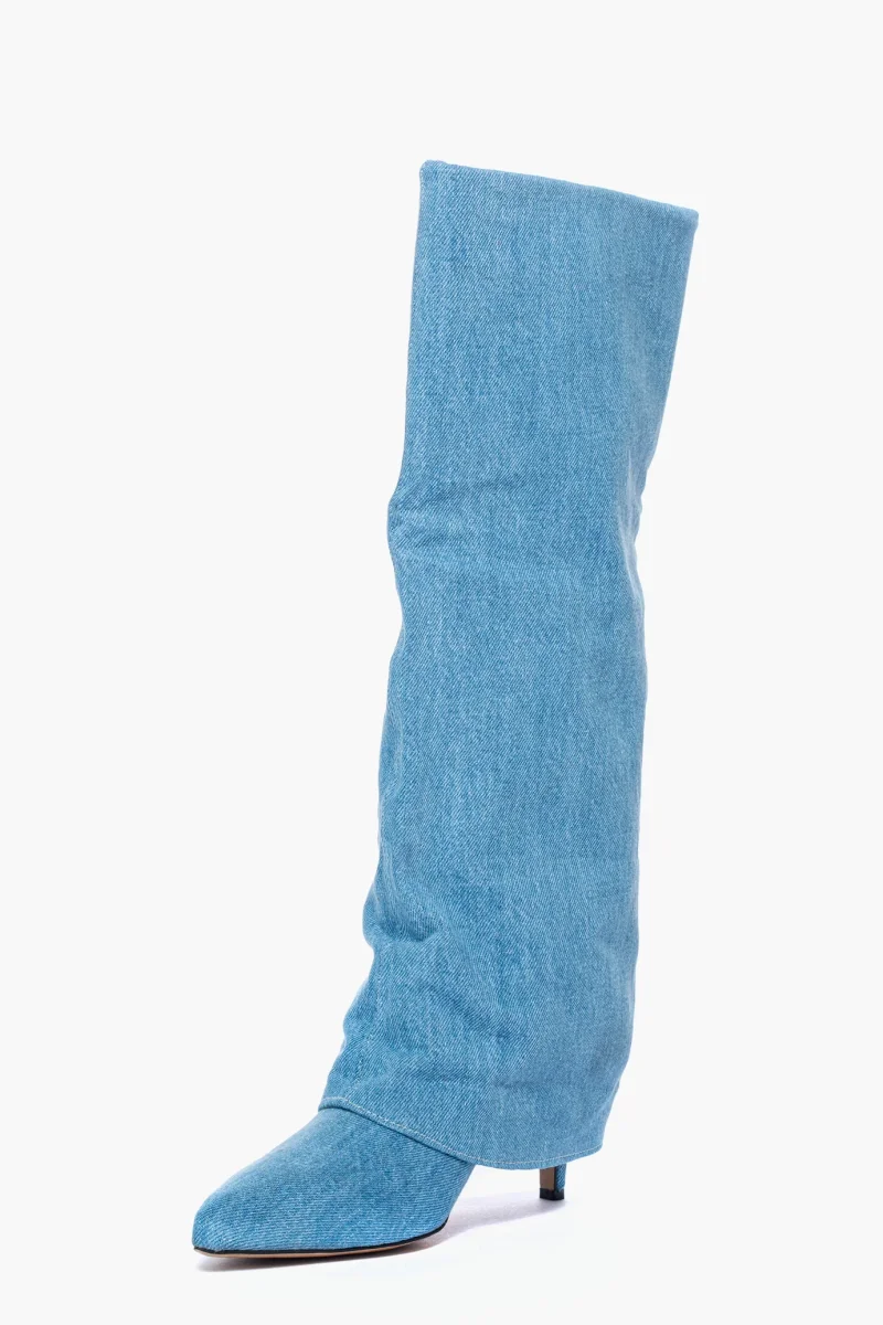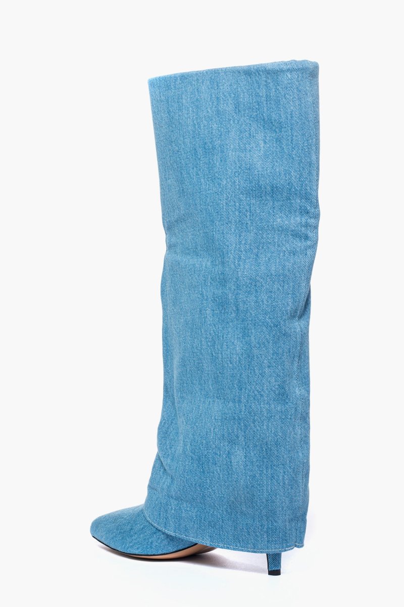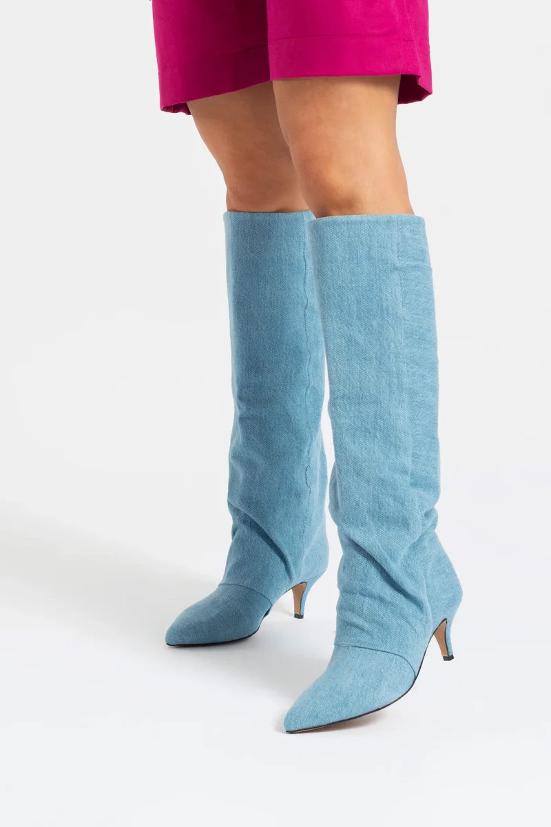 Stivale in jeans chiaro con risvolto leggermente aggrappato in avanti, interni e sottopiede in similpelle, privo di cerniera, tacco rivestito, altezza 6-7 cm. Calzano giuste, punta stretta. Calzature realizzate in modo artigianale, rigorosamente Made in Italy.