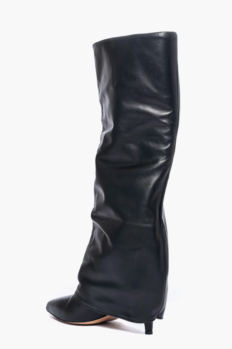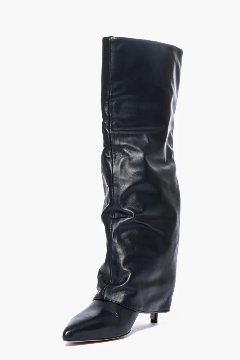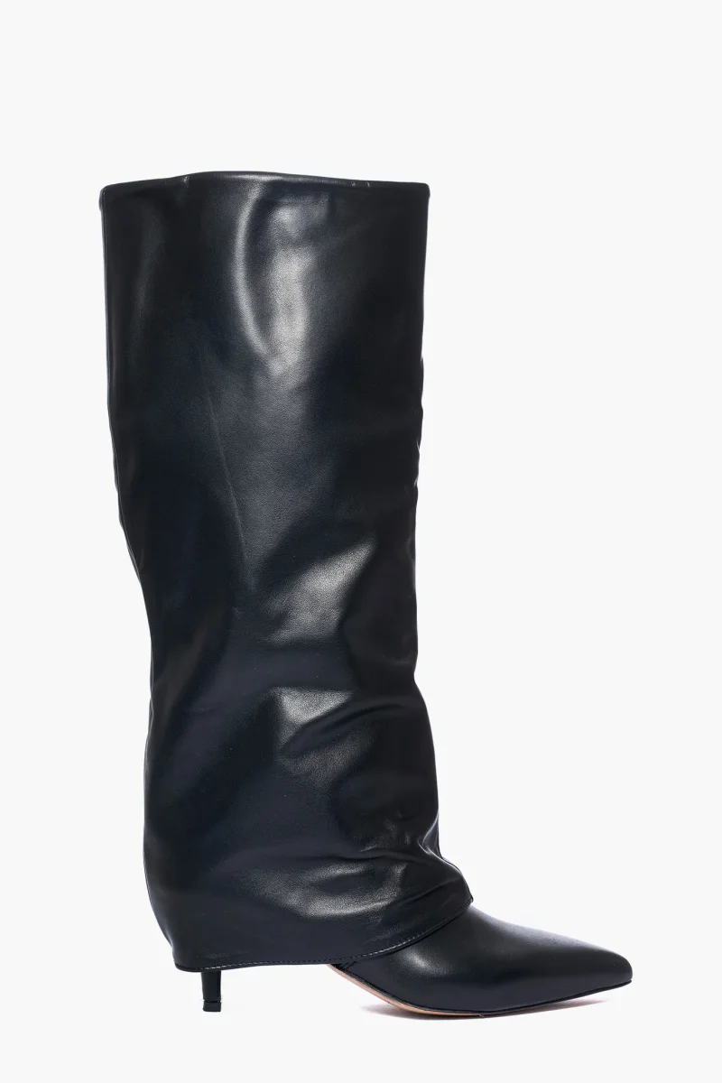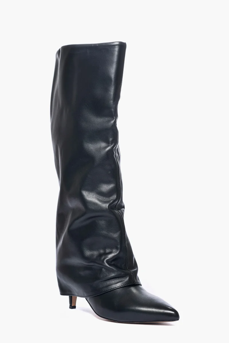 Stivale in pelle nera con risvolto leggermente aggrappato in avanti, interni e sottopiede in similpelle, privo di cerniera, tacco rivestito, altezza 6-7 cm. Calzano giuste, punta stretta. Calzature realizzate in modo artigianale, rigorosamente Made in Italy.