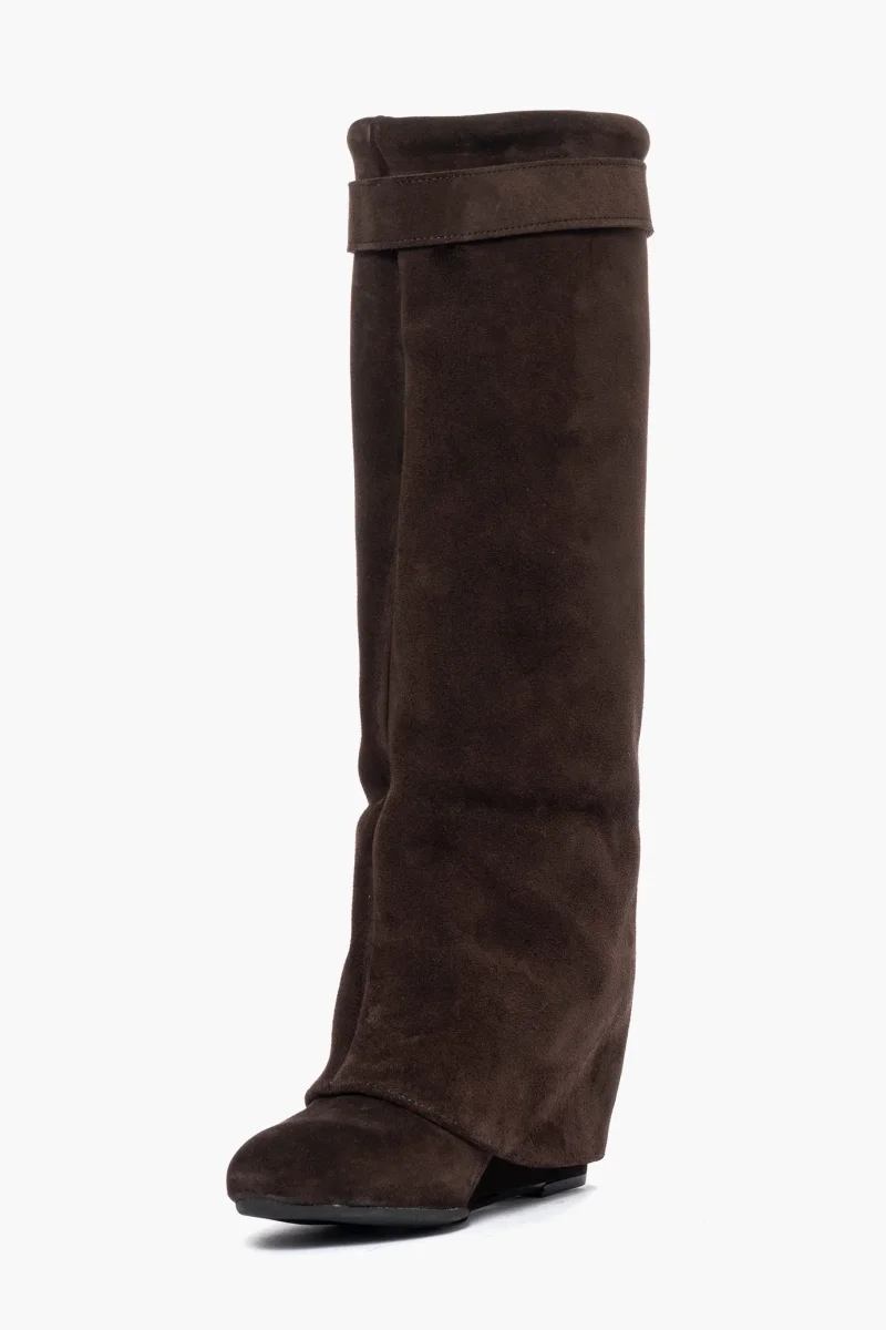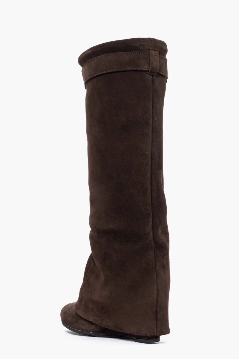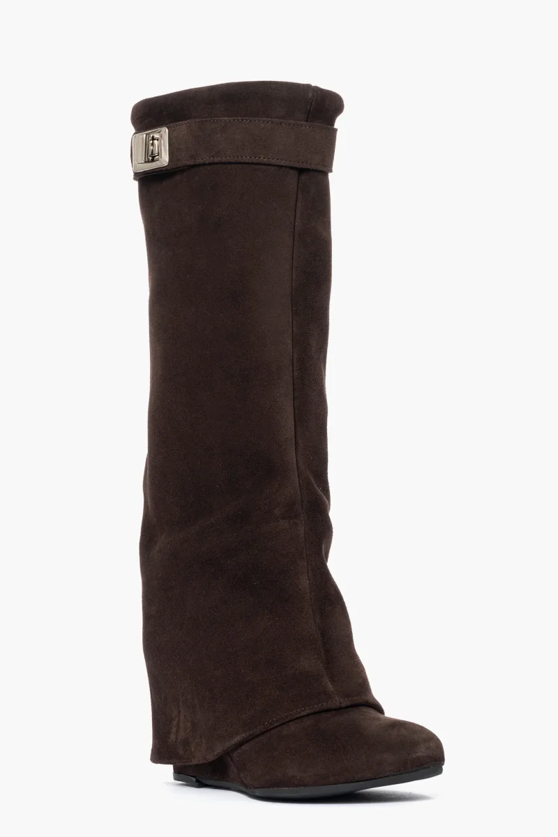 Stivali sotto al ginocchio in camoscio cioccolato con risvolto e zeppa rivestita in camoscio cioccolato, altezza 7/8 cm. Interni e sottopiede in similpelle, cintura con accessori in colore argento. Calzature realizzate artigianalmente, rigorosamente made in Italy.