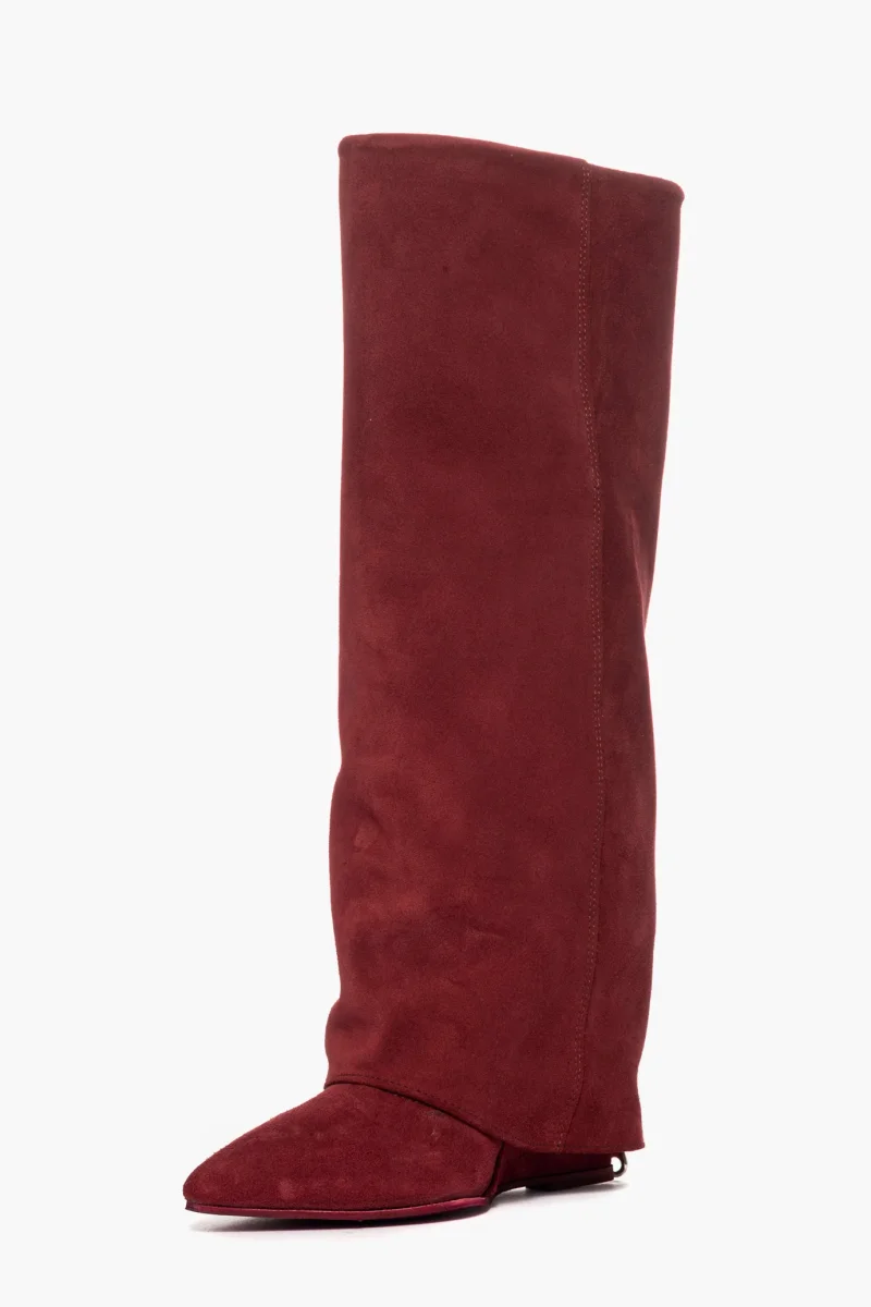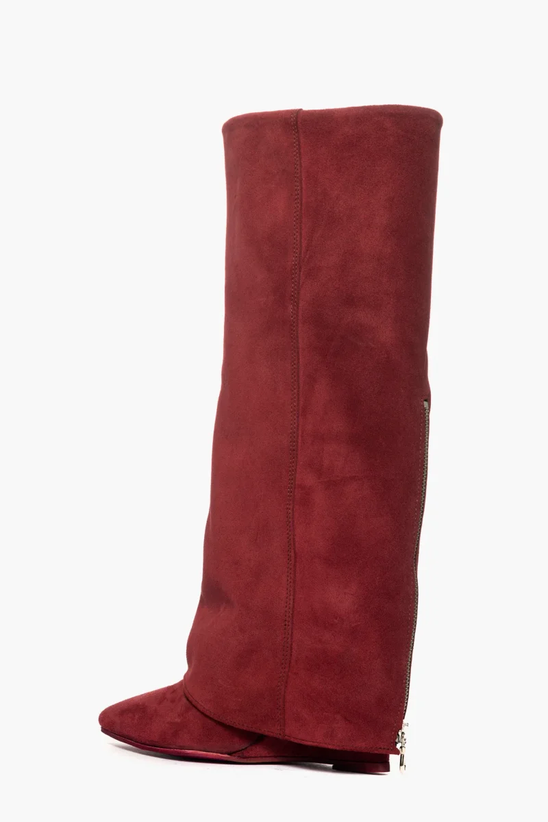 Stivali con risvolto lungo il gambale in camoscio bordeaux, altezza sotto al ginocchio, con zeppa rivestita, altezza 11, interni in similpelle, sulla parte posteriore cerniera. Calzano regolari, punta stretta in avanti.