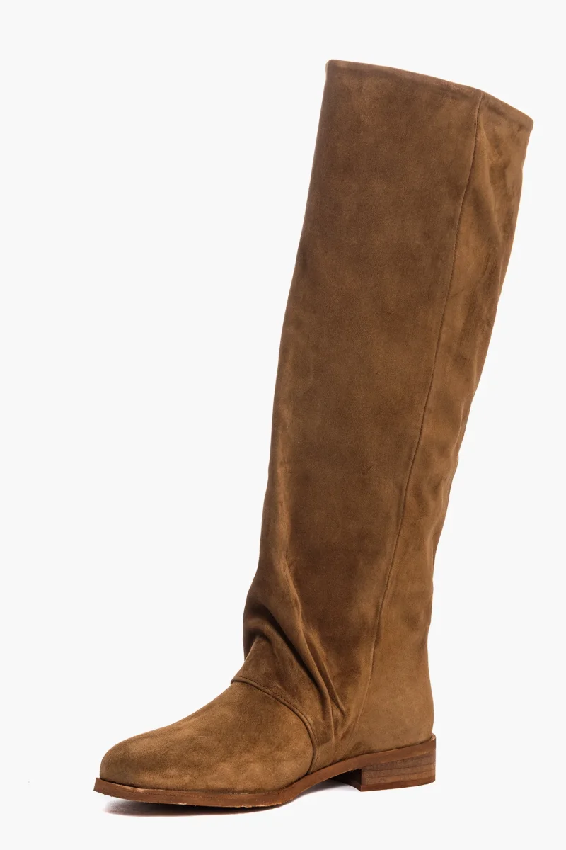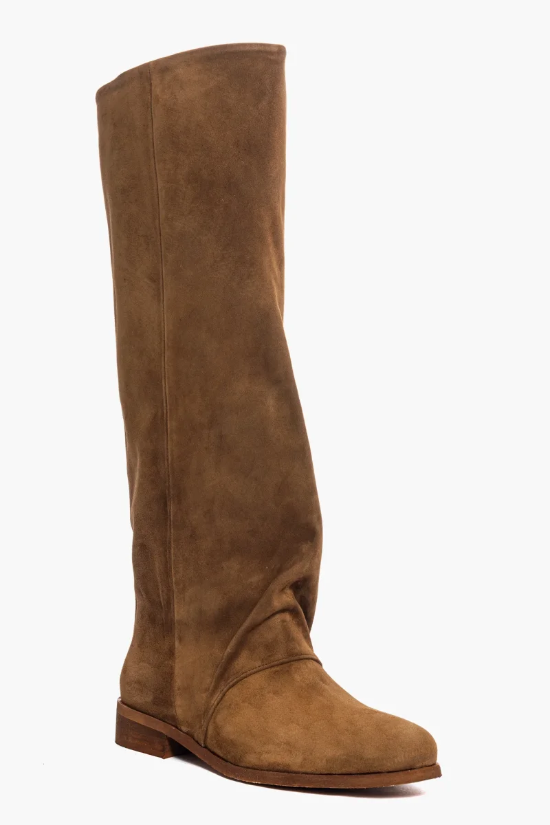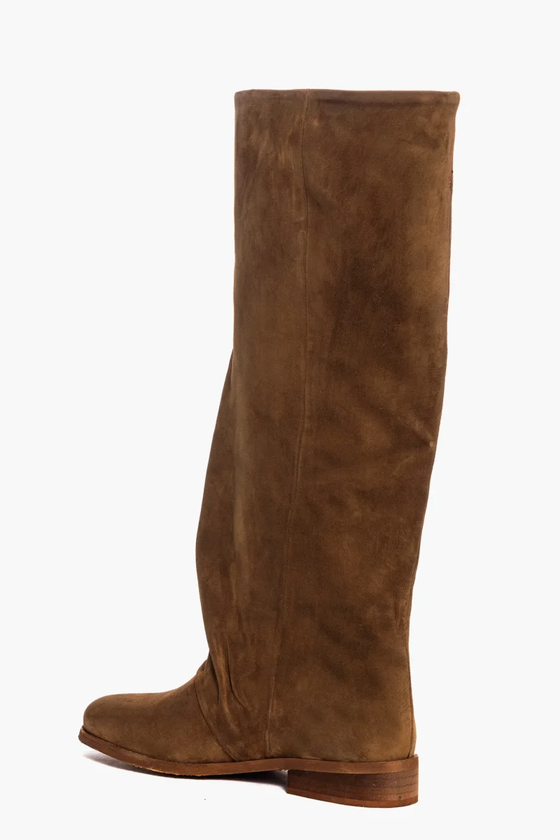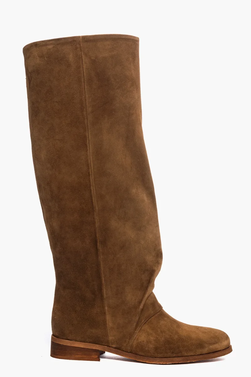 Stivali sotto al ginocchio in camoscio cuoio, aggrappato alla caviglia, suola spazzolato cuoio, tacco 3, interni in similpelle.