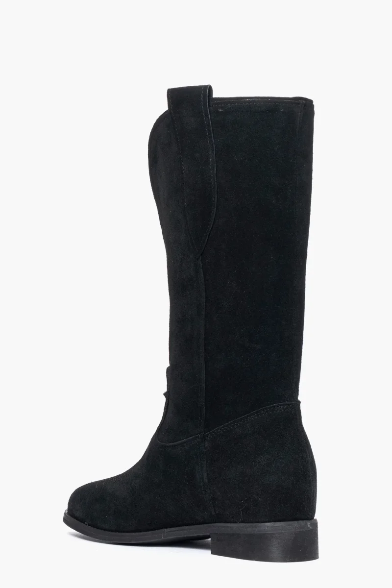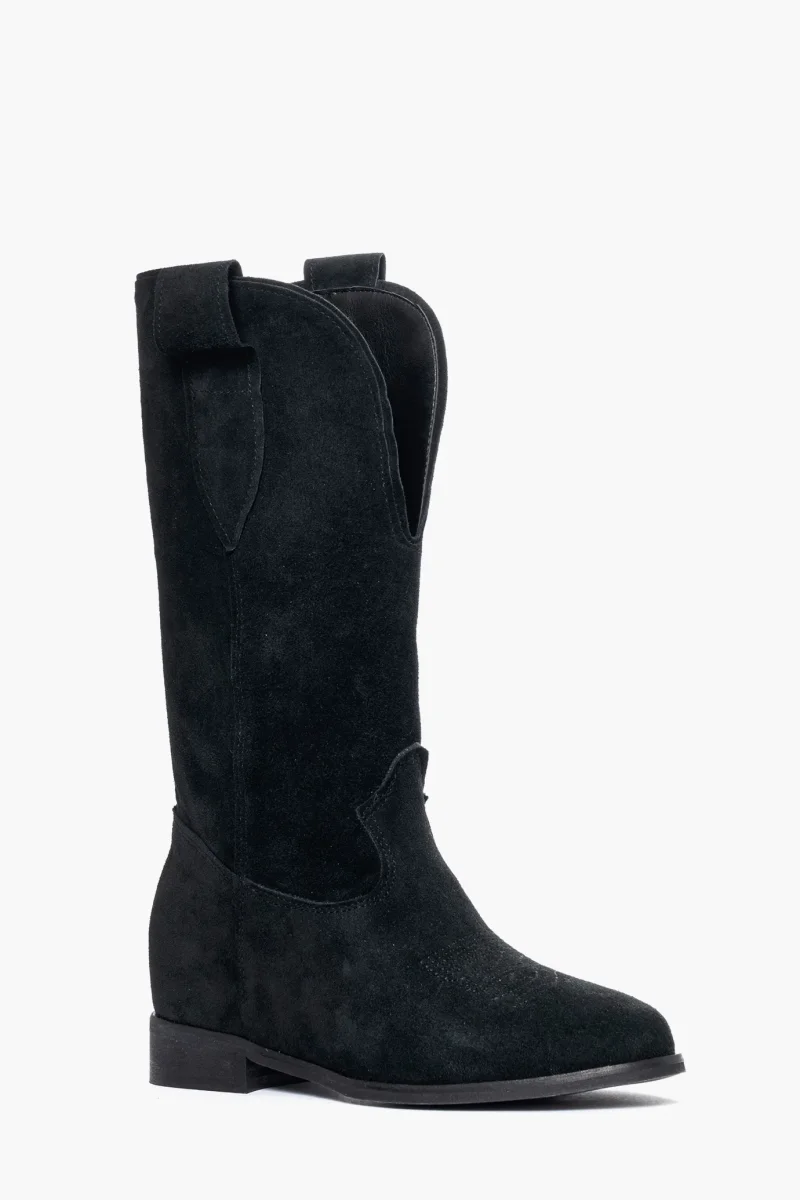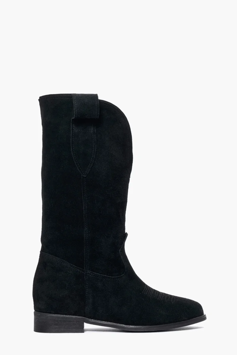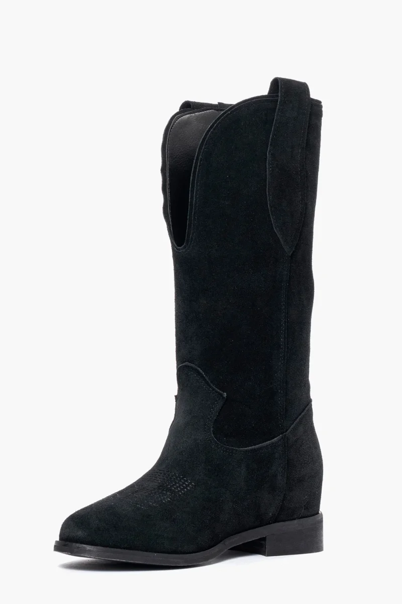 Stivali in camoscio nero con rialzo interno di 3 cm con ricamo in punta e scollo 288, interni e sottopiede in similpelle, altezza tacco esterno 3, punta leggermente più tonda dei nostri texani soliti. Calzano regolari. Calzature realizzate artigianalmente, rigorosamente made in Italy.