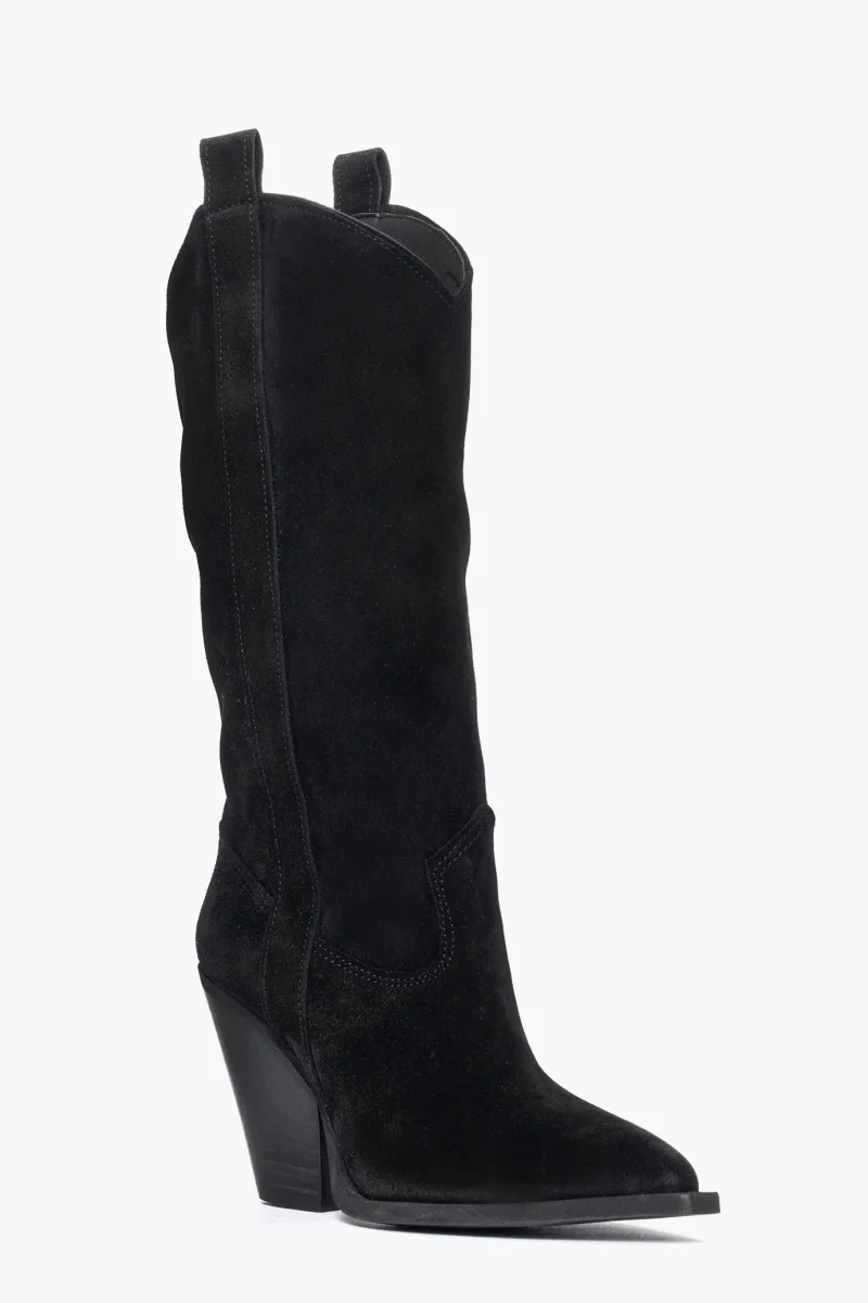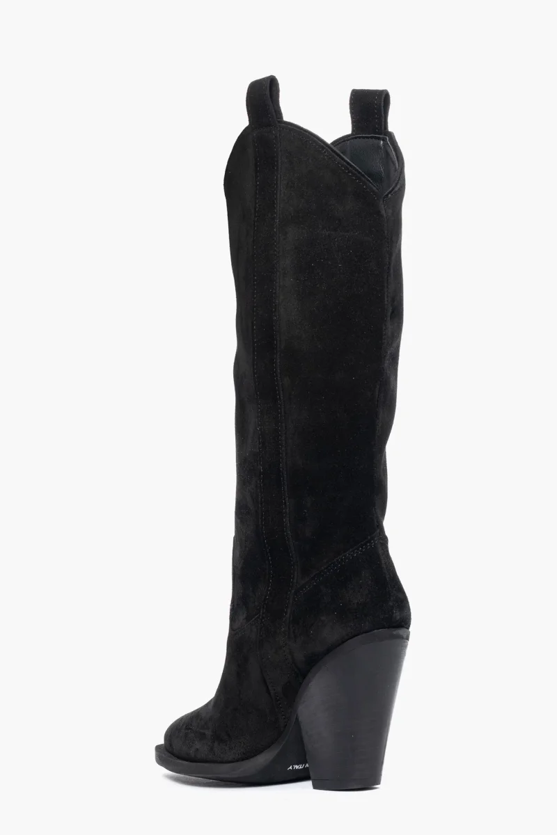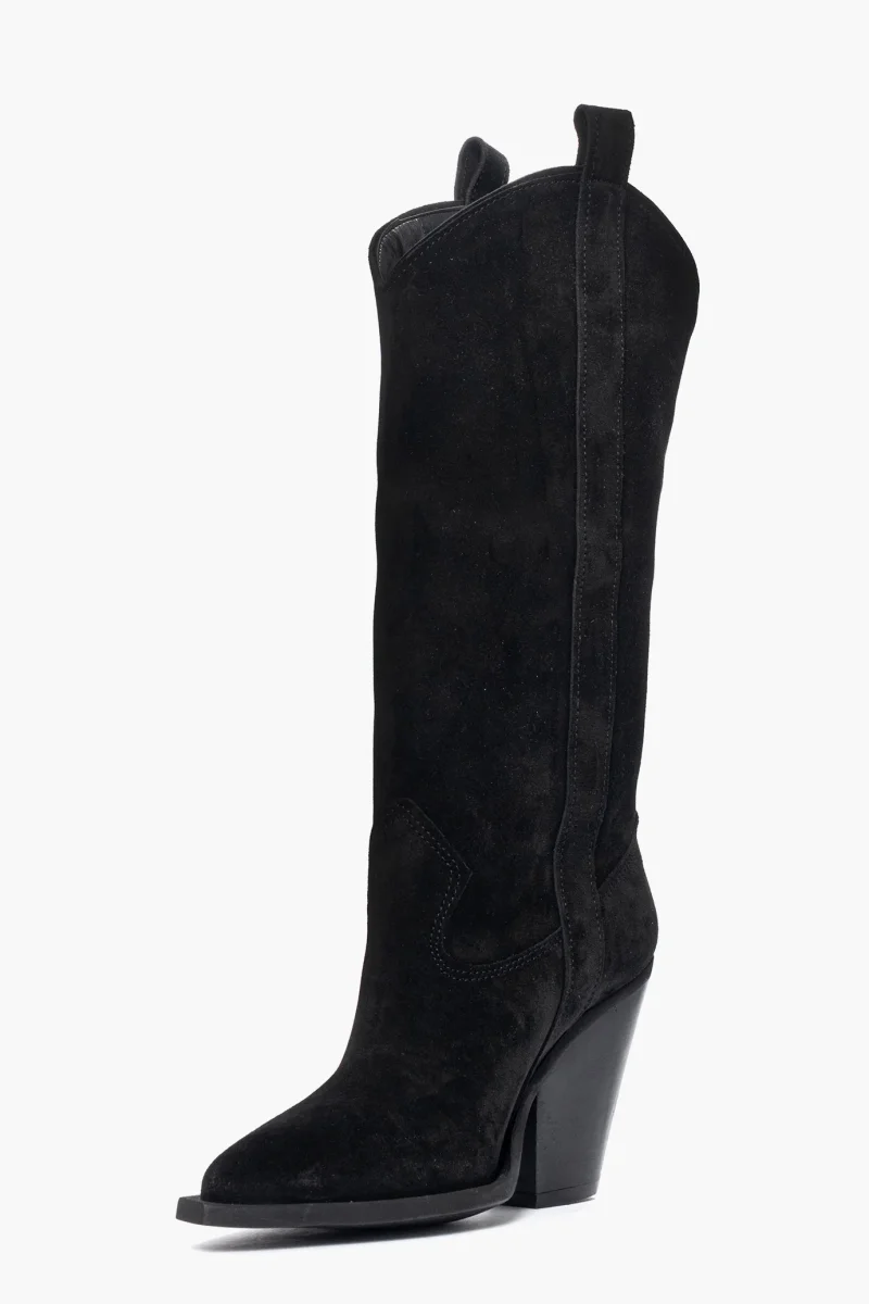Stivali al polpaccio in camoscio nero, spazzolato a mano, punta leggermente stretta ma calzano comodi, taglia italiana, interni e sottopiede in similpelle, tacco 8 cm. Calzature realizzate artigianalmente, rigorosamente made in Italy.