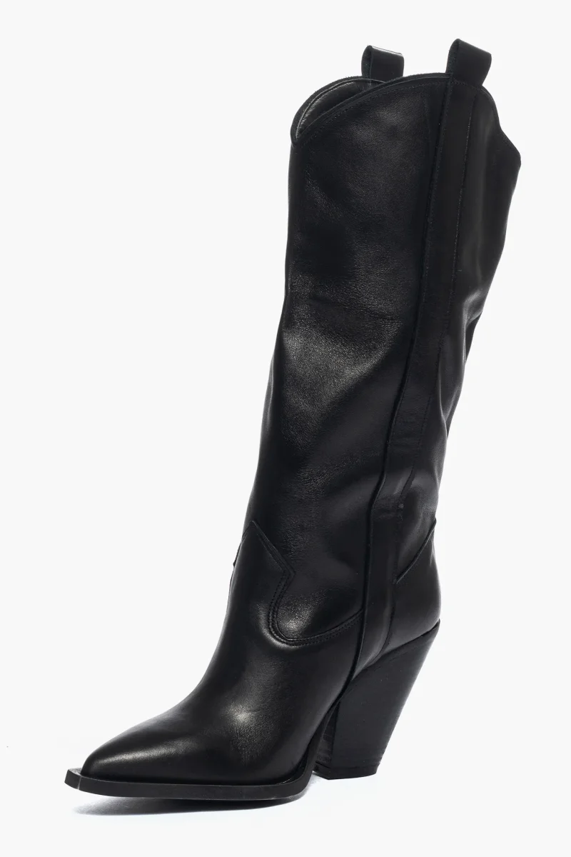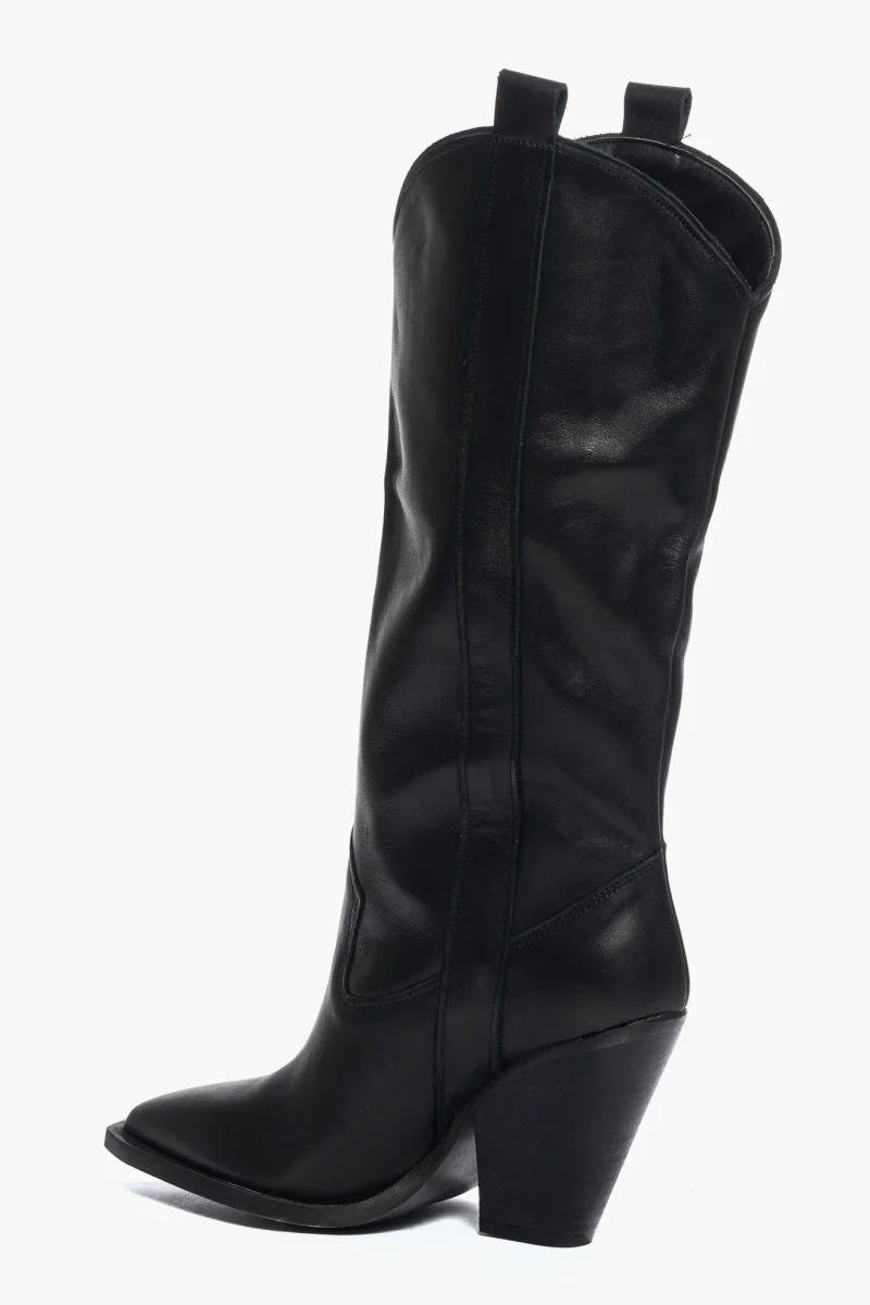 Stivali sotto al ginocchio in pelle nero, spazzolato a mano, punta leggermente stretta ma calzano regolari, interni e sottopiede in similpelle, tacco altezza 9, nel colore nero spazzolato, privo di cerniera, forma texana. Calzature realizzate in modo artigianale, rigorosamente Made in Italy.