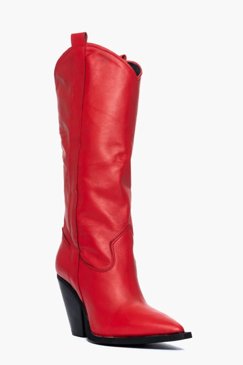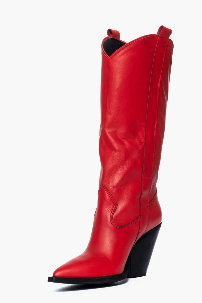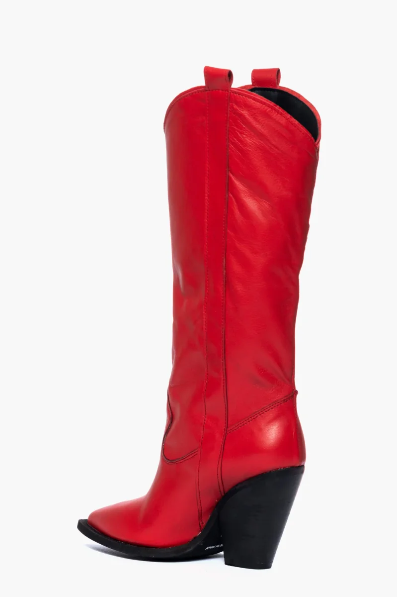 Stivali al polpaccio in pelle rosso, spazzolato a mano, punta leggermente stretta ma calzano comodi, taglia italiana, interni e sottopiede in similpelle, tacco 8 cm. Calzature realizzate artigianalmente, rigorosamente made in Italy.