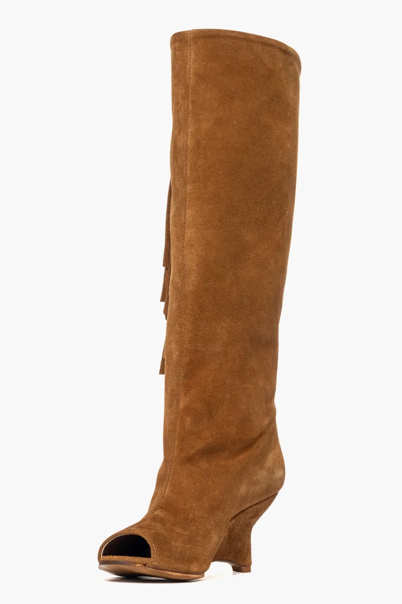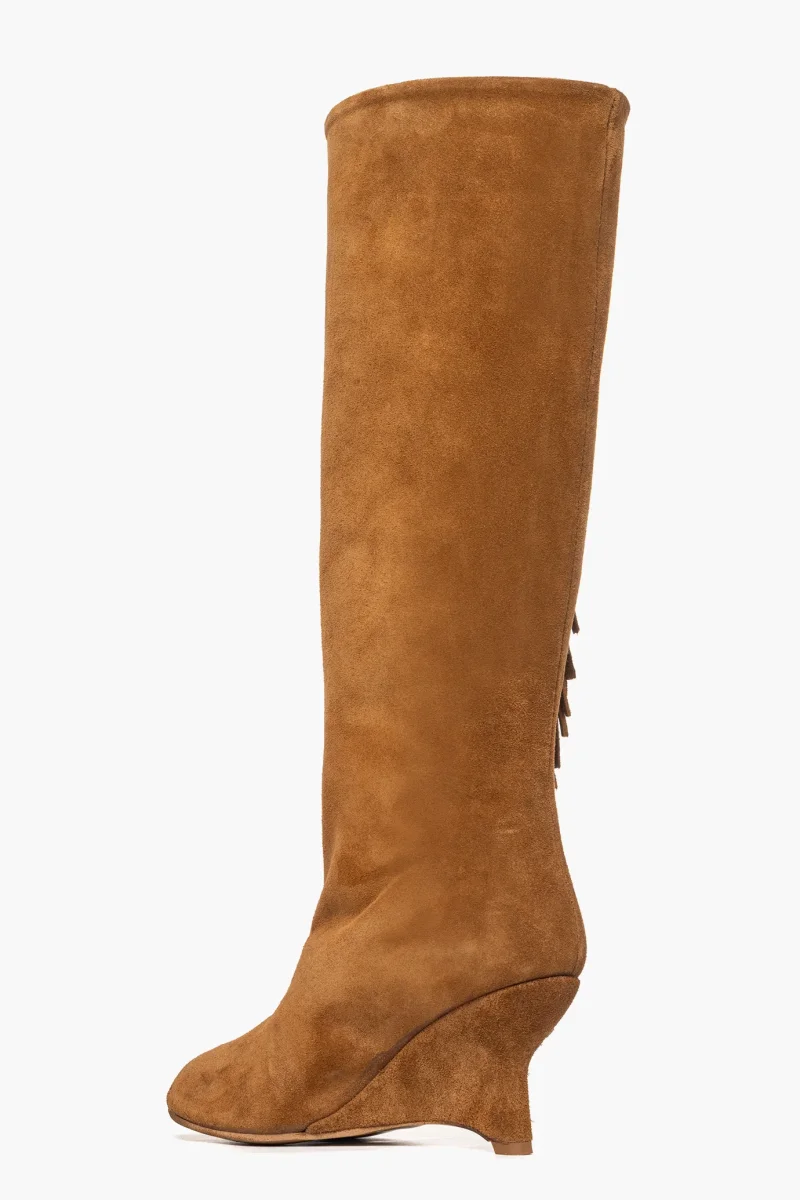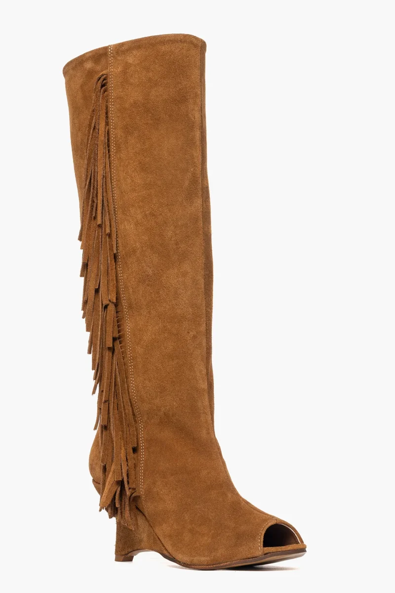 Stivale in camoscio cuoio con frange, sotto al ginocchio, con zeppa rivestita, da una forma particolare, 8cm, interni in similpelle, spuntato in avanti, privo di cerniera. Calzano regolari, calzature artigianali, made in Italy.