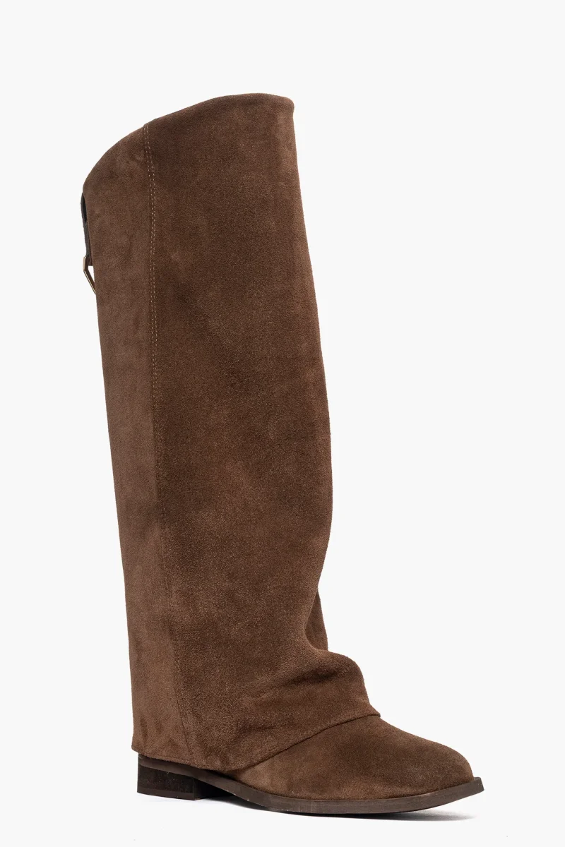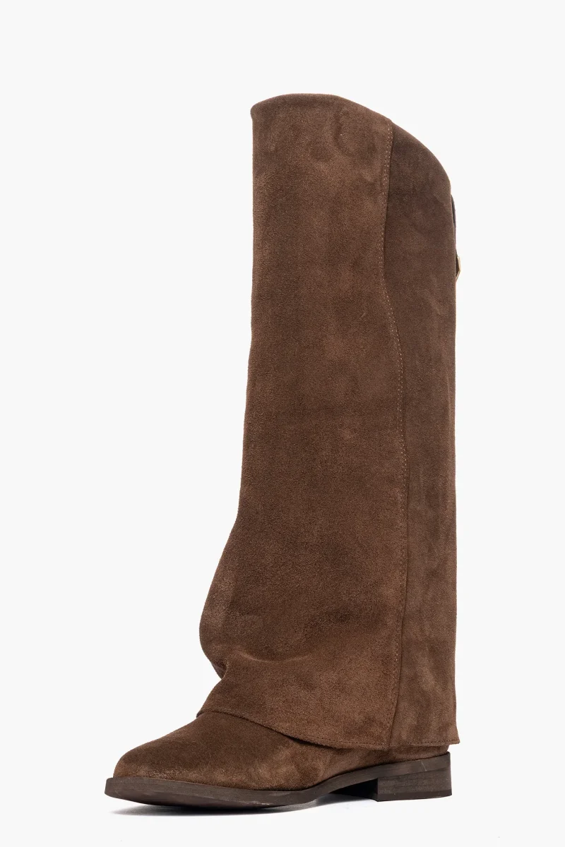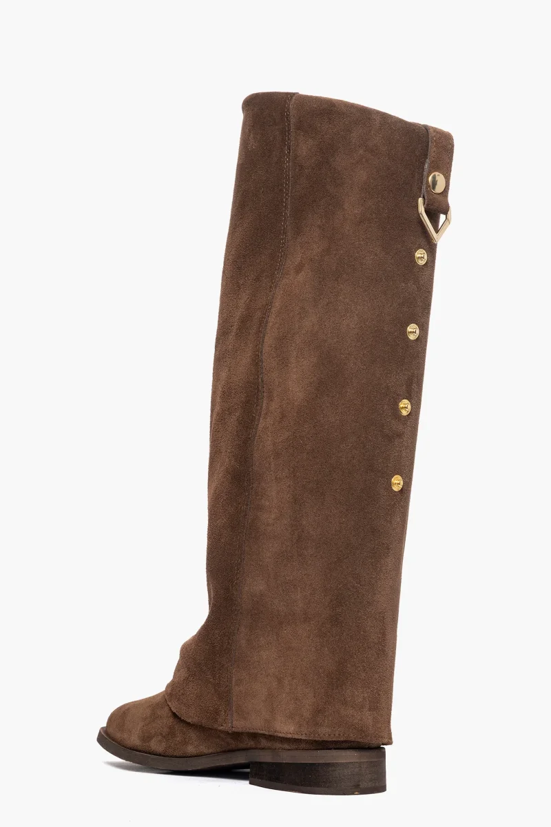 Stivale con rialzo e risvolto in camoscio testa di moro, con cintura nella parte posteriore con aggancio con clip, non removibile, accessori nel colore oro, altezza 8, interni e sottopiede in similpelle, calzano regolari, punta tonda. Calzature artigianali, made in Italy.