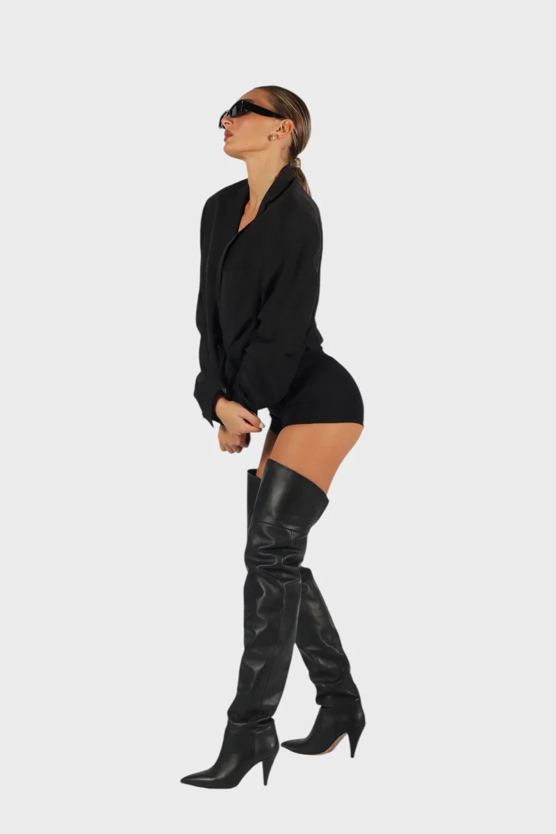 Stivali alti fino alla coscia (gambale alto circa 70 cm) Lara Park realizzati in pelle nero, Interno e sottopiede in similpelle, tacco rivestito, altezza 9 cm. Calzata giusta, punta stretta, taglia italiana. Calzature artigianali, made in Italy.